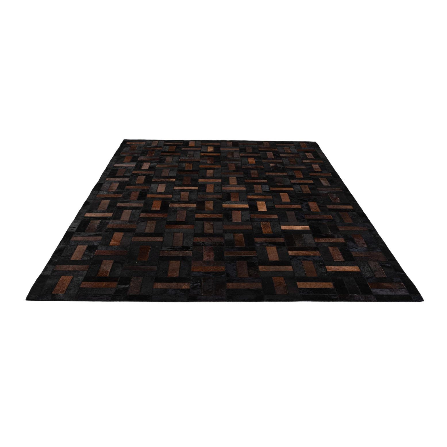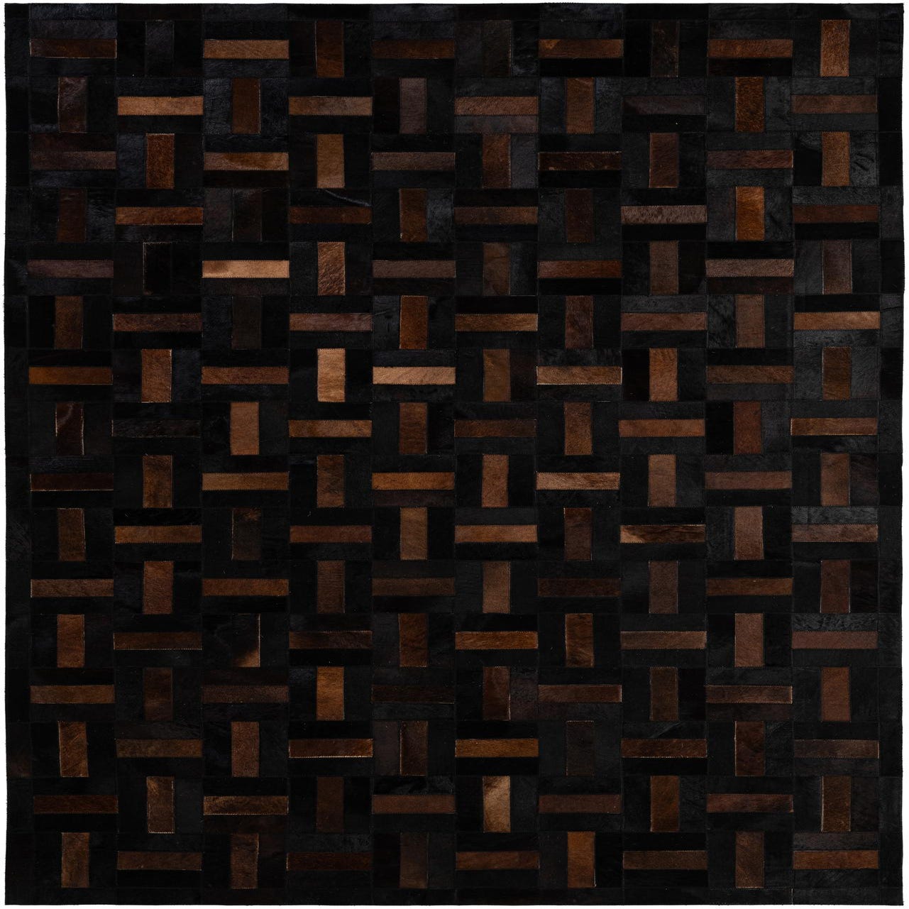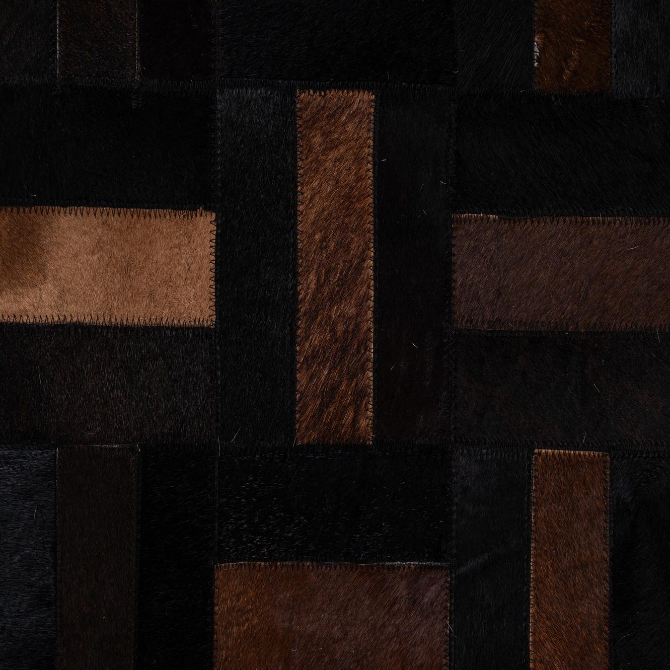 A 5x8 rectangular Cowhide Patchwork rug featuring a modern geometric pattern of varying brown and tan leather rectangles on a dark background.