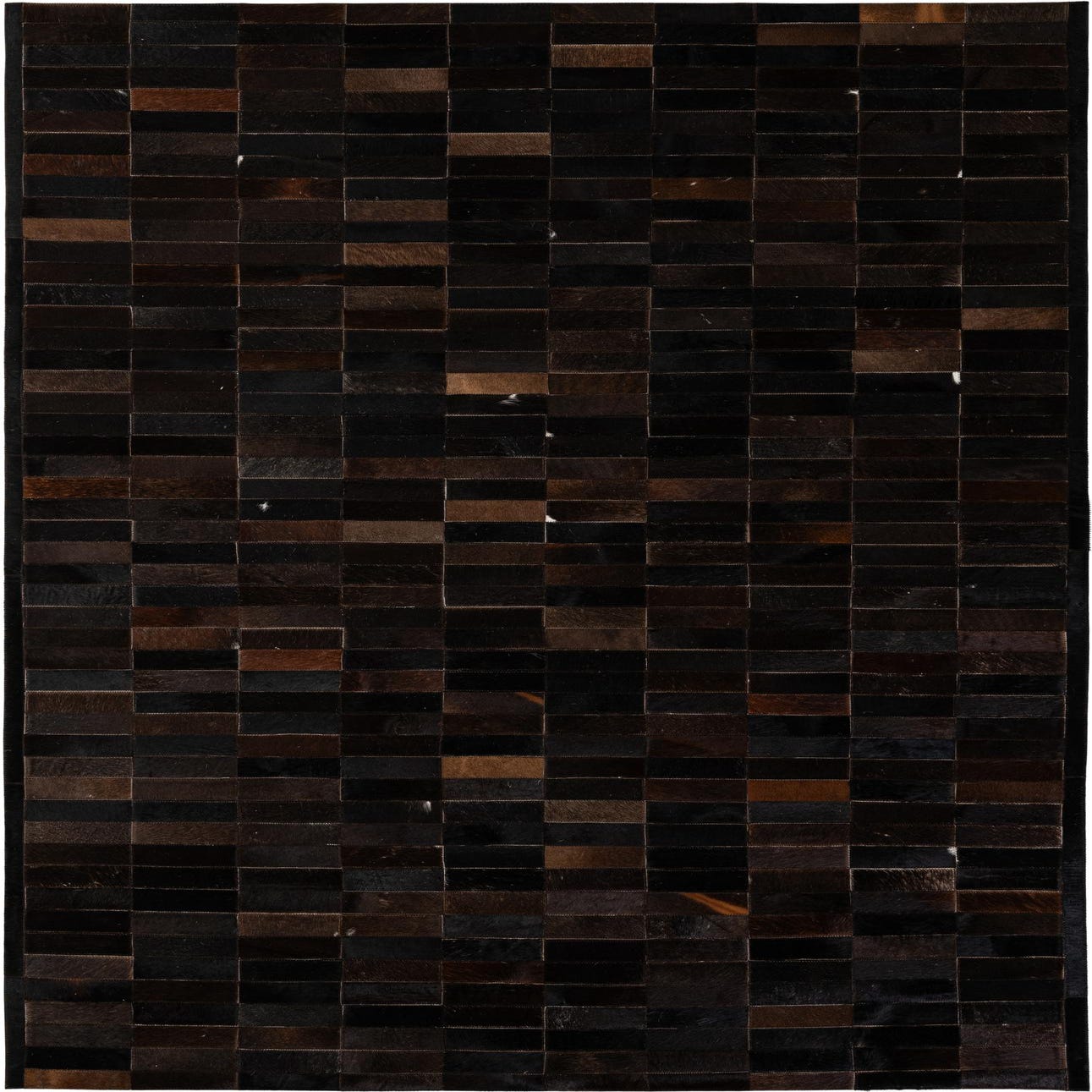 A rectangular 5x8 modern patchwork rug made from varying shades of brown and tan cowhide and leather strips.