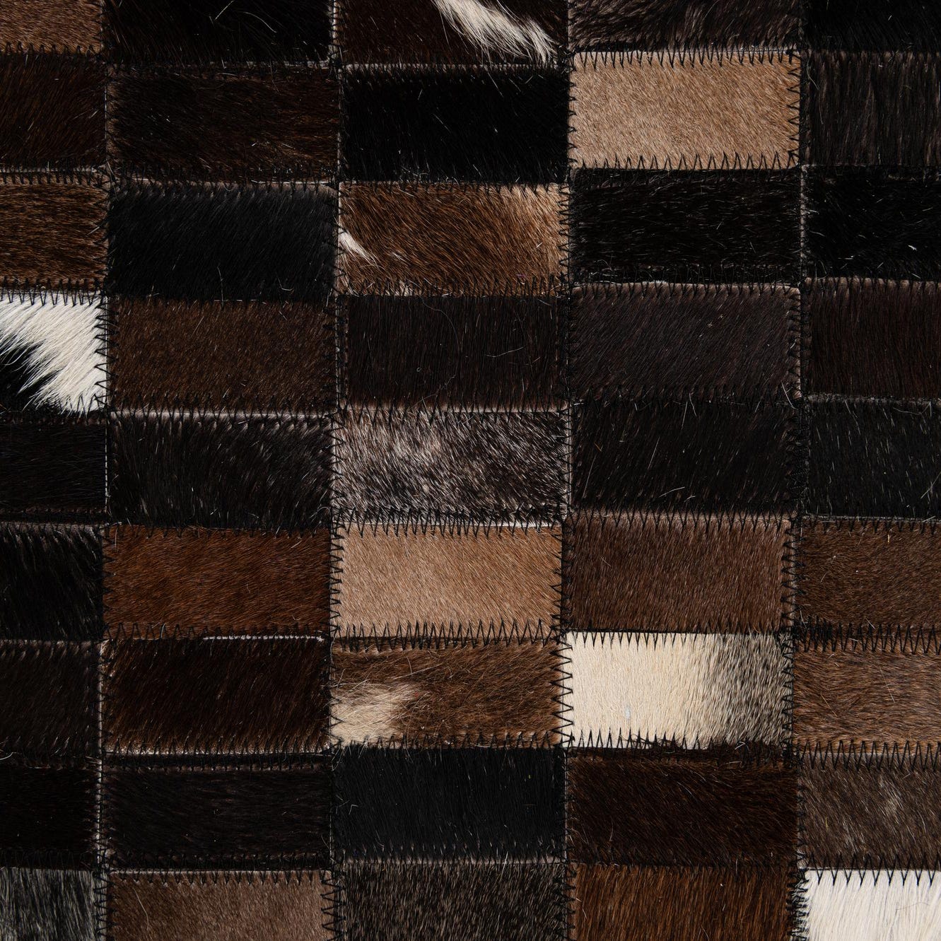 Handmade of cowhide and leather, this patchwork rug assembles narrow rectangular pieces into a tight, geometric mosaic. The background color is dark brown, accented by bands of black, brown, light brown and occasional ivory that create subtle rhythm and visual texture. The hair-on-hide surface has a low, slightly bristled pile with a natural sheen and the stitched seams lend a crisp grid that balances organic color variations with a modern, structured look.