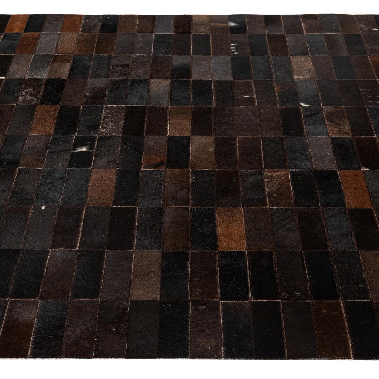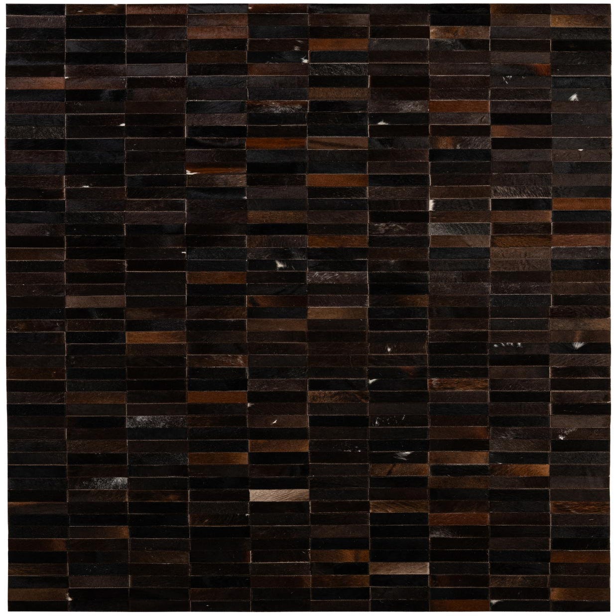 A 5x8 rectangular Cowhide Patchwork rug featuring a modern pattern of various brown and tan leather rectangles.