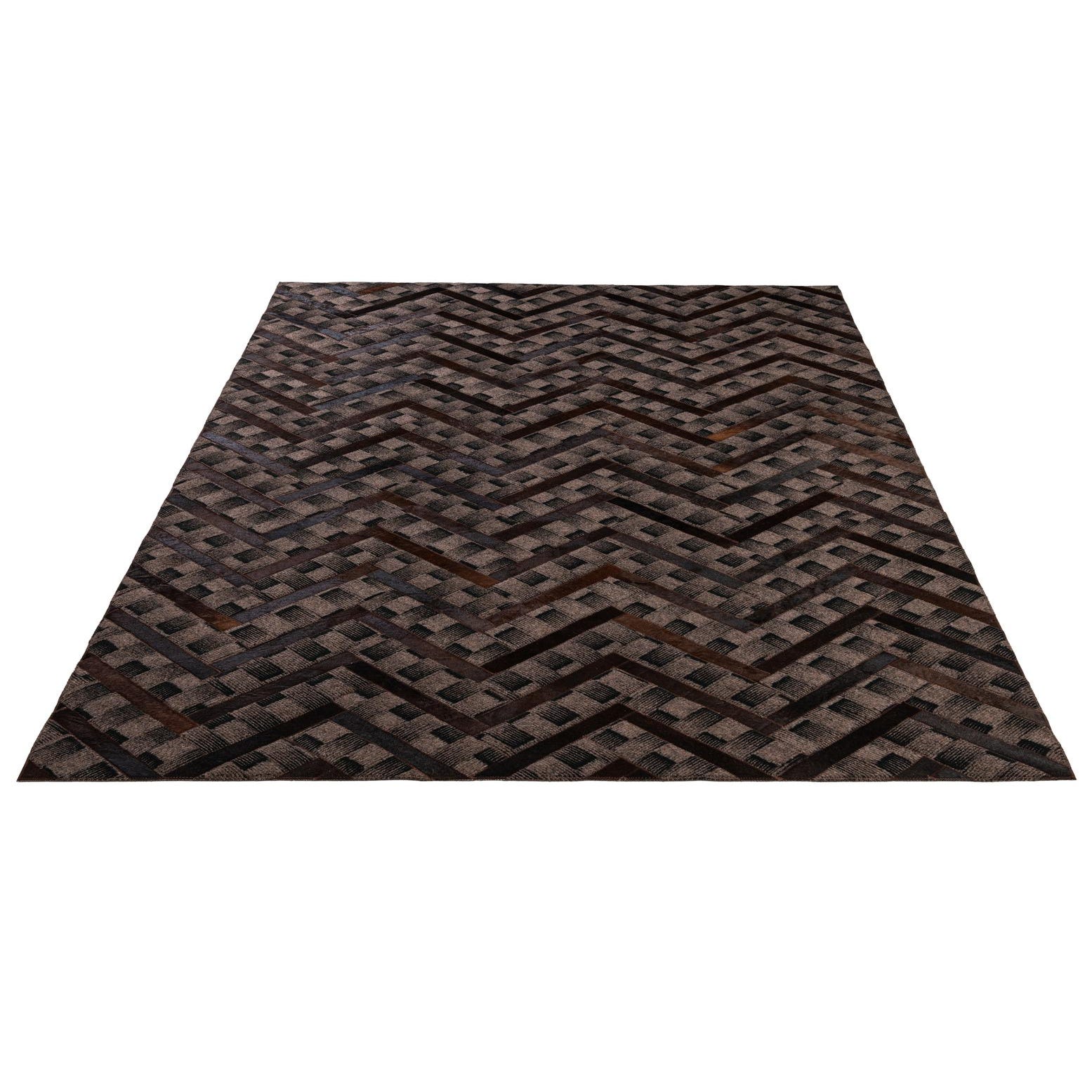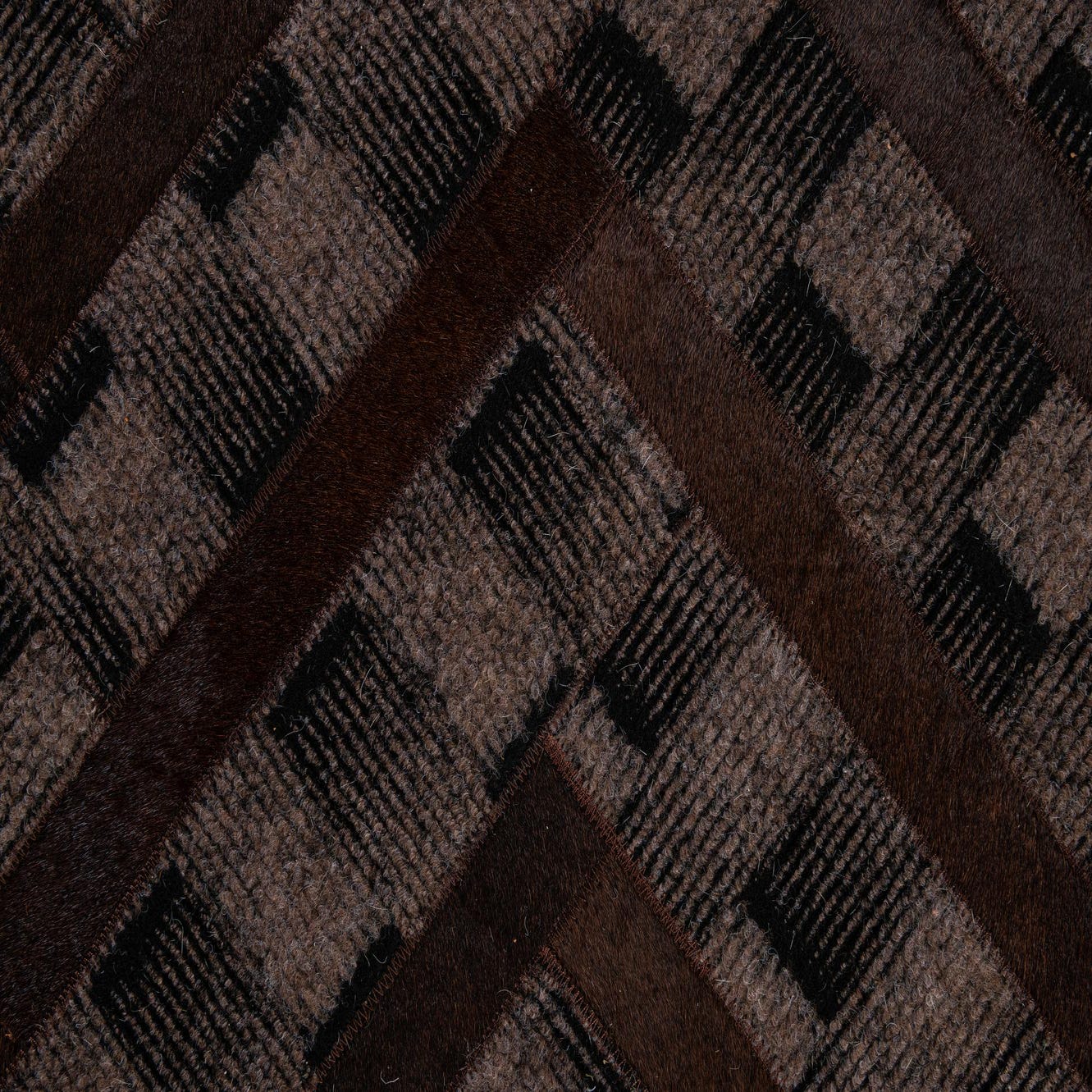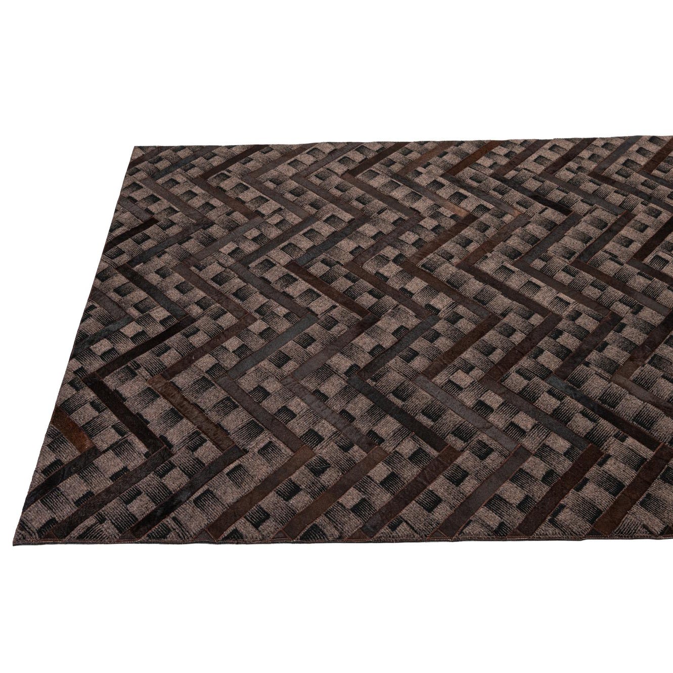 A 5x8 rectangular Cowhide - Patchwork rug featuring a modern chevron pattern in varying shades of brown and tan.