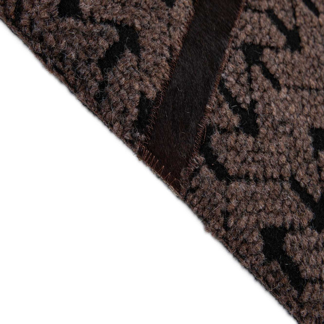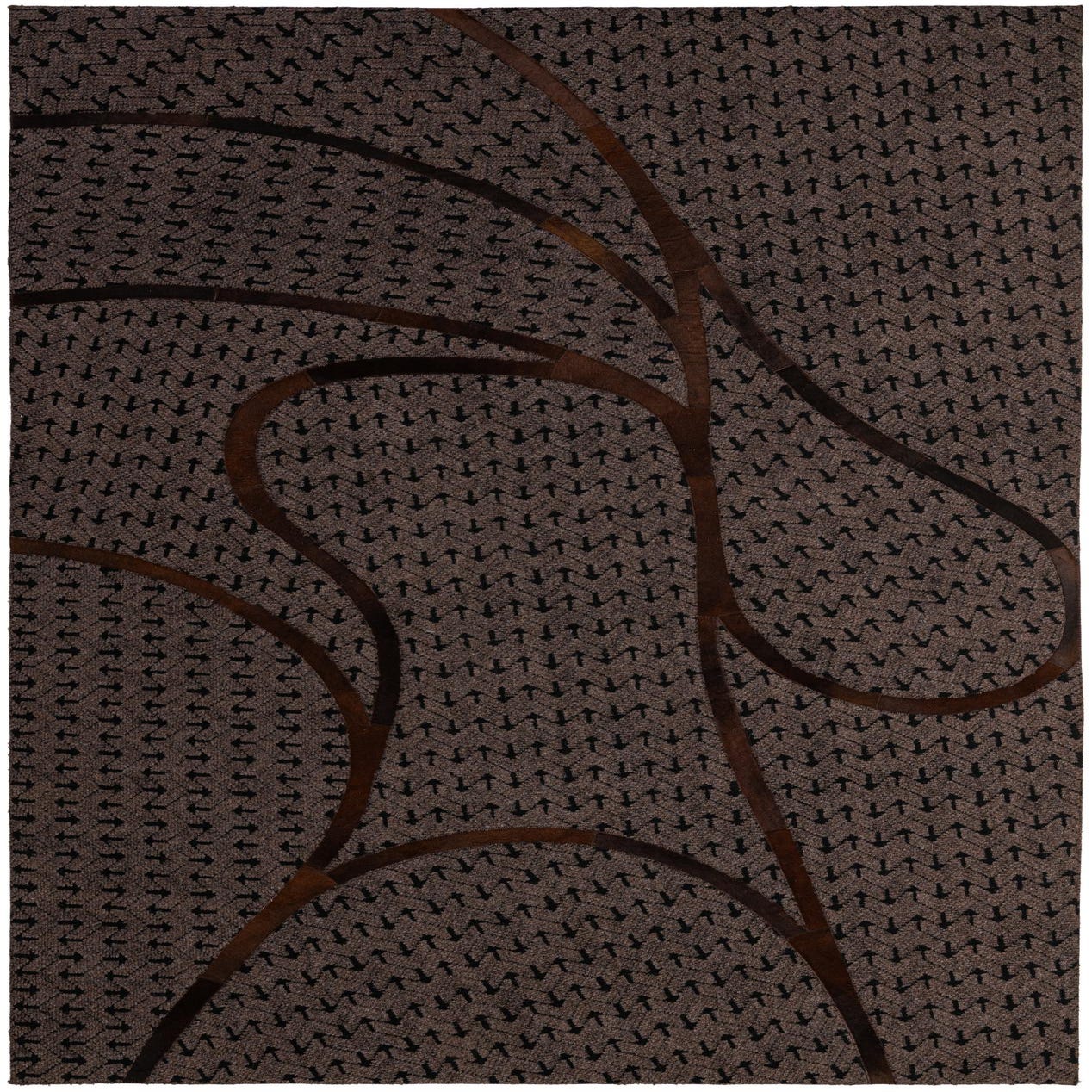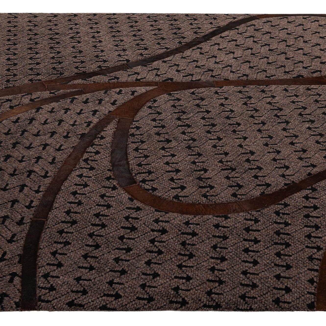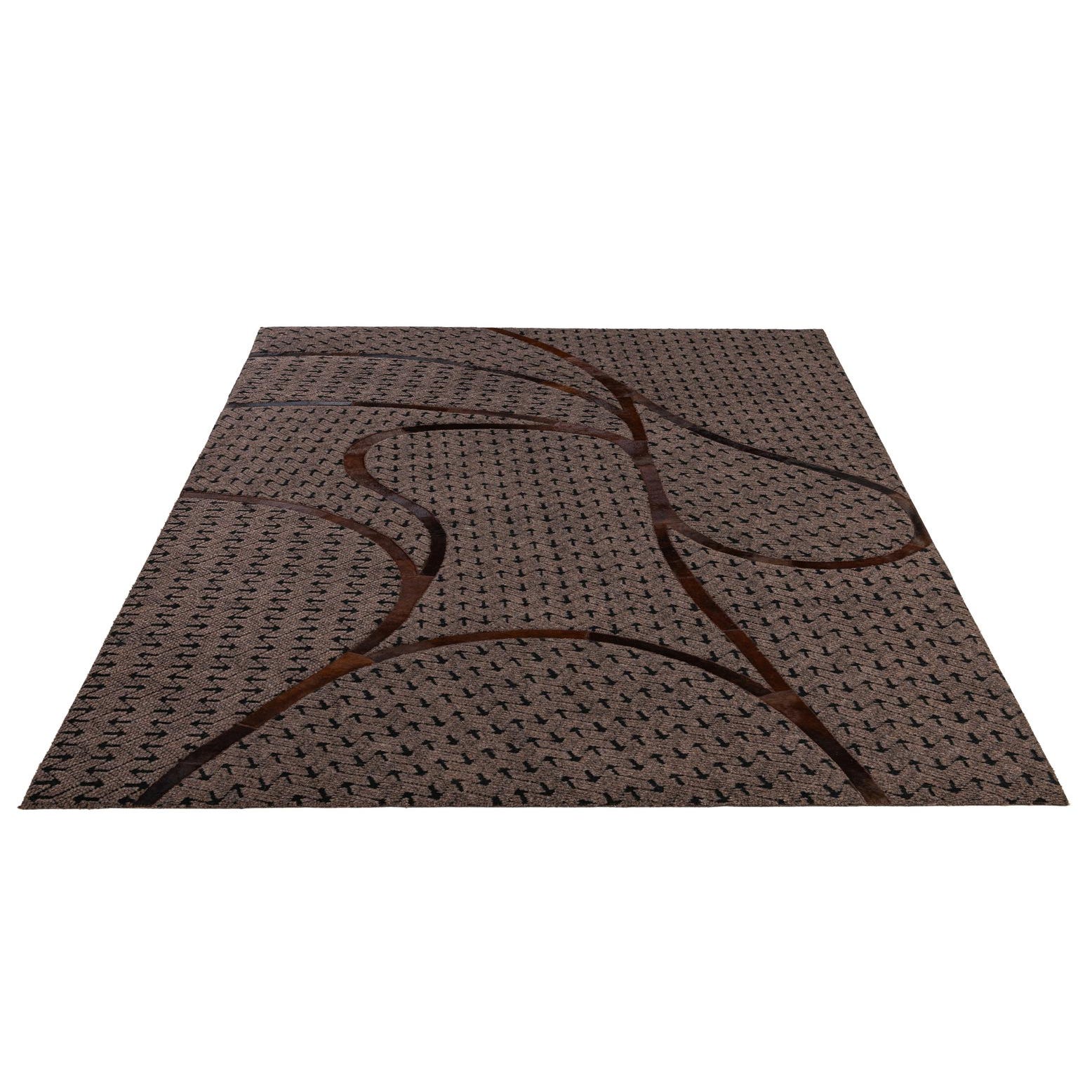 Handmade from cowhide and leather, this rug has a dark brown hair-on-hide field marked by a tight, small-scale black motif that gives the surface subtle visual texture. Sweeping, curved leather insets in warm brown cross the rug in organic arcs, creating a patchwork effect with clear tonal contrast between the soft hide and the smooth leather seams. The tactile mix is immediate to the touch: a low-nap, slightly napped hide underfoot with sleek leather lines that sit a hair higher and catch the light differently.