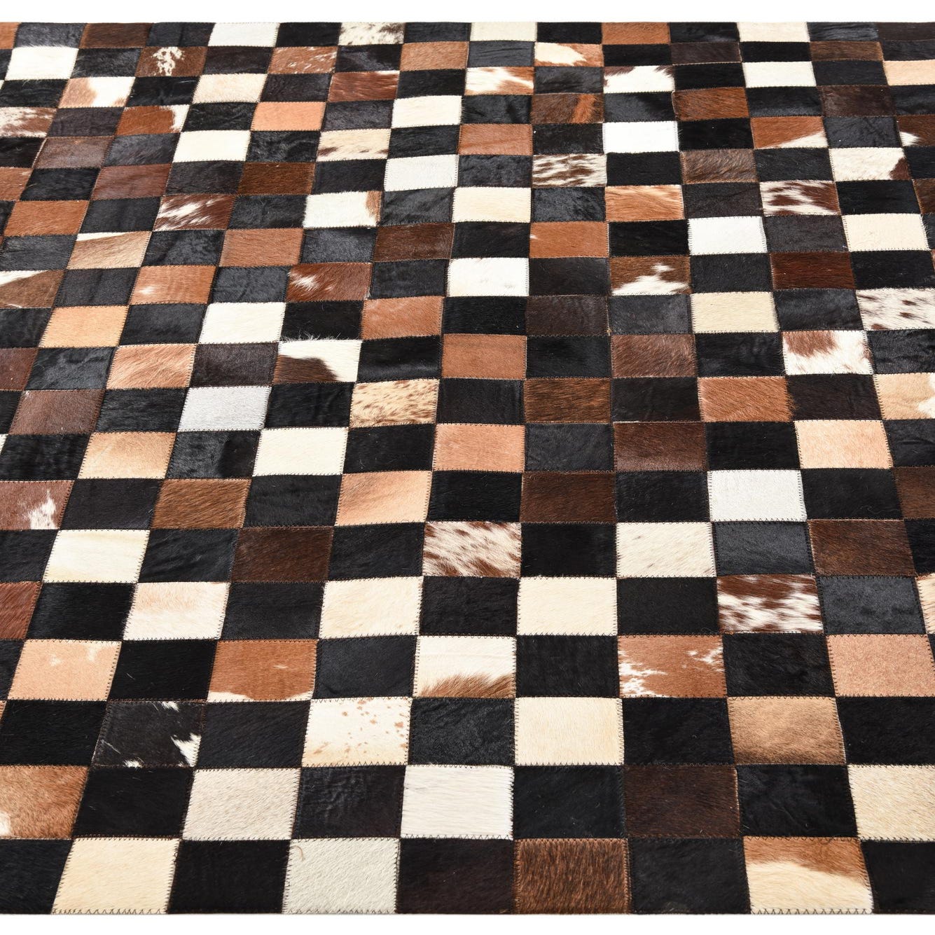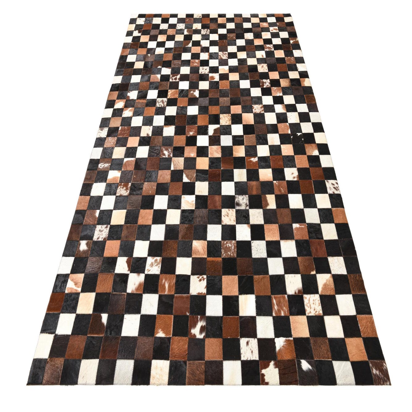 A 5x8 rectangular cowhide rug featuring a modern checkerboard pattern in varied shades of brown, tan, black, and white.