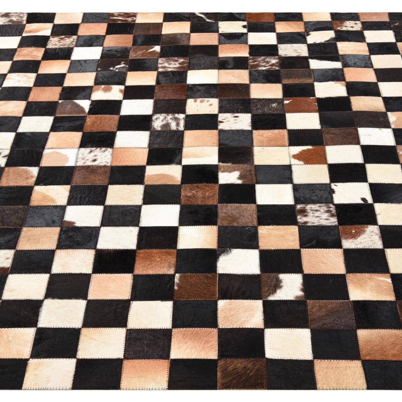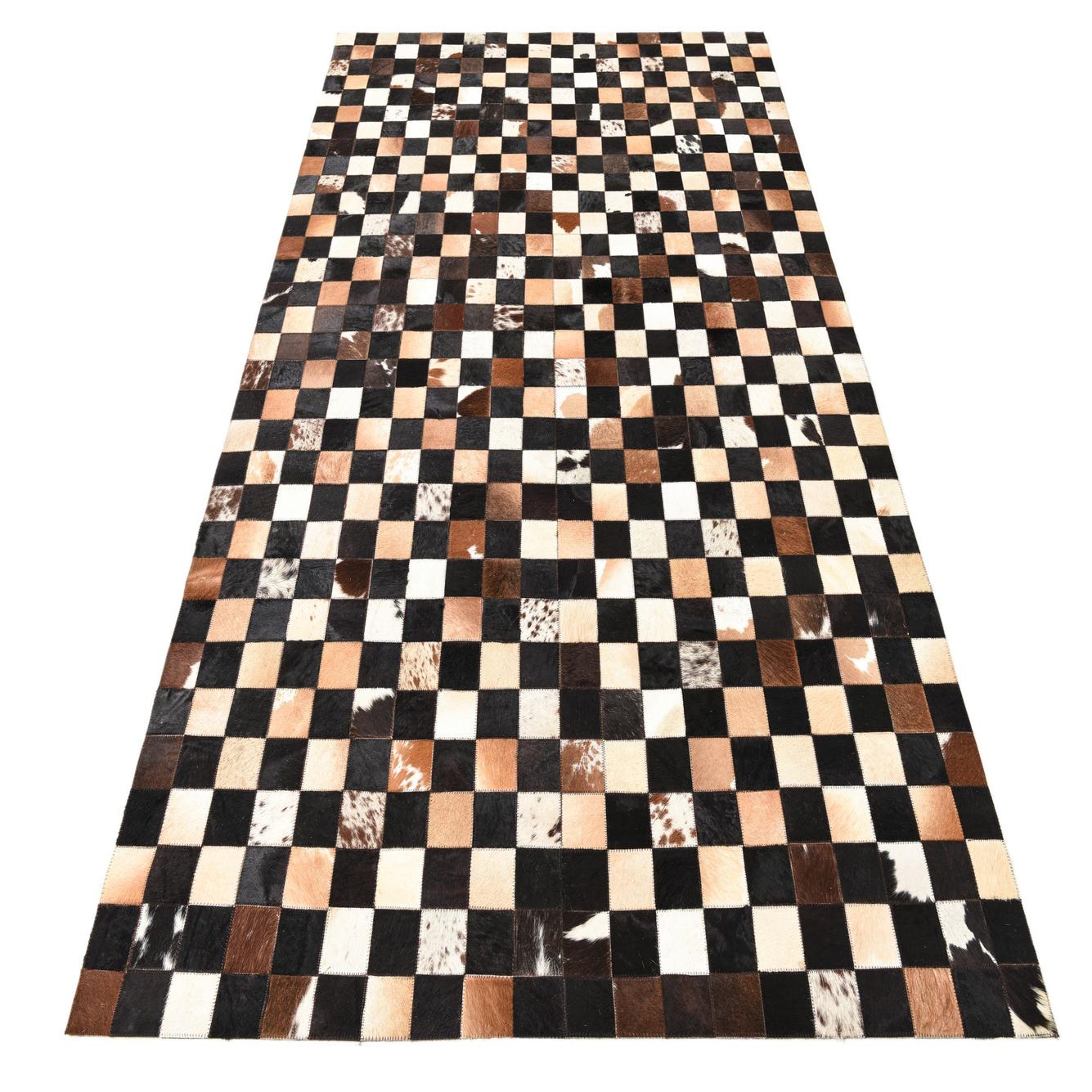 A 5x8 rectangular Cowhide rug with a modern checkered pattern in varying shades of brown, tan, black, and white.
