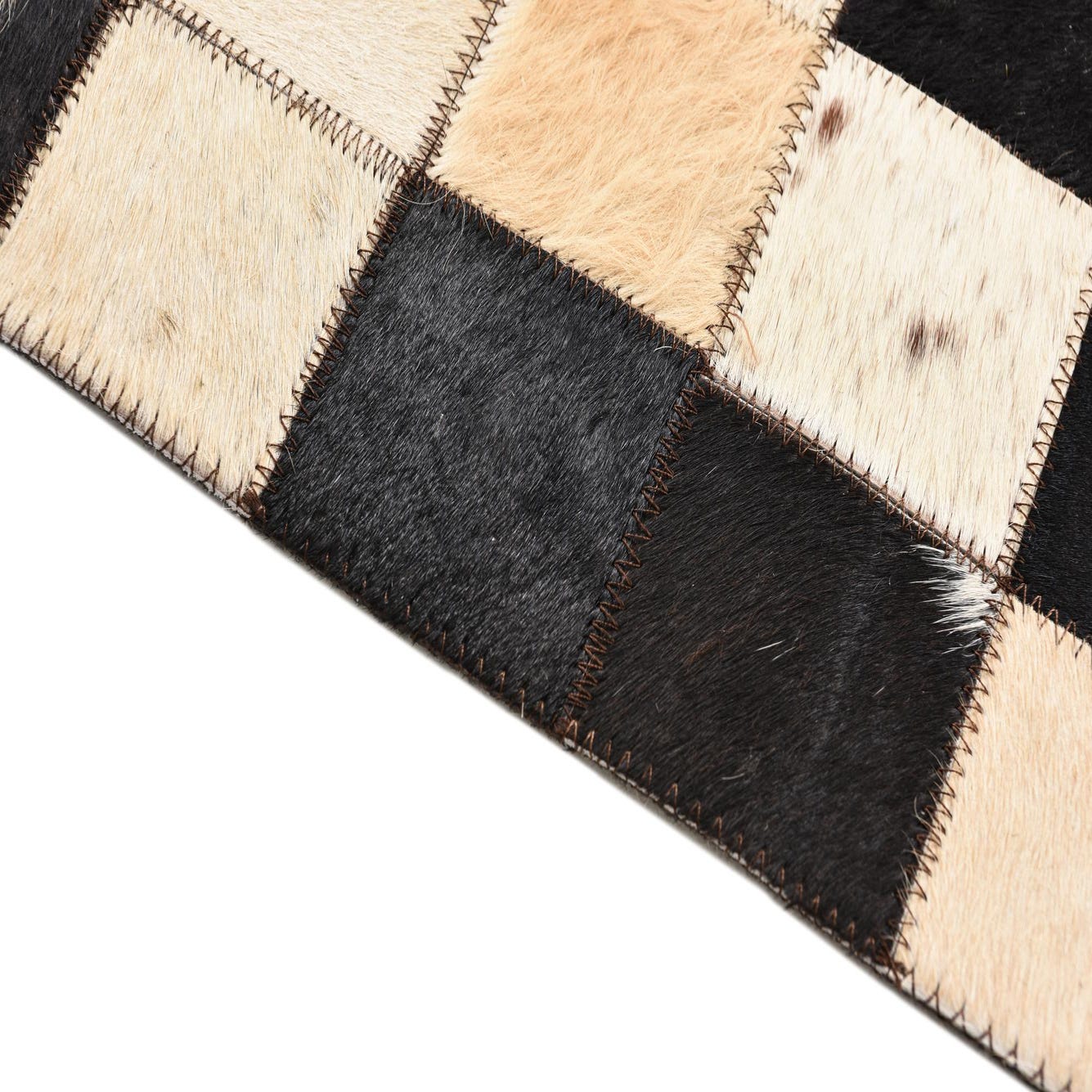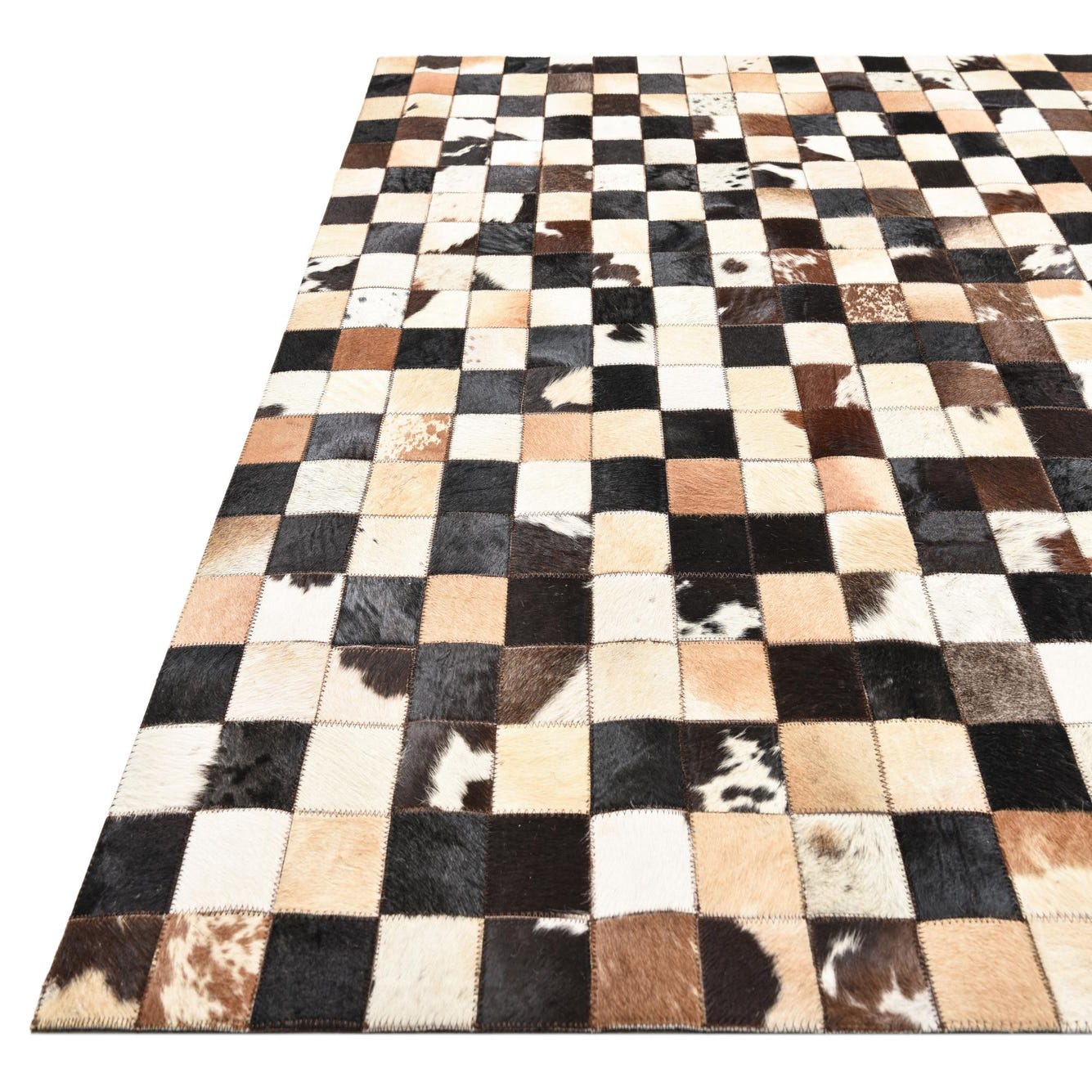 Hand made of cowhide and leather, this rug arranges small, square patches into a tightly gridded checkerboard that balances pattern and natural variation. A dark brown background anchors the design while squares in beige, ivory, light brown, black and varied browns — including spotted and mottled hides — create a warm, organic rhythm across the surface. The hair-on-hide finish has a soft, slightly glossy nap and the visible stitch lines between patches add a handcrafted, tactile presence underfoot.