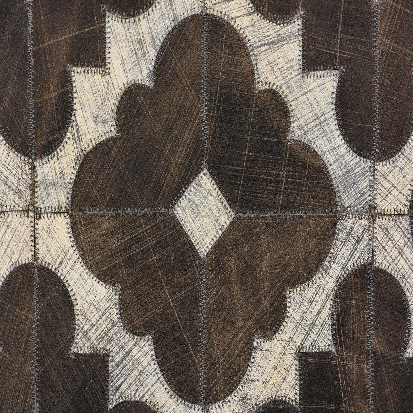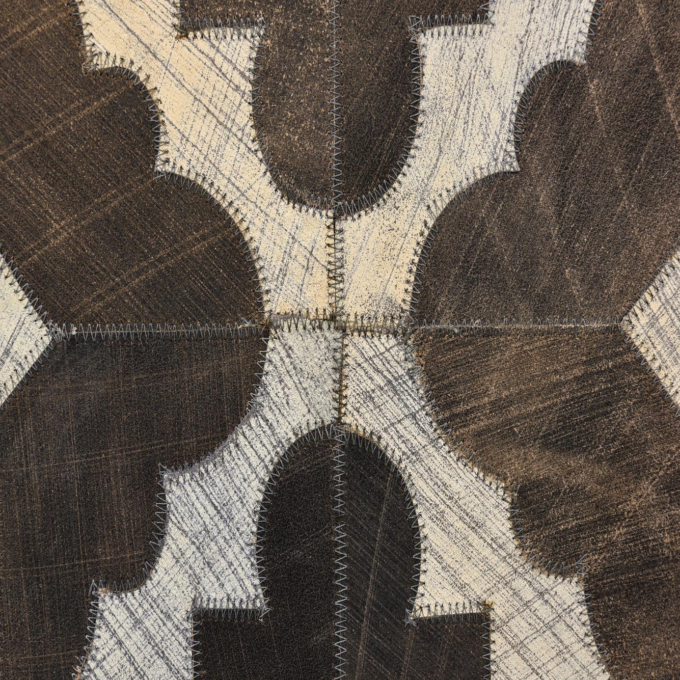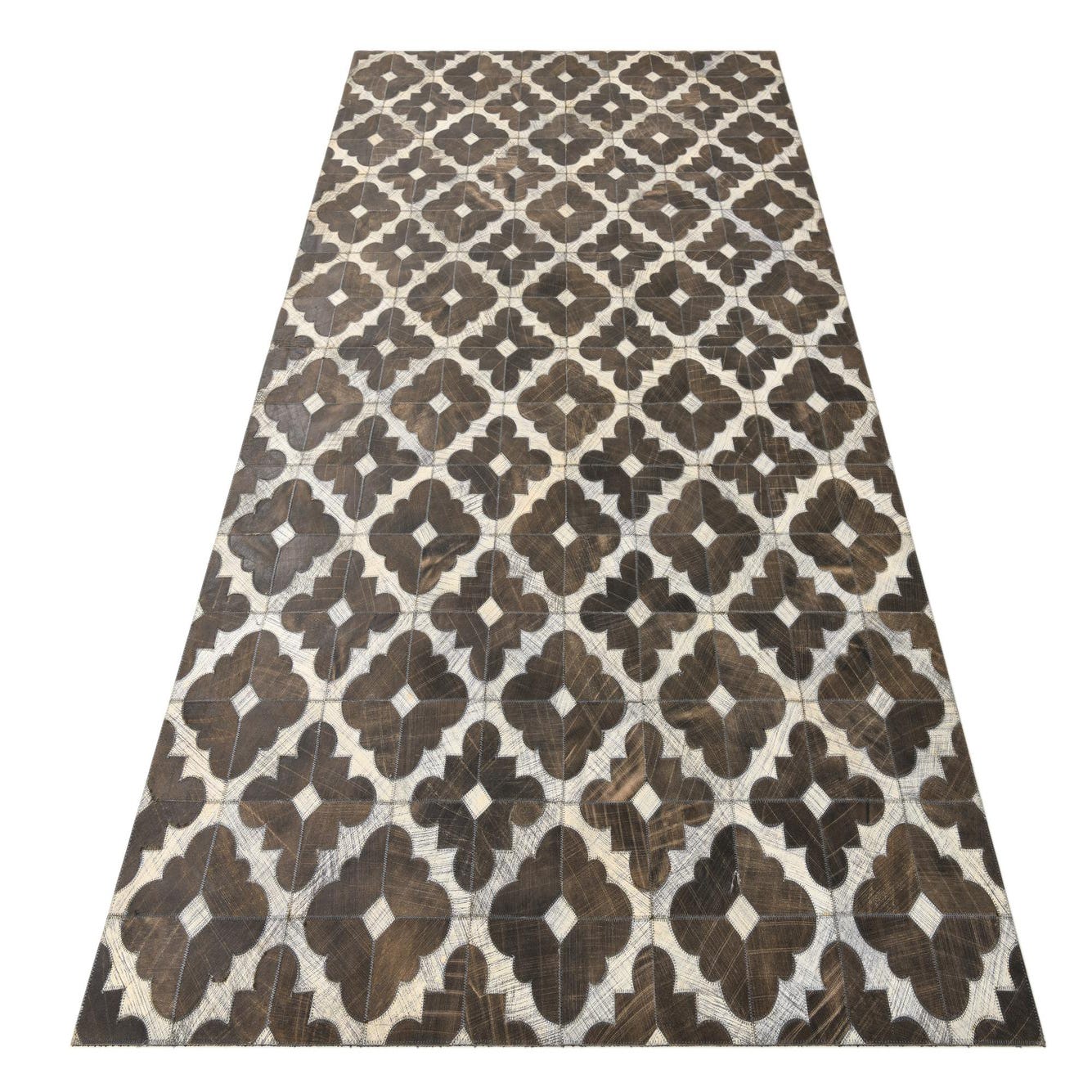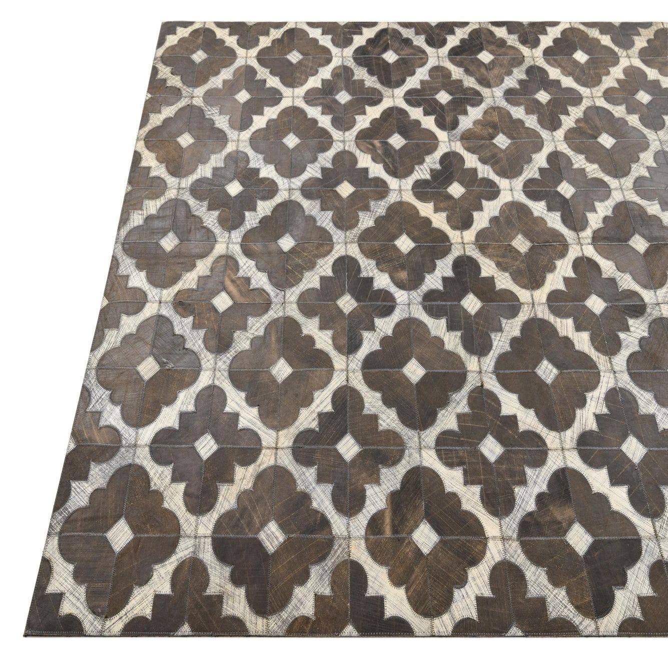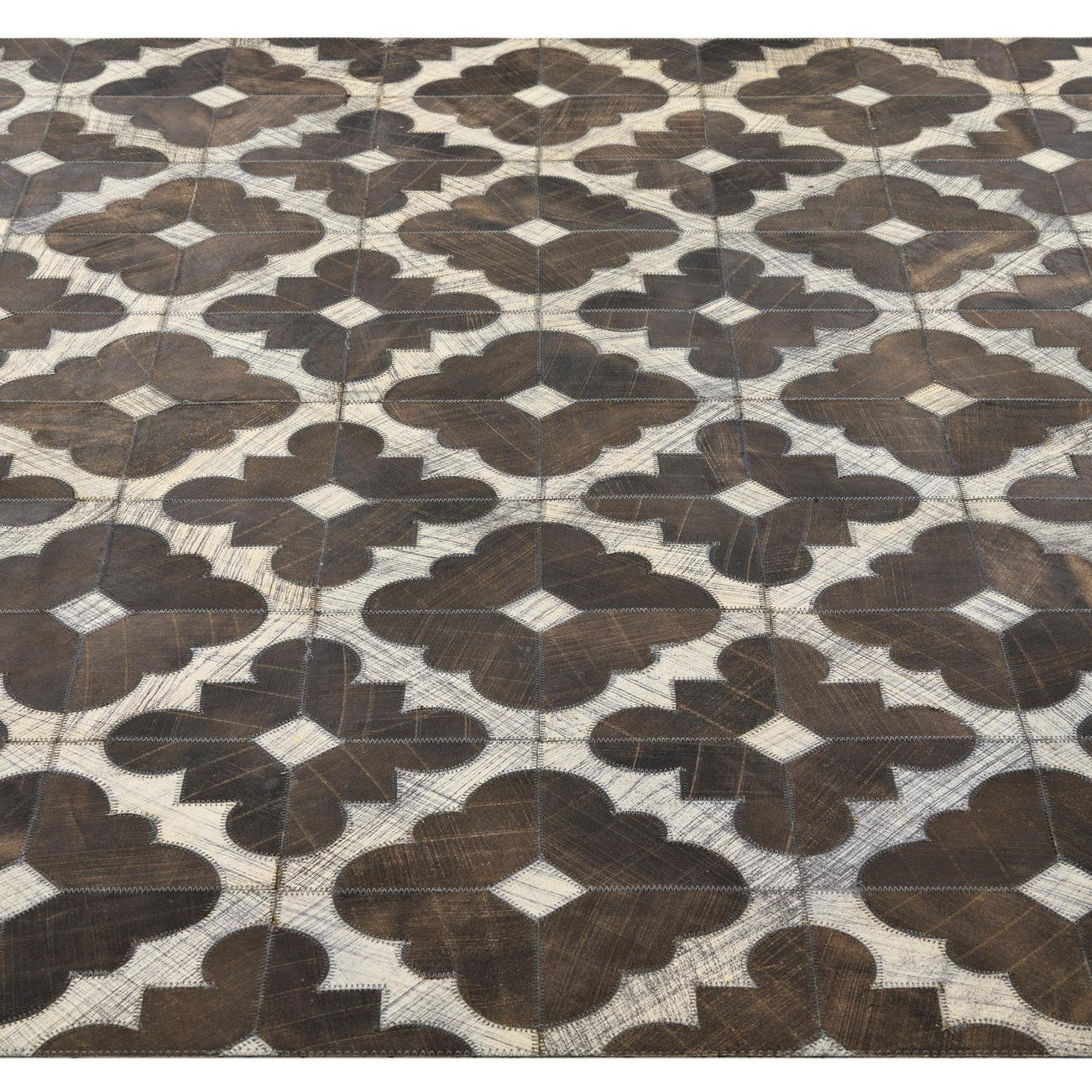 A 5x8 rectangular Cowhide rug in browns and tans, featuring a modern geometric pattern of interlocking quatrefoils.