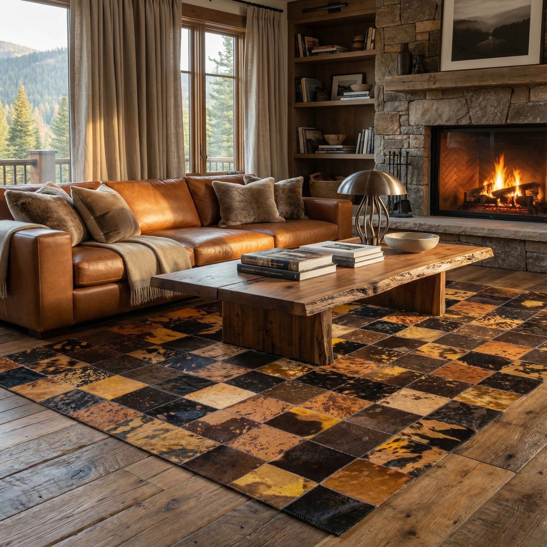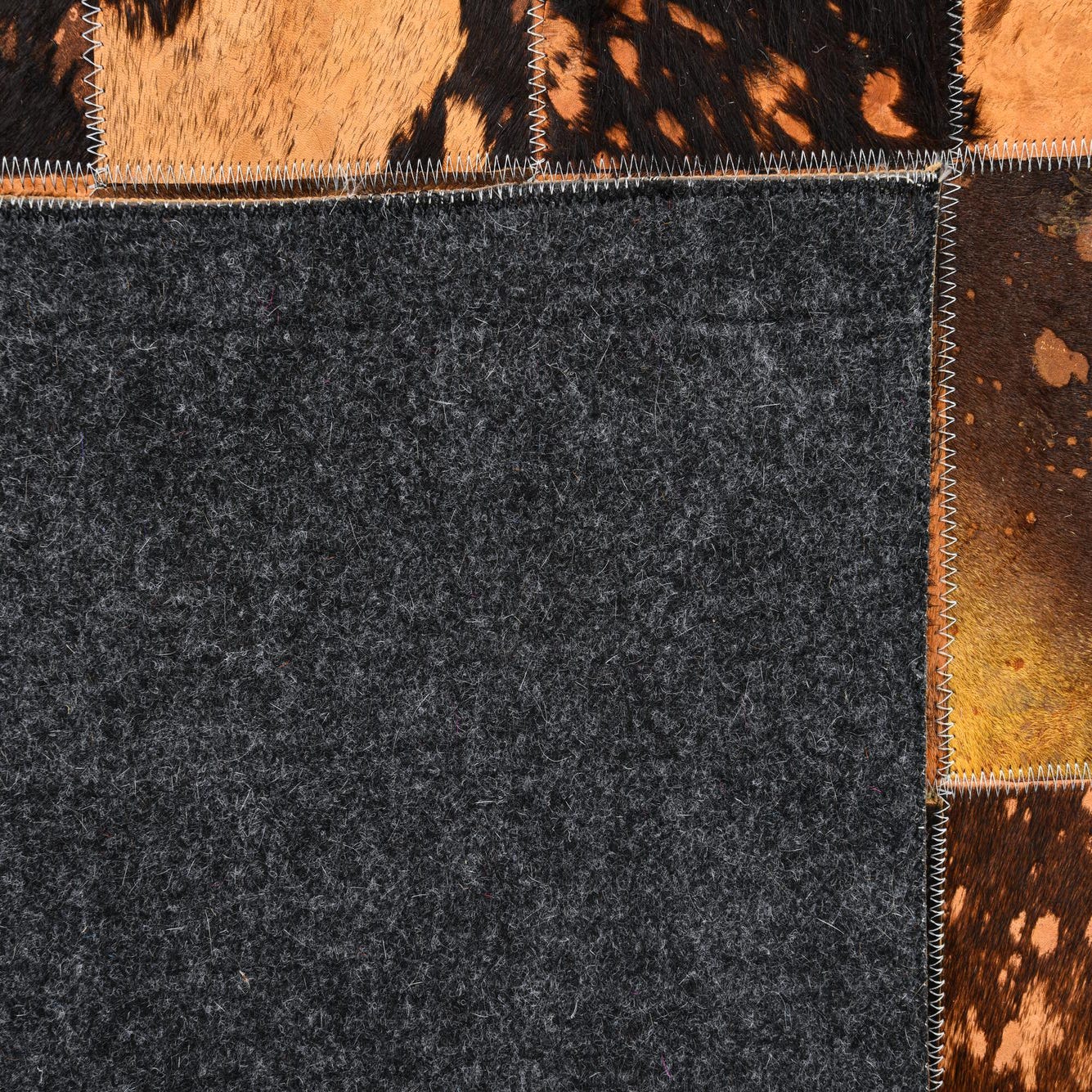 This Cowhide collection rug features a checkerboard pattern with a rich palette of dark brown, brown, and orange tones set against a predominantly dark brown background. The rug's construction is meticulously handcrafted using cowhide and leather, which gives it a unique texture and ensures durability.