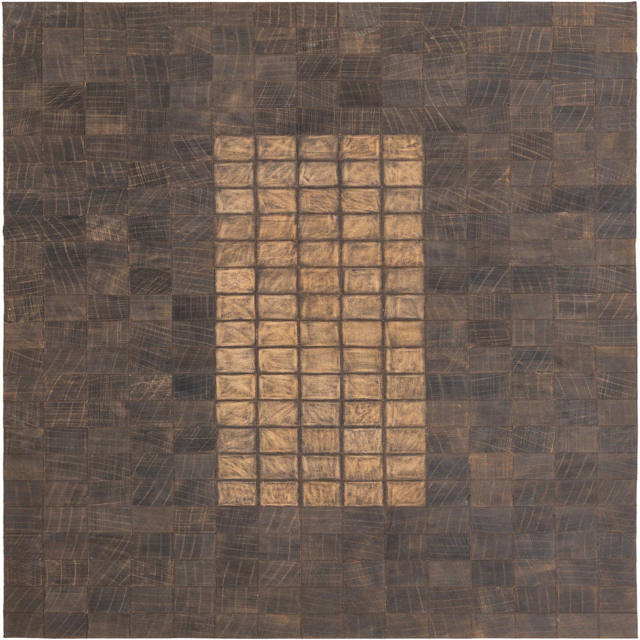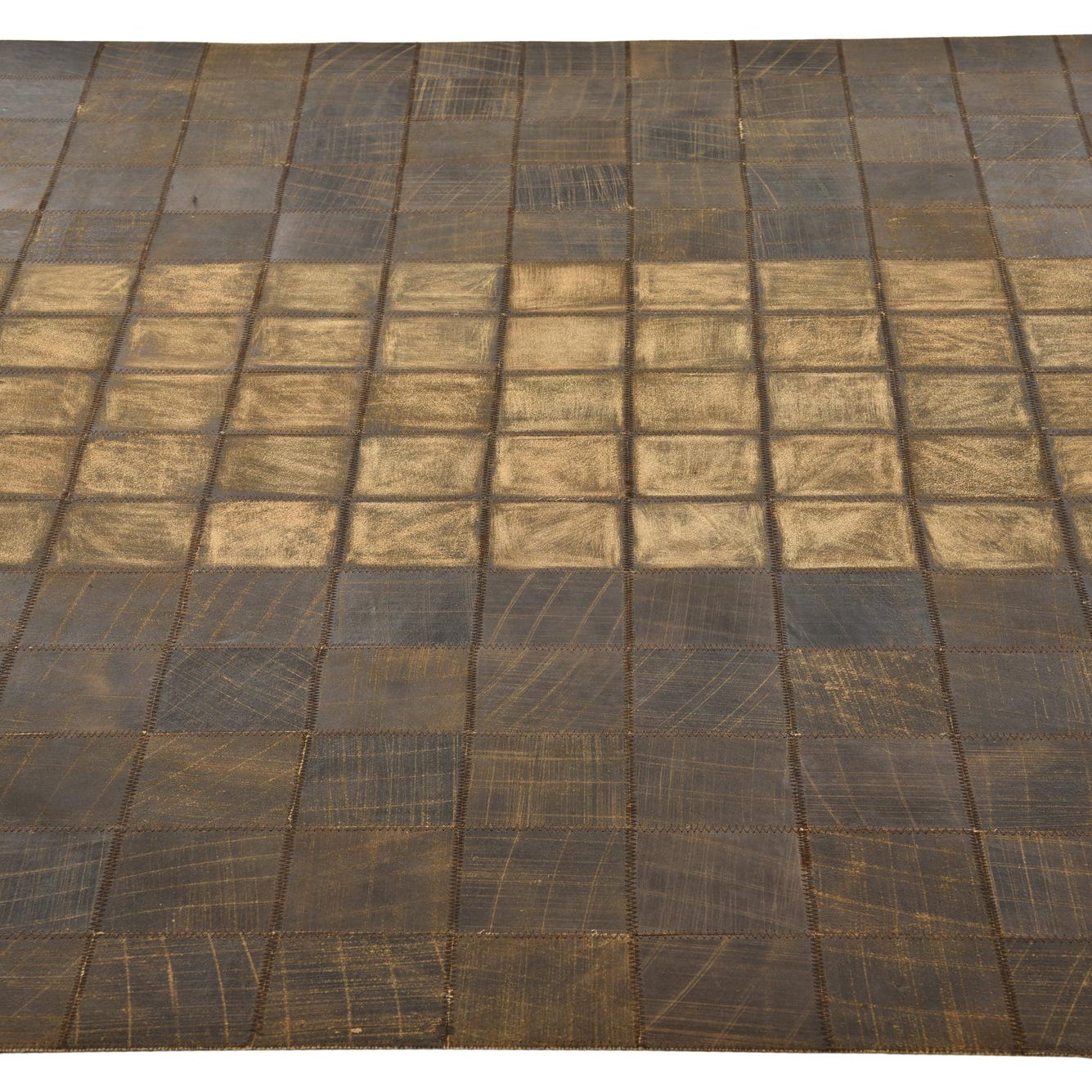 A 5x8 rectangular Cowhide Leather rug featuring a modern block pattern in varying shades of brown and tan, with a lighter tan rectangle in the center.