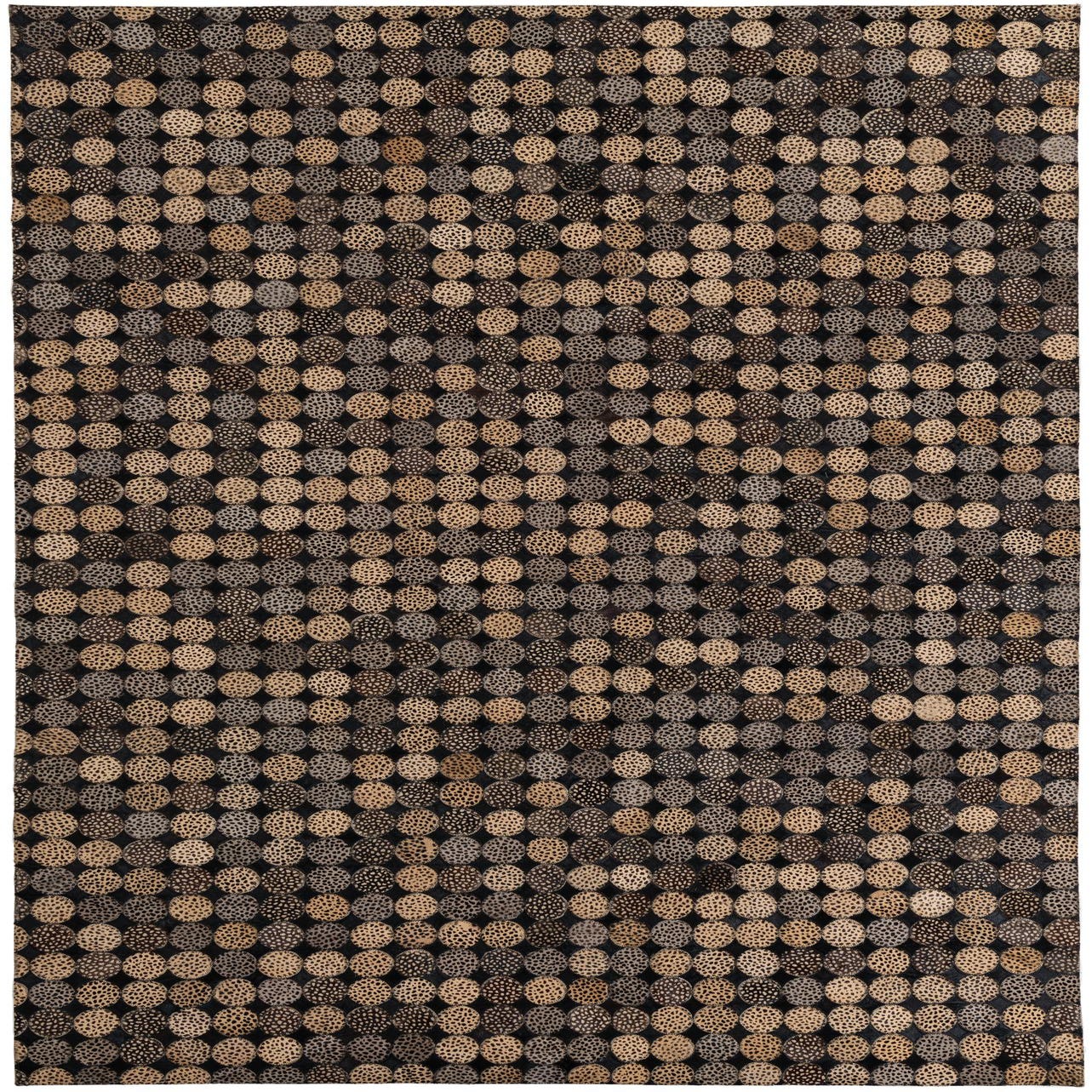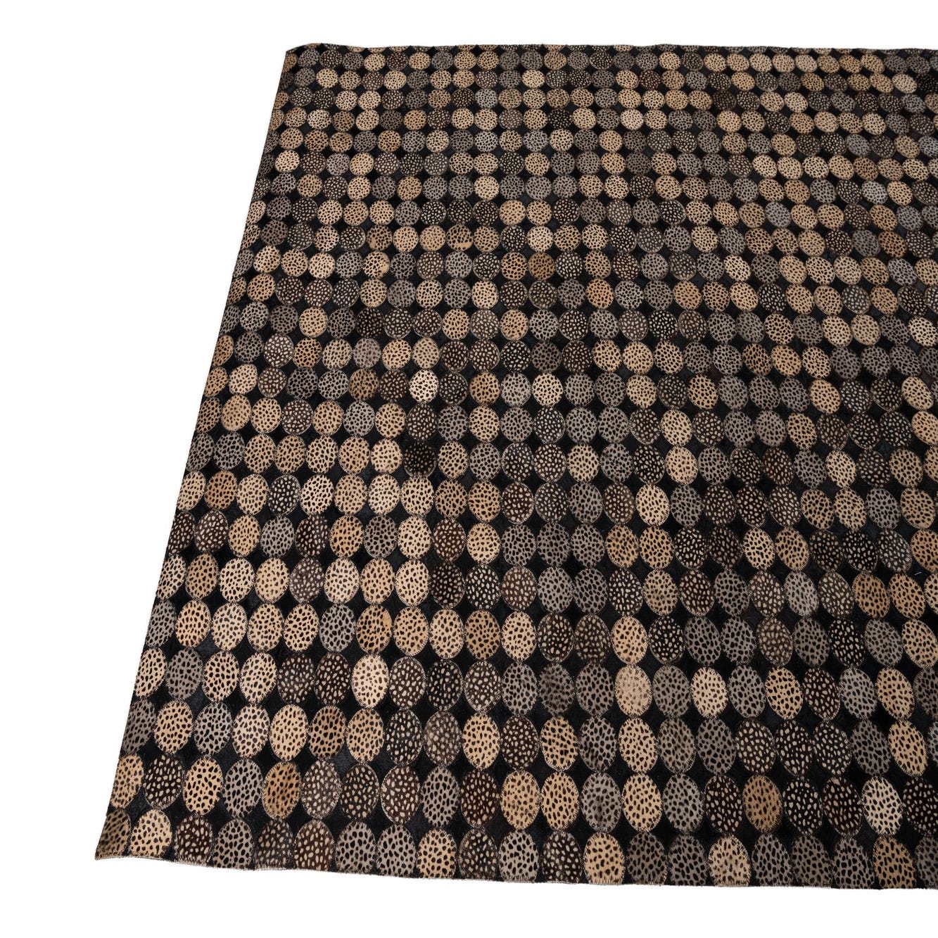 A 5x8 rectangular Cowhide Leather rug featuring a modern pattern of various brown and tan spotted circles on a dark background.