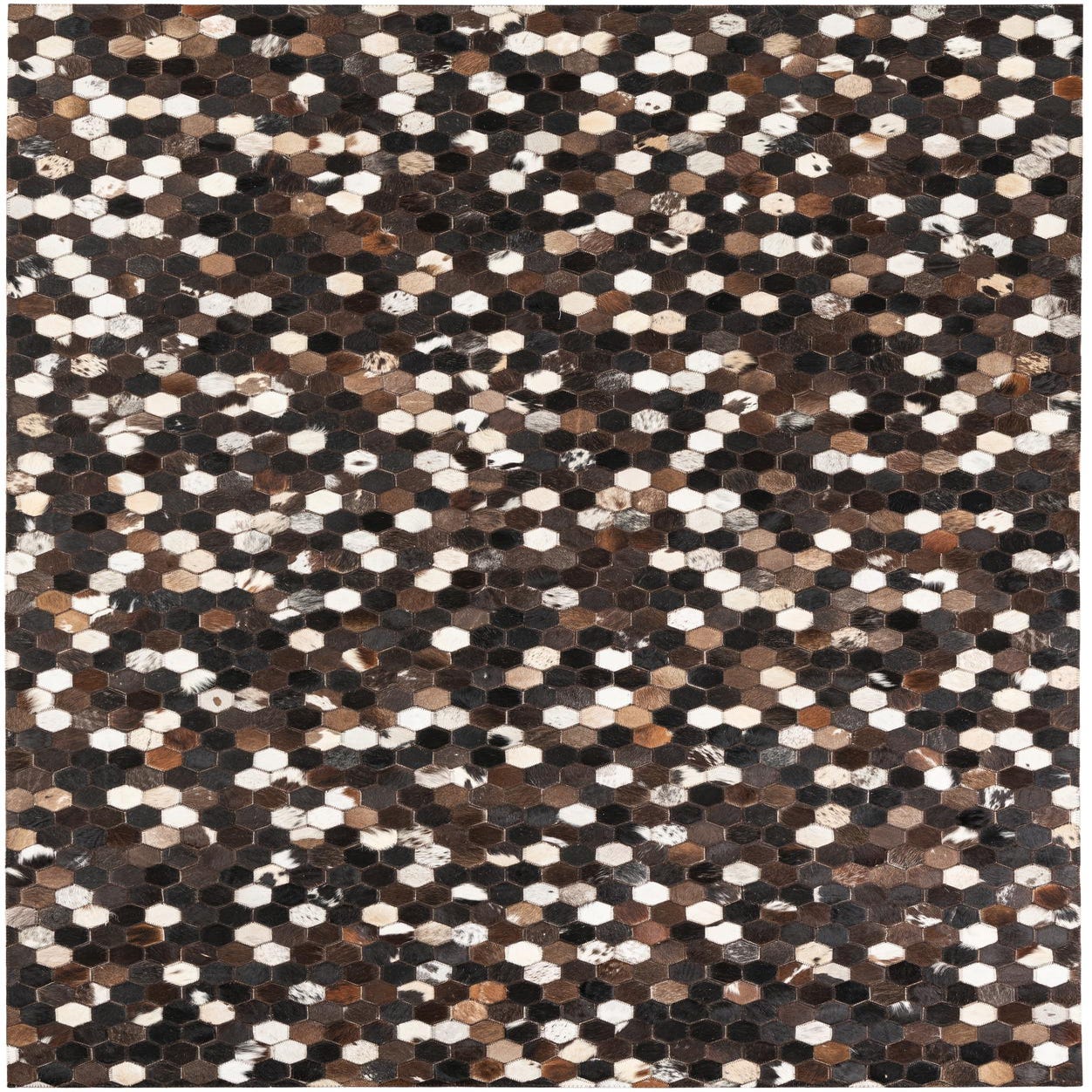 A 5x8 rectangular Cowhide Leather rug featuring a modern honeycomb pattern in various shades of brown, tan, black, and white.