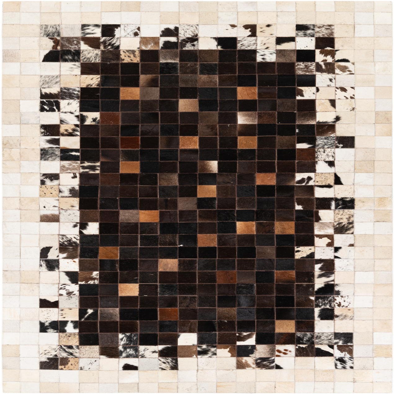 A rectangular 5x8 modern cowhide rug featuring a gradient of brown and tan patchwork squares, transitioning from lighter edges to a darker center.