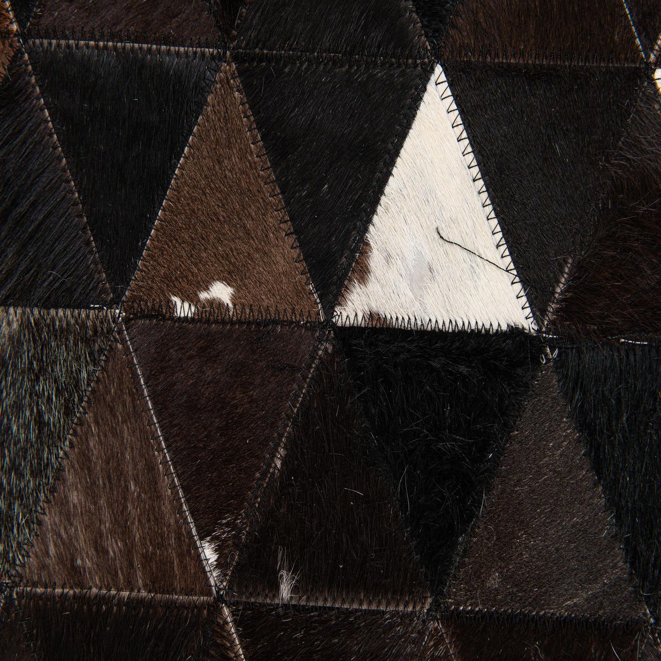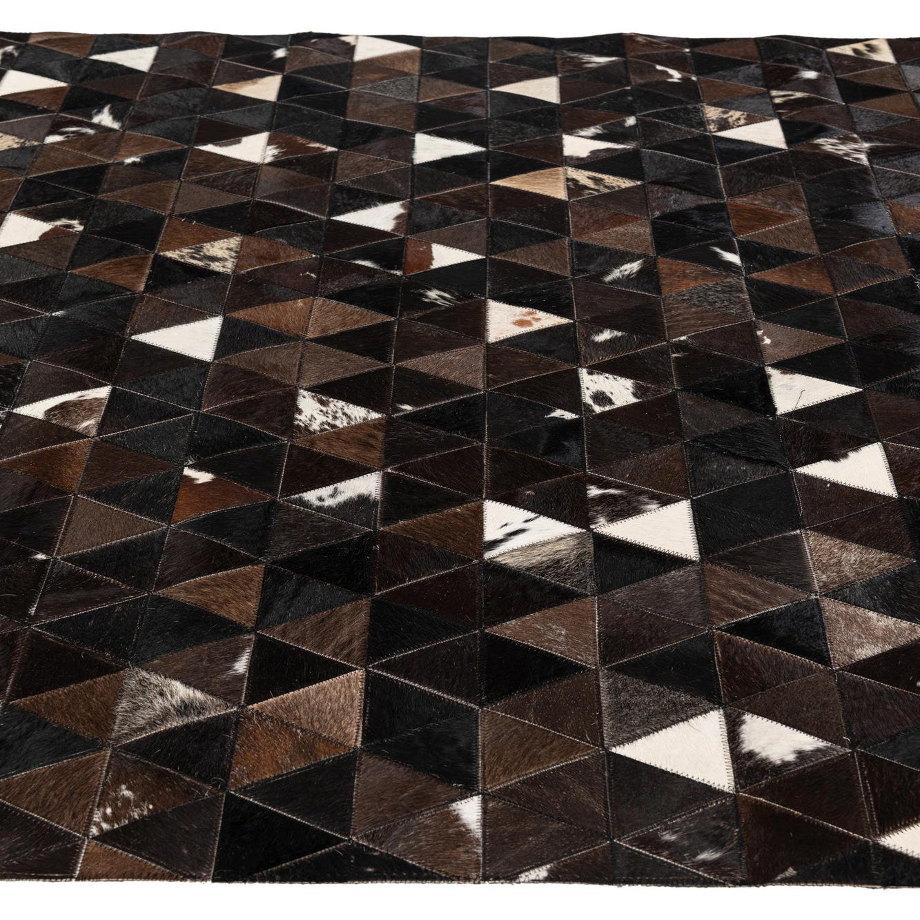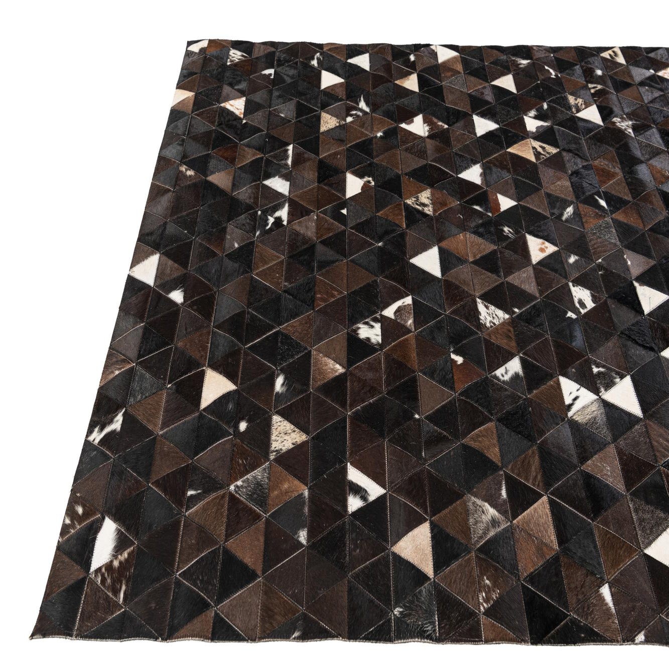 A 5x8 rectangular Cowhide Stocks rug featuring a modern geometric pattern of brown, tan, and white triangular cowhide patches.