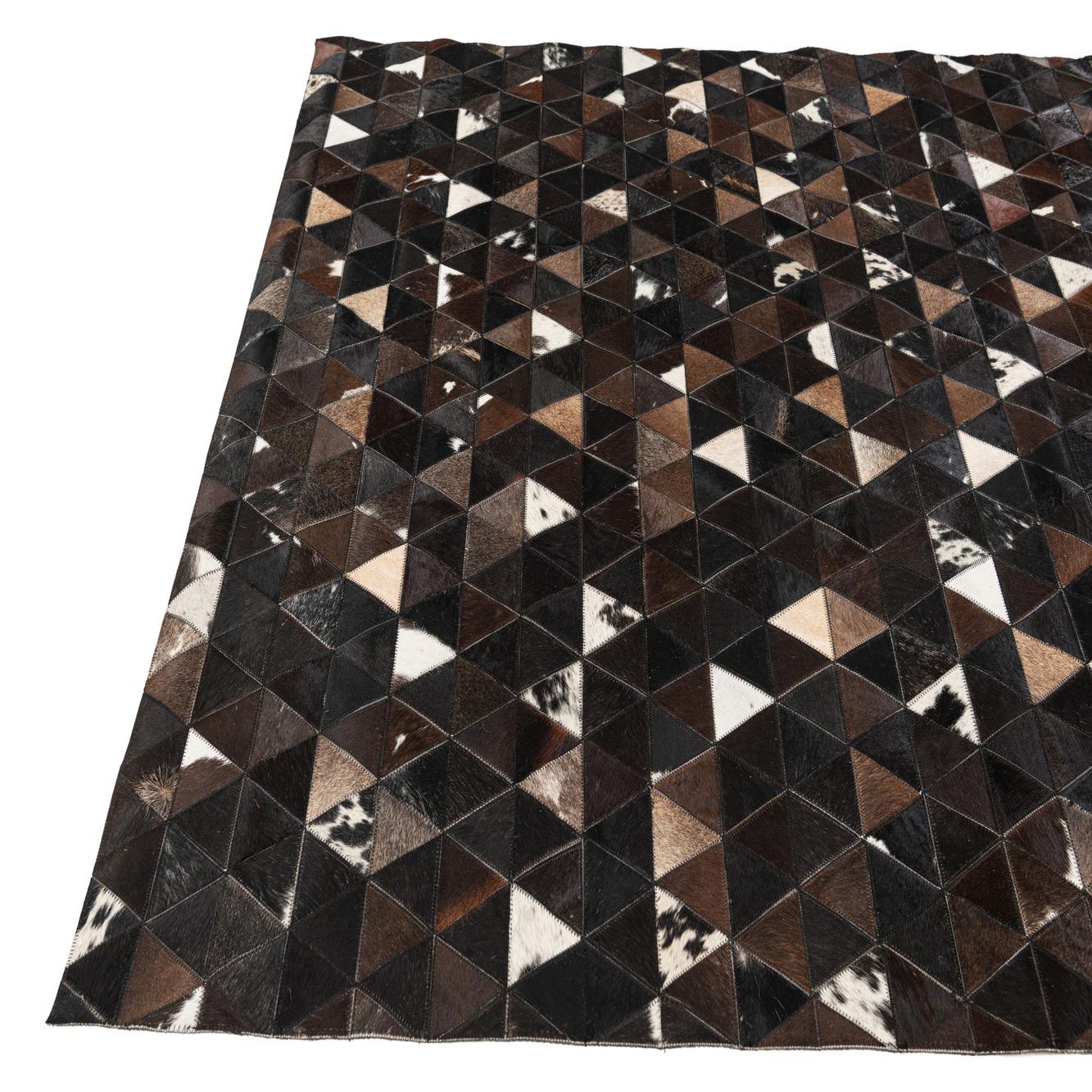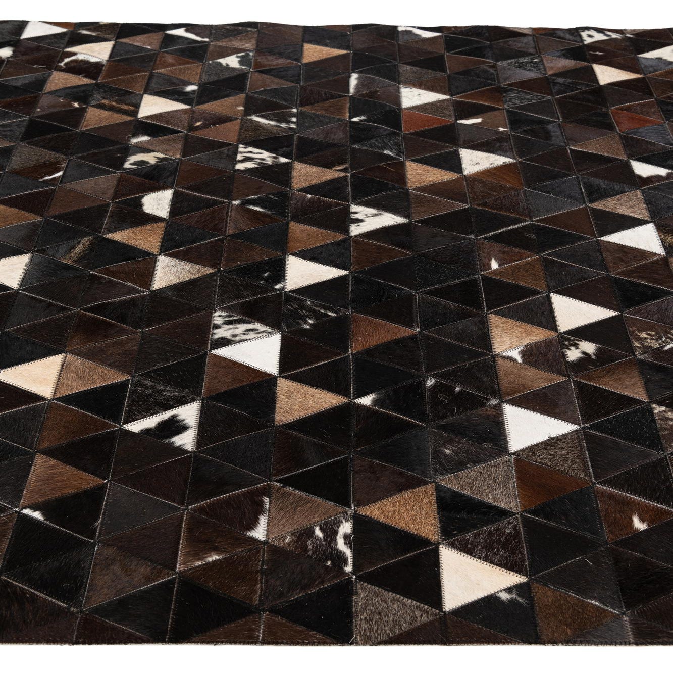 Hand-stitched triangles form a tight geometric mosaic on a dark brown background, creating a modern, graphic pattern that still feels grounded. Each small triangle is cut from natural cowhide, showing variations of black, brown, beige and ivory with occasional mottled markings that add organic movement to the grid. The pile has a short, soft hair with a gentle sheen and the leather backing and visible stitching give the piece tactile structure and a crafted, artisanal presence.