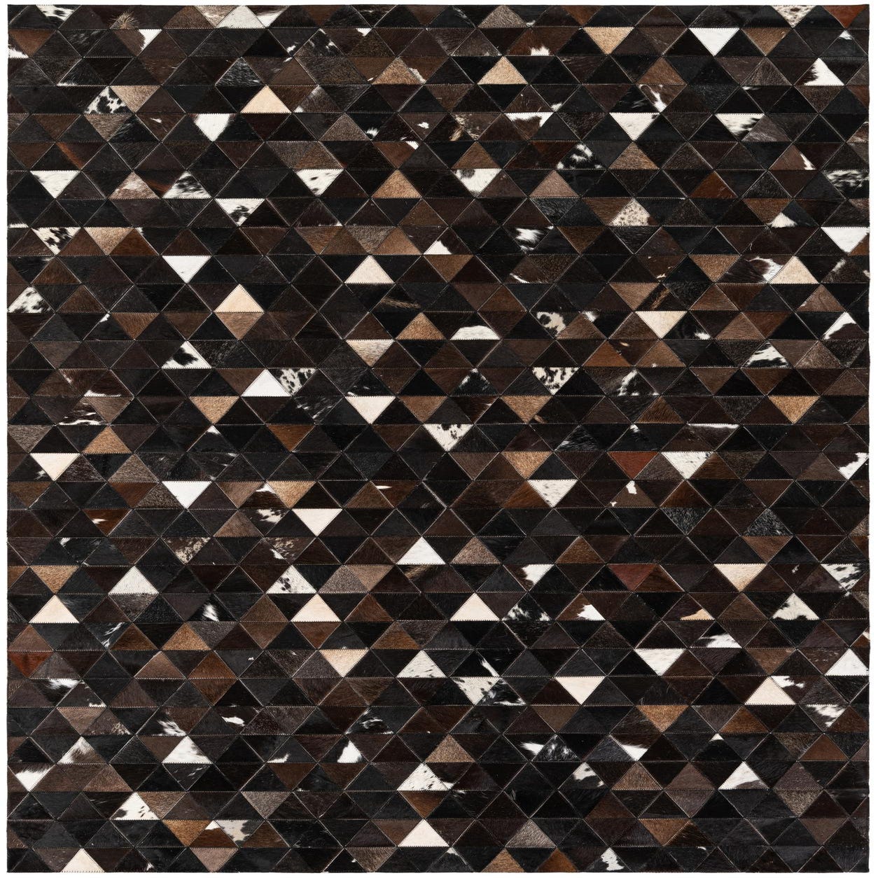 A 5x8 rectangular Cowhide Stocks rug featuring a modern geometric pattern of stitched brown, tan, black, and white cowhide triangles.