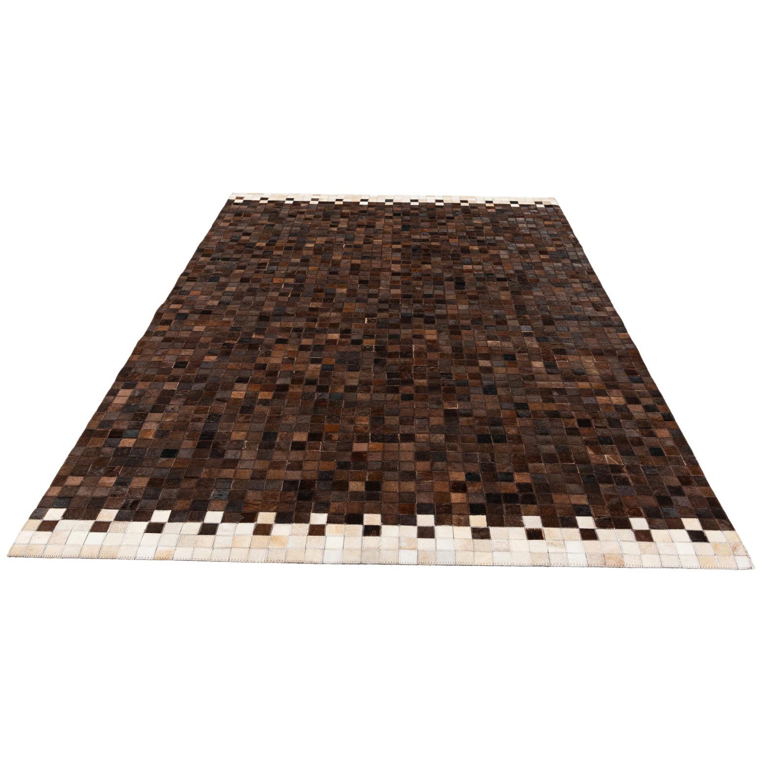 A 5x8 rectangular Cowhide Stocks rug featuring a modern patchwork of brown and tan squares with a white checkered border.
