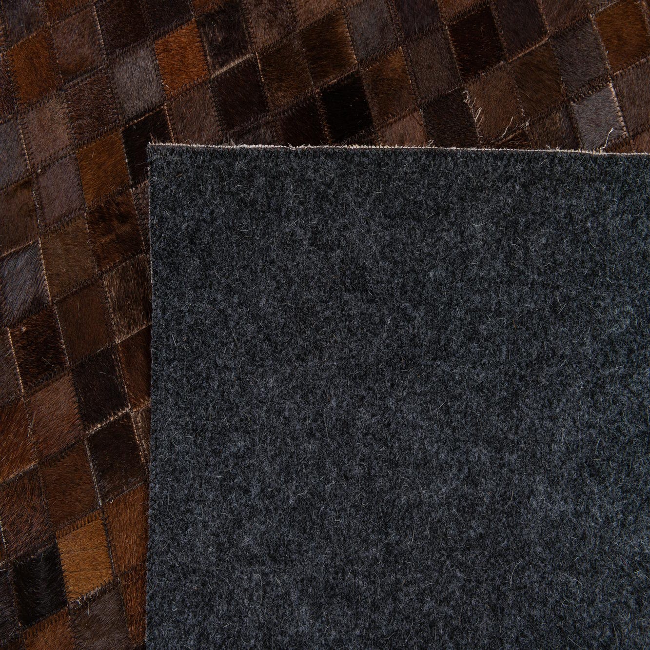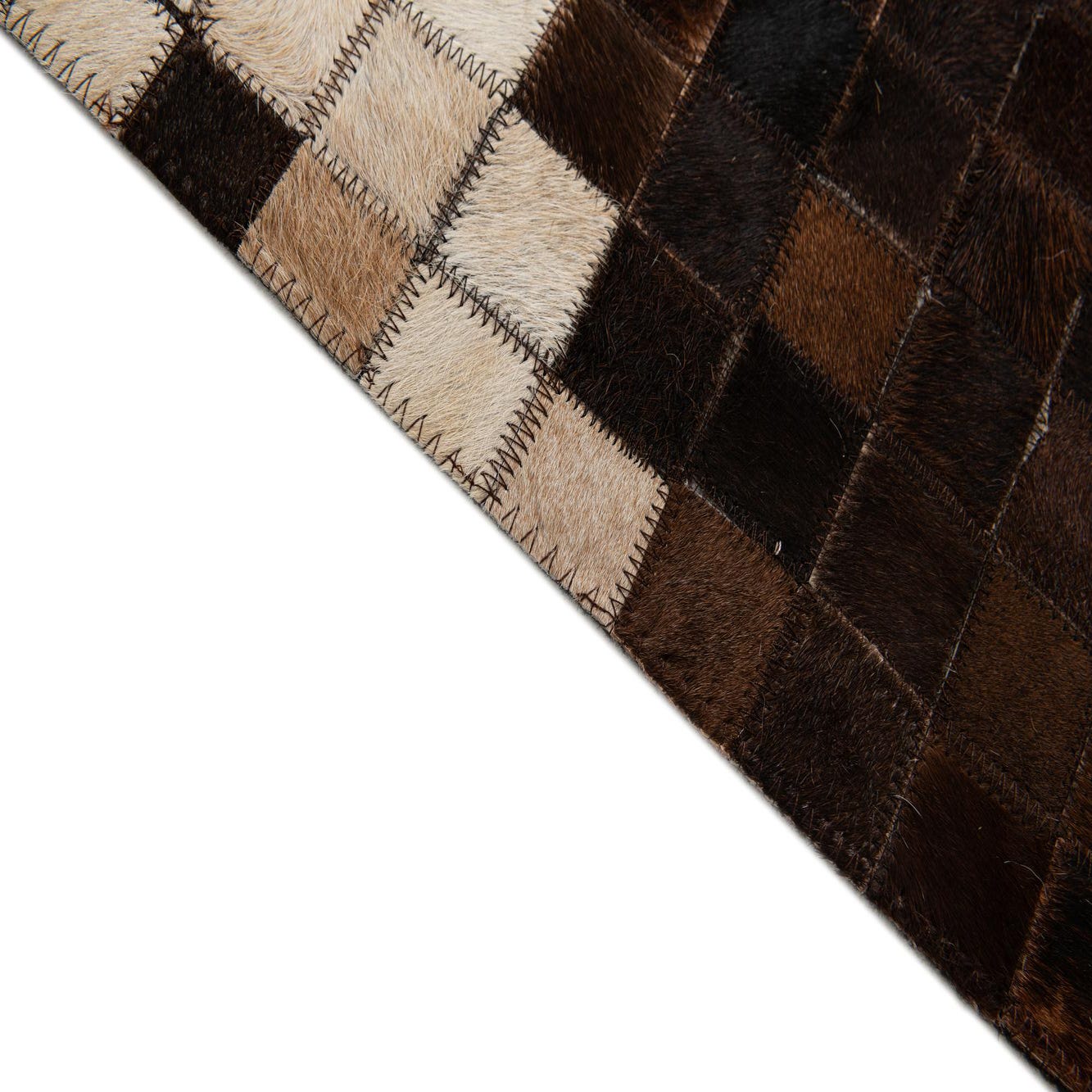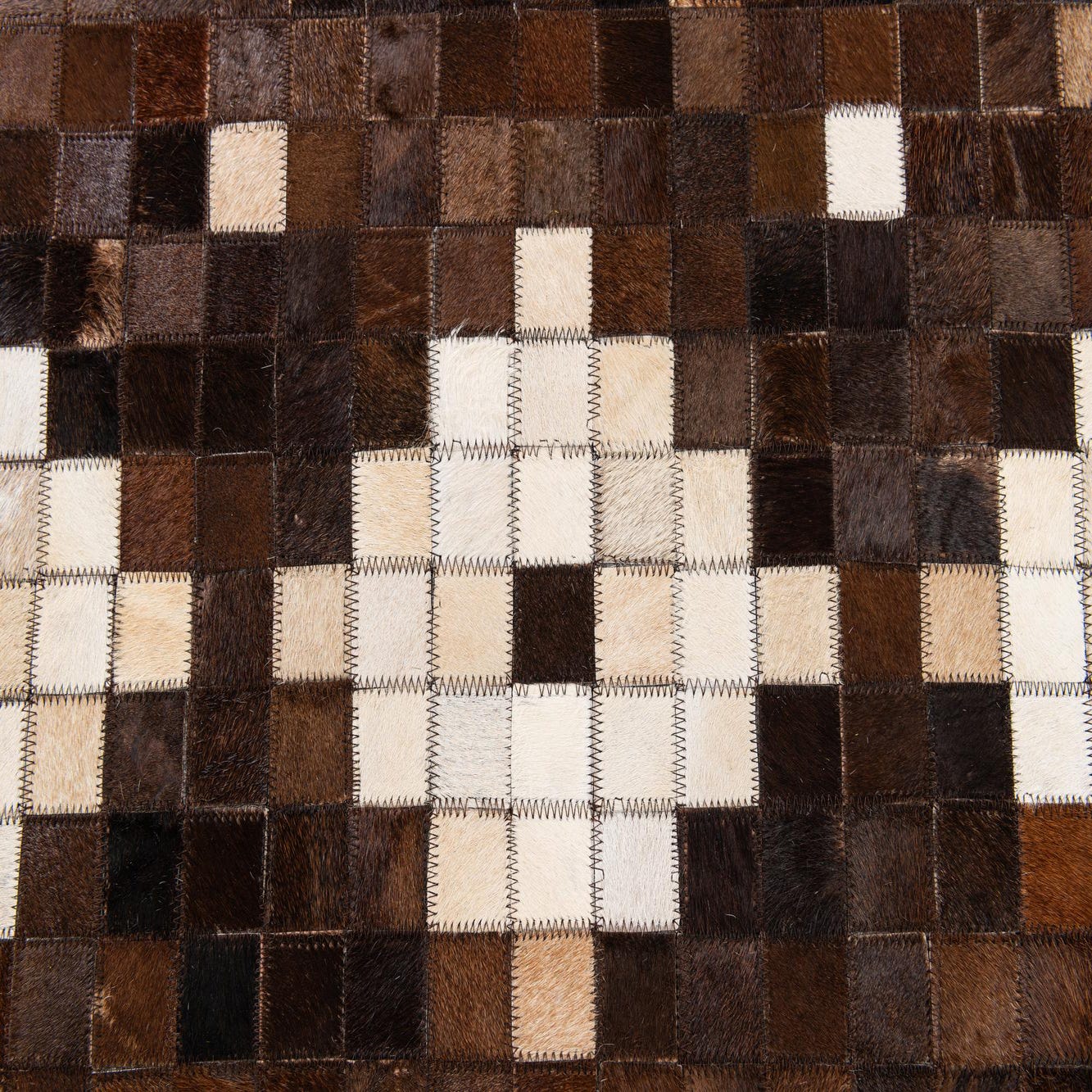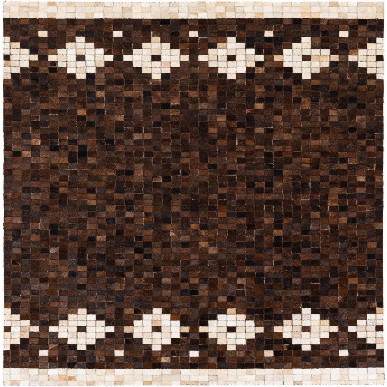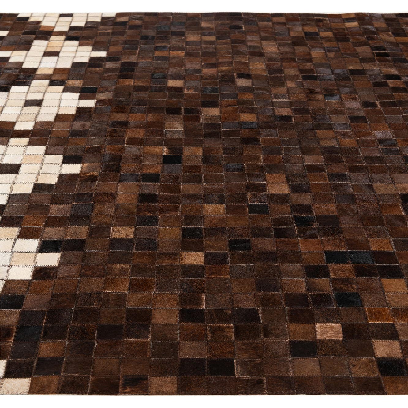 A rectangular 5x8 brown and tan cowhide rug with a modern geometric pattern, ideal for a living room.