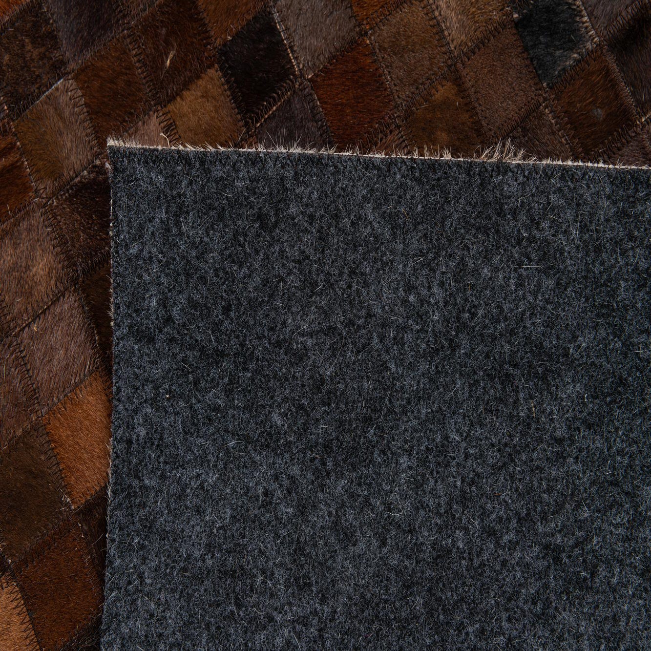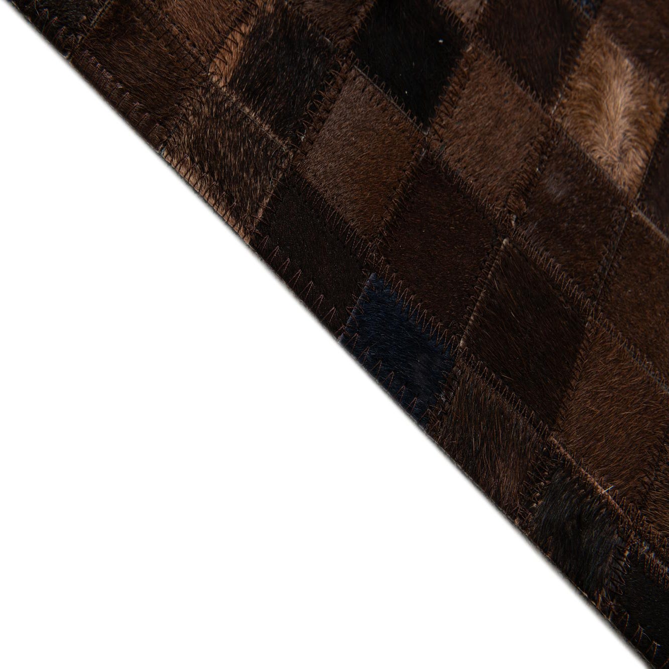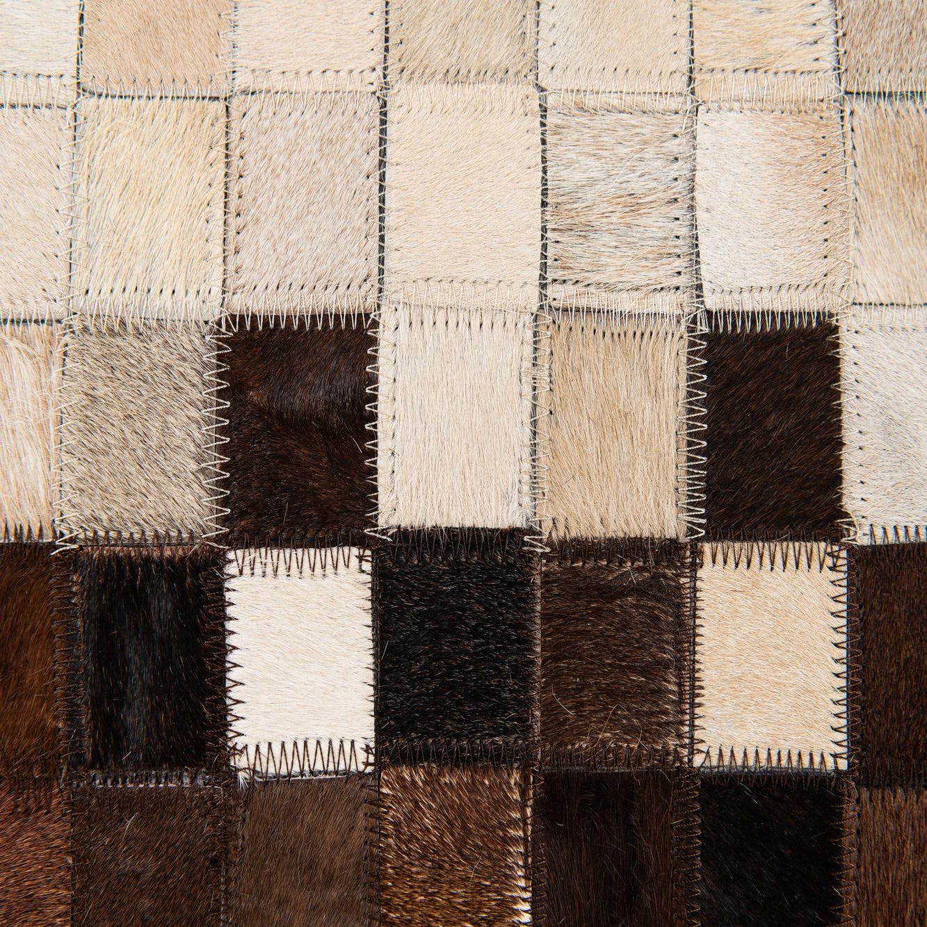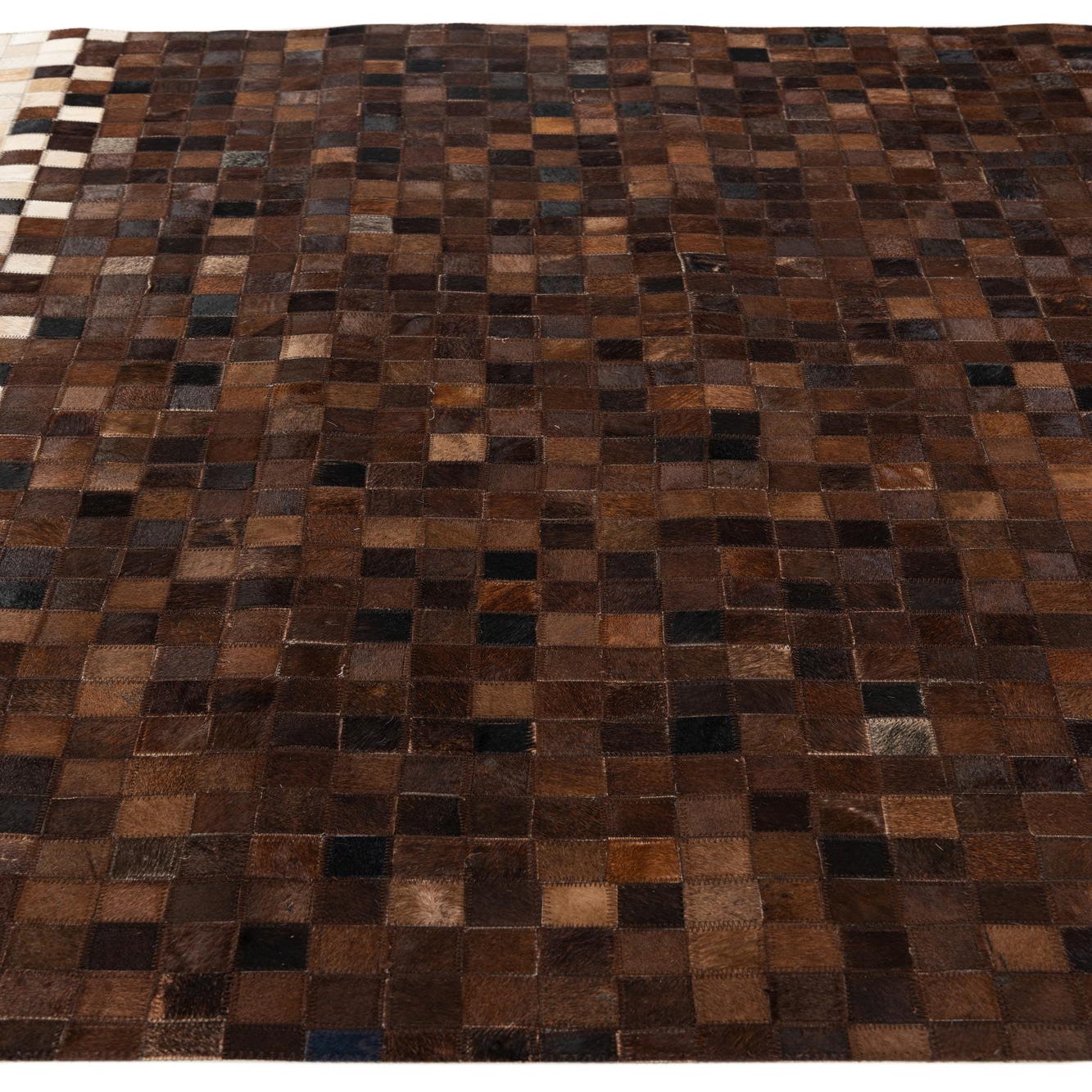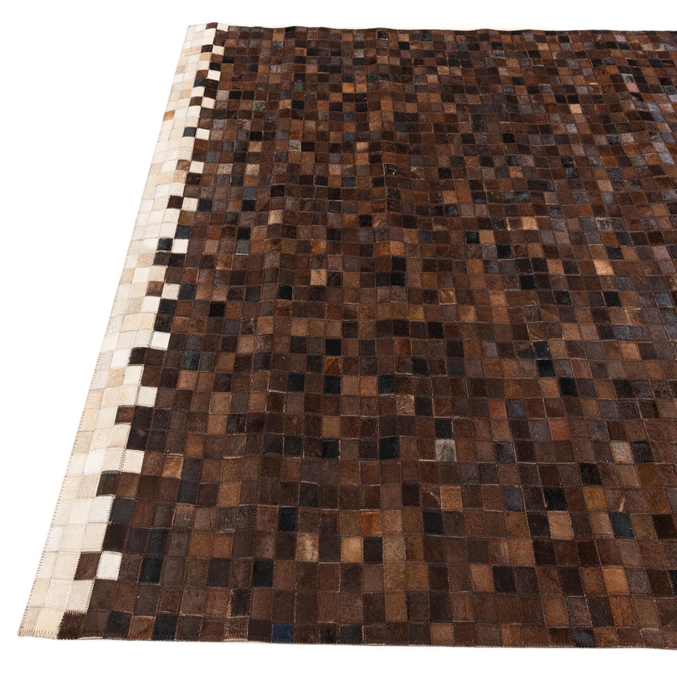 A 5x8 rectangular Cowhide Stocks rug featuring a patchwork geometric pattern in varying shades of brown and tan, with a border of lighter squares.
