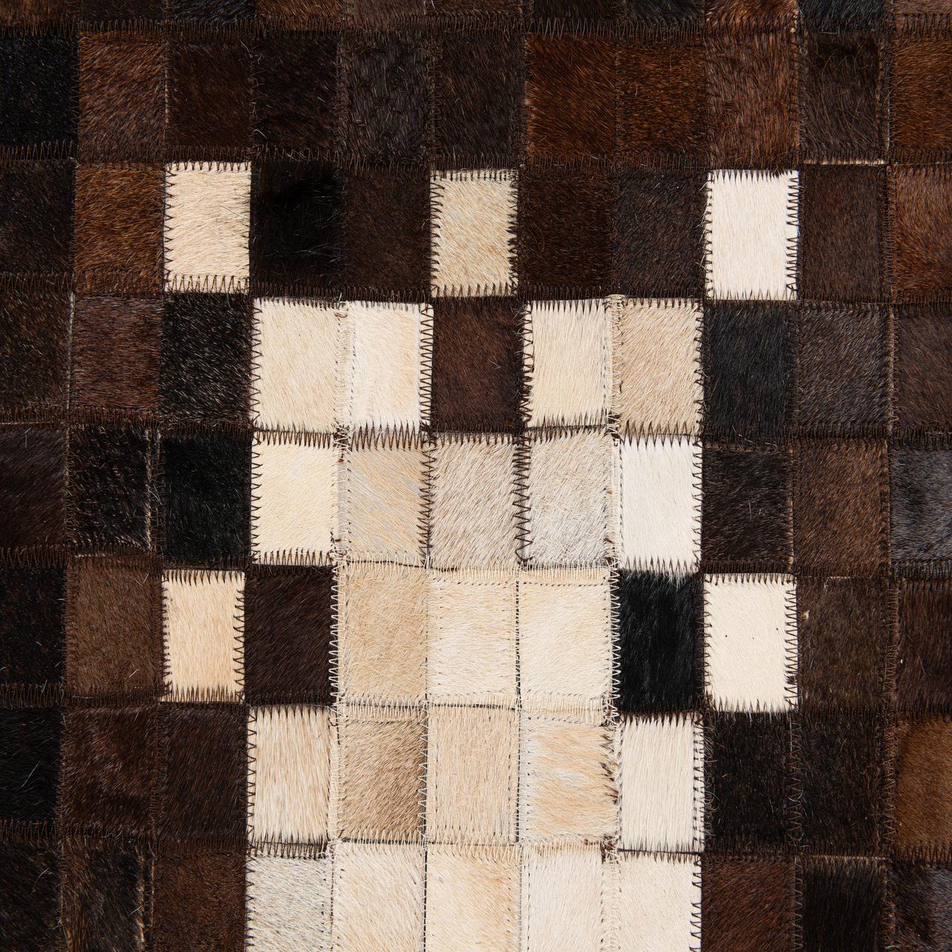 A 5x8 rectangular Cowhide Stocks rug featuring a modern mosaic pattern of brown and tan cowhide squares with a light border.