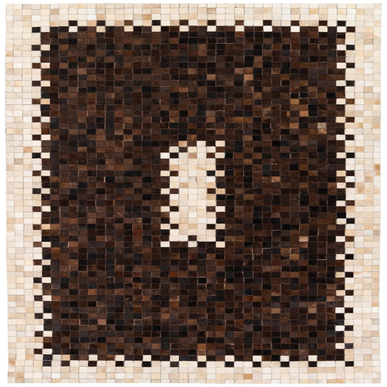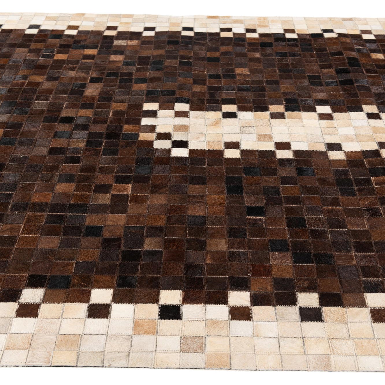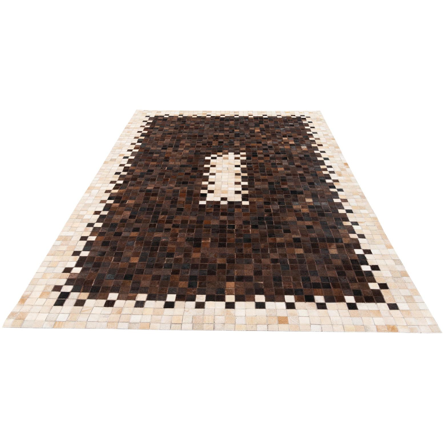 A rectangular 5x8 modern cowhide rug in shades of brown and tan, featuring a checkered border and a central abstract design.