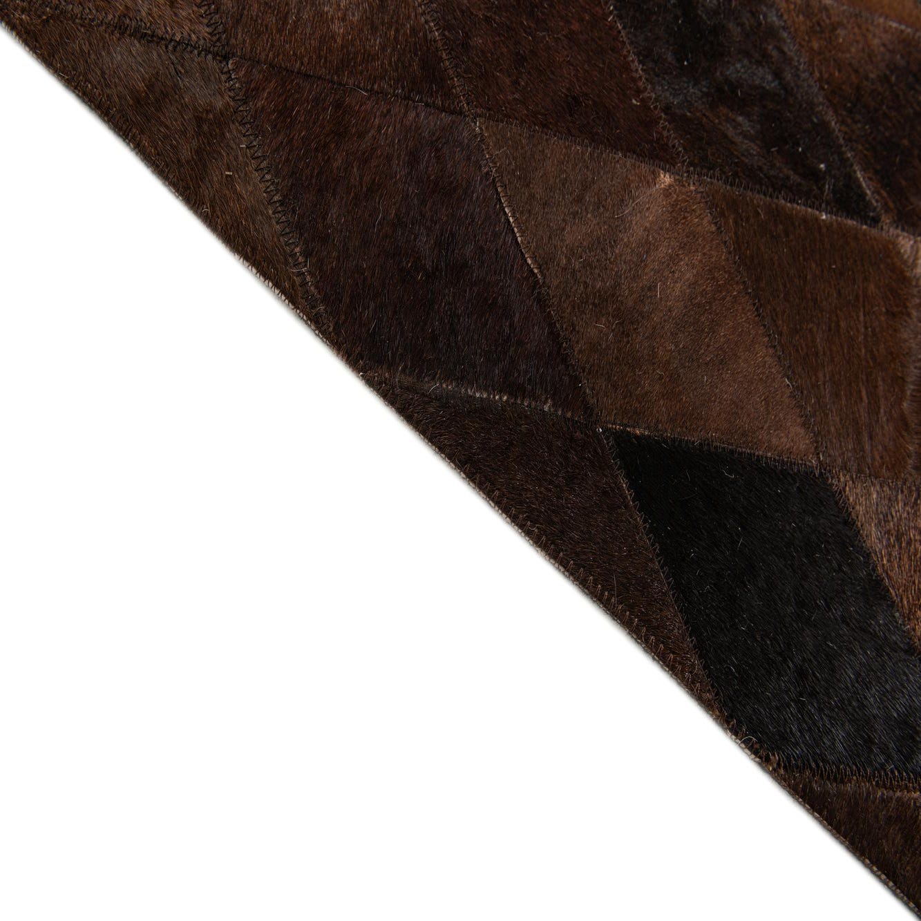 A 5x8 rectangular Cowhide Stocks rug by Rugs.com featuring a geometric patchwork of various brown and tan diamond-shaped cowhide pieces.