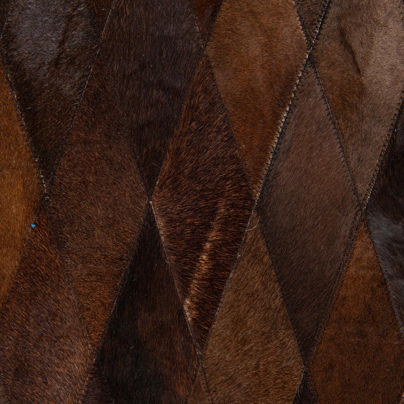 A 5x8 rectangular Cowhide Stocks rug from Rugs.com, featuring a modern diamond pattern in various shades of brown and tan.