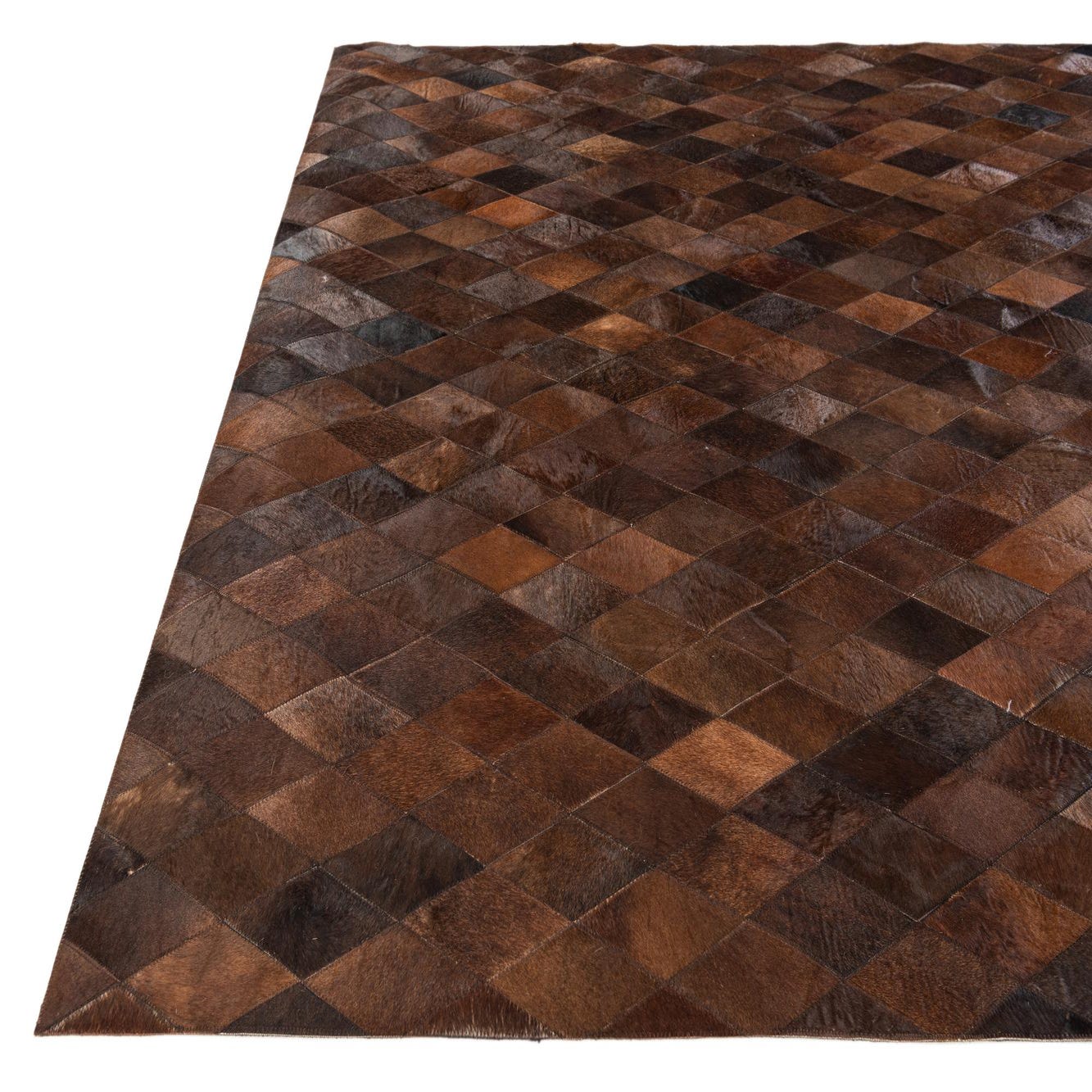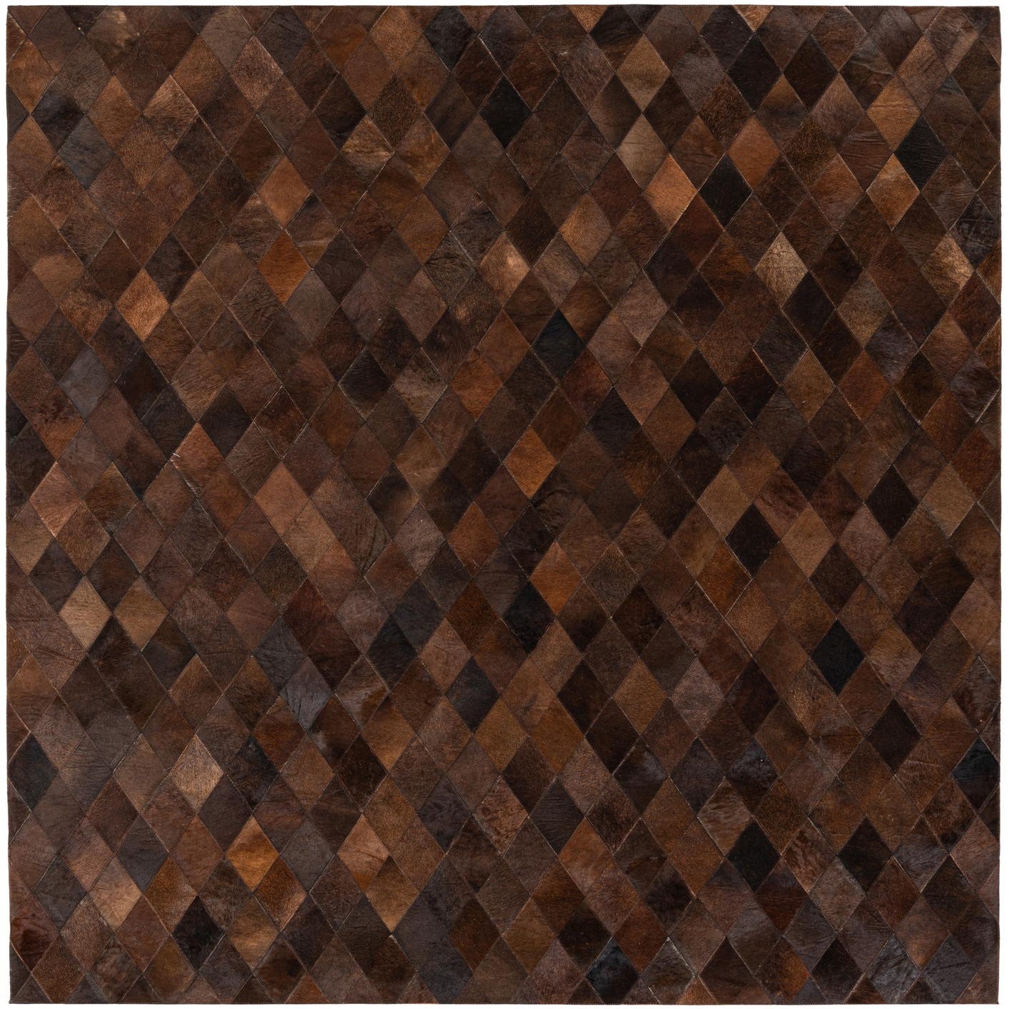 A 5x8 rectangular Cowhide Stocks rug featuring a modern diamond pattern in various shades of brown and tan.