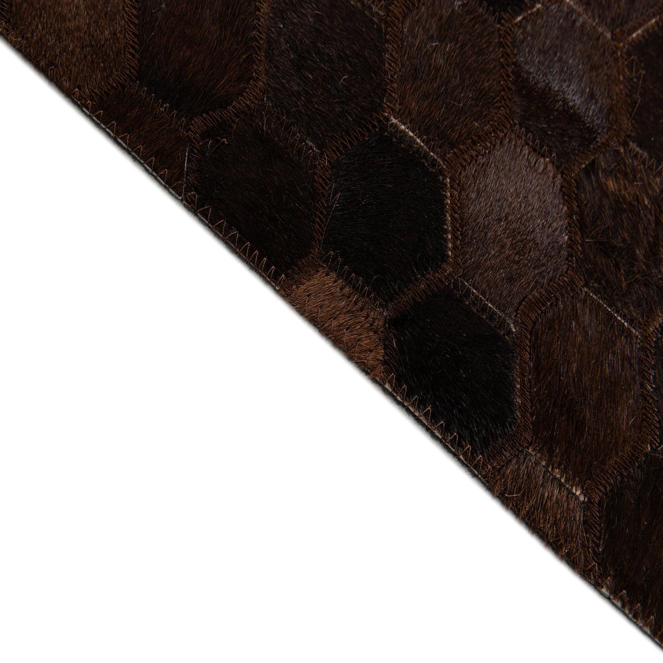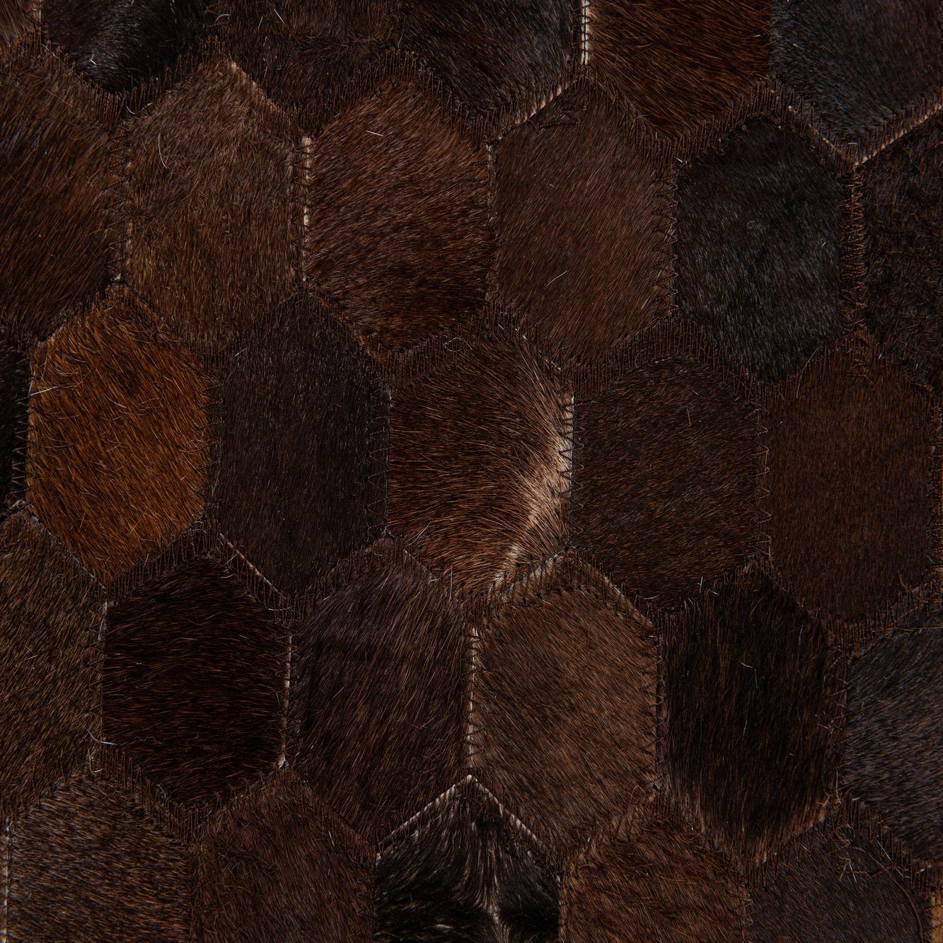 A 5x8 rectangular Cowhide Stocks rug in varying shades of brown and tan, featuring a modern hexagonal patchwork pattern, ideal for a living room or bedroom.
