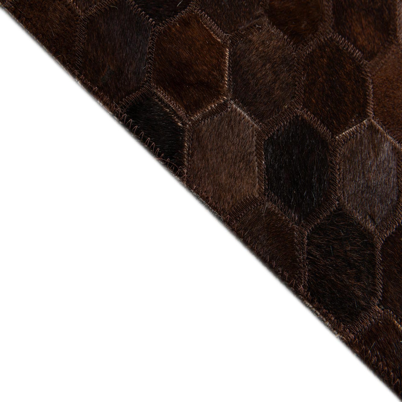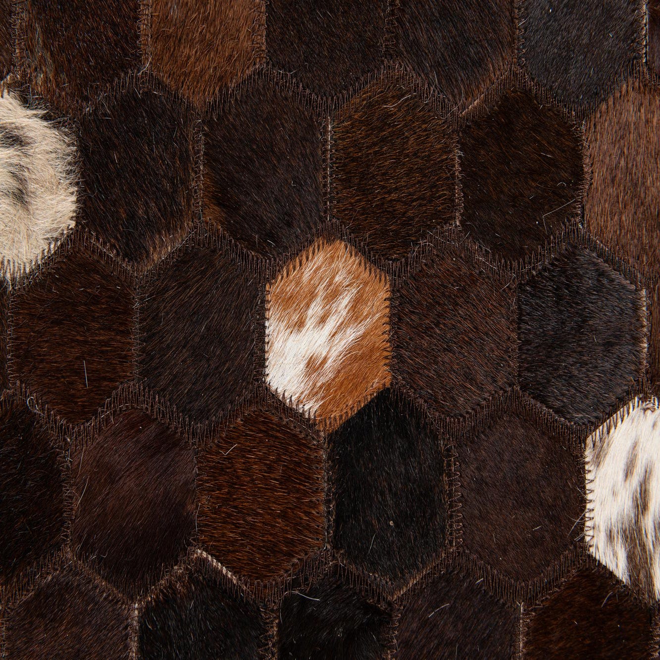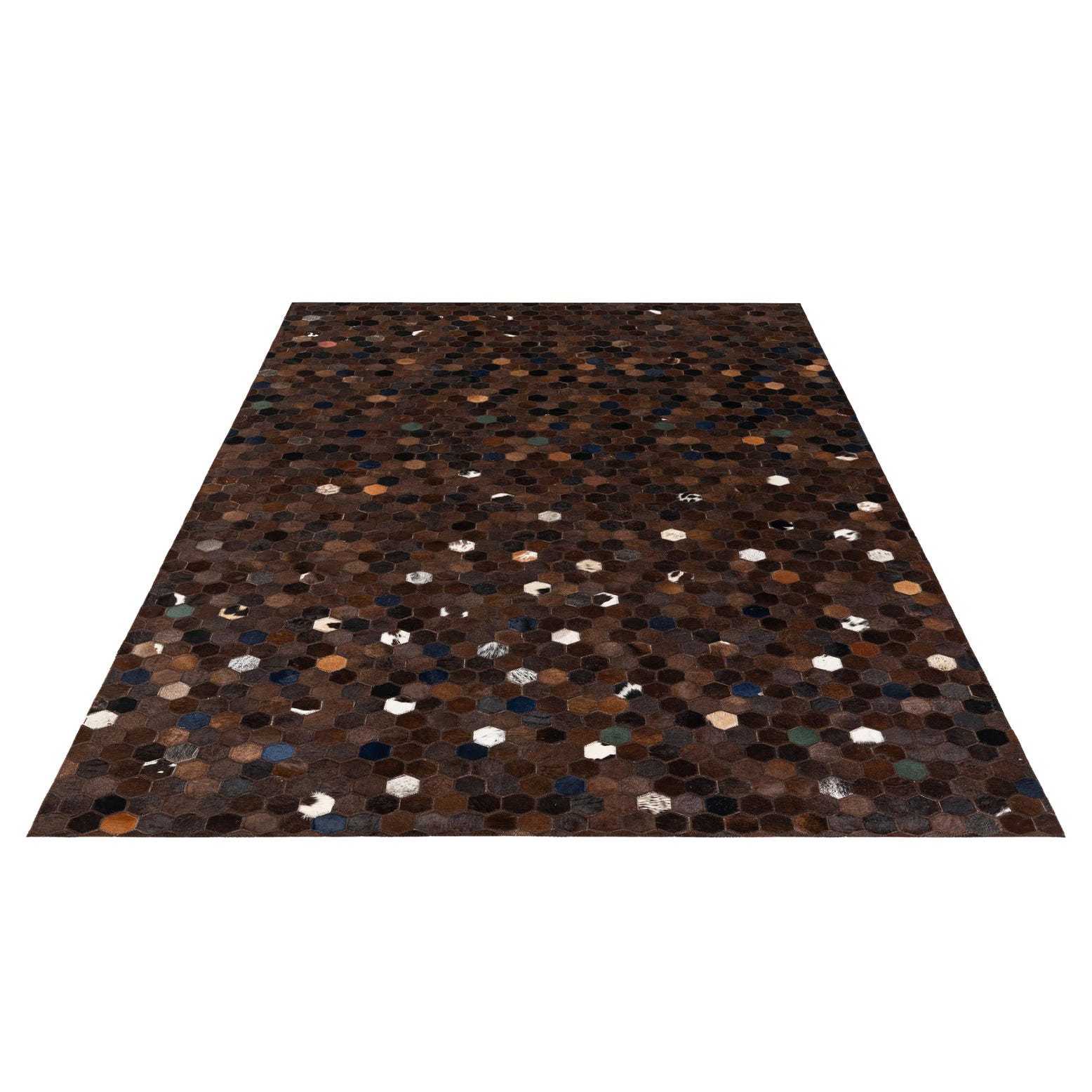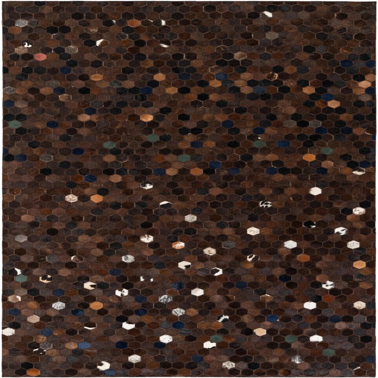 A 5x8 rectangular Cowhide Stocks rug featuring a modern hexagonal pattern in various shades of brown, tan, black, white, blue, and green.