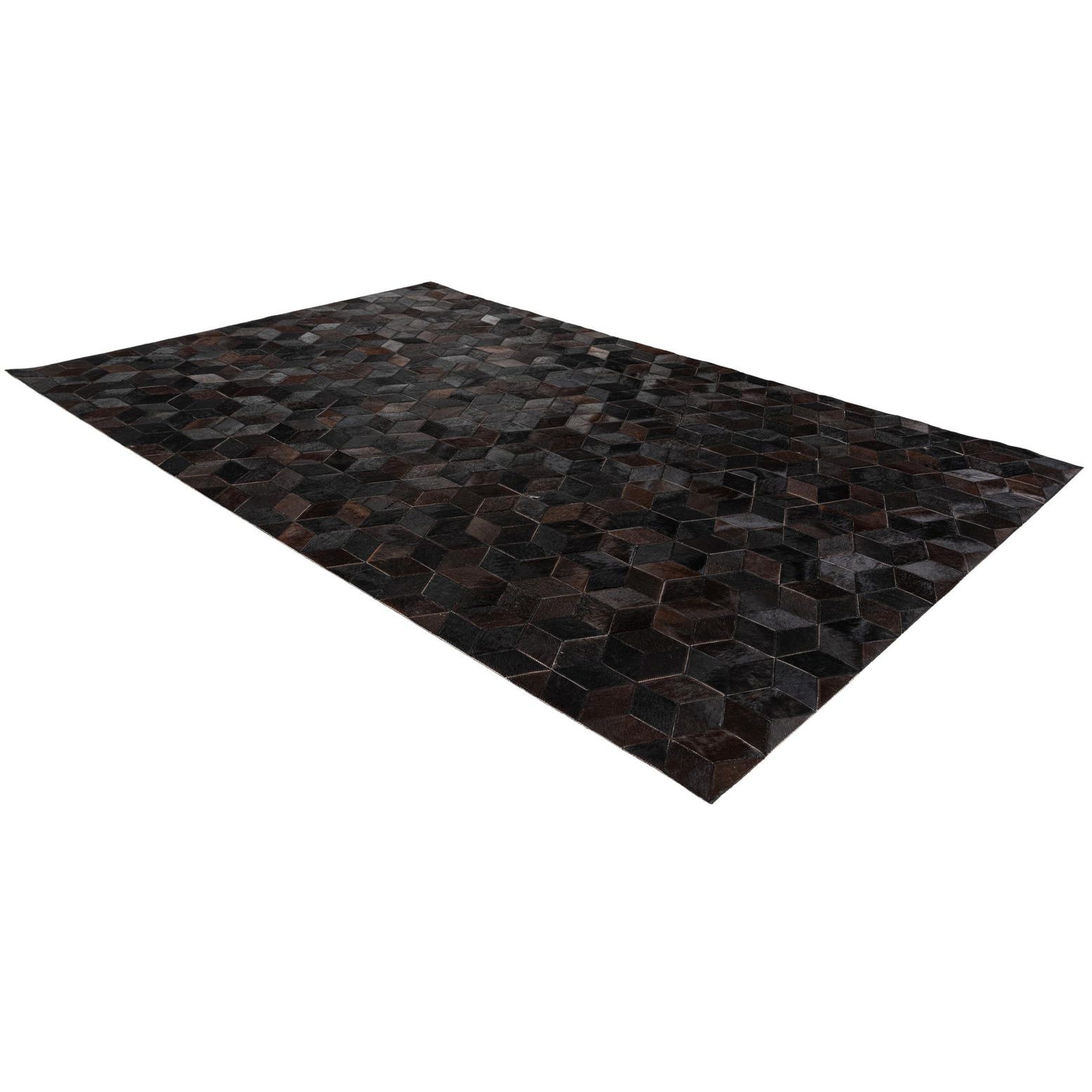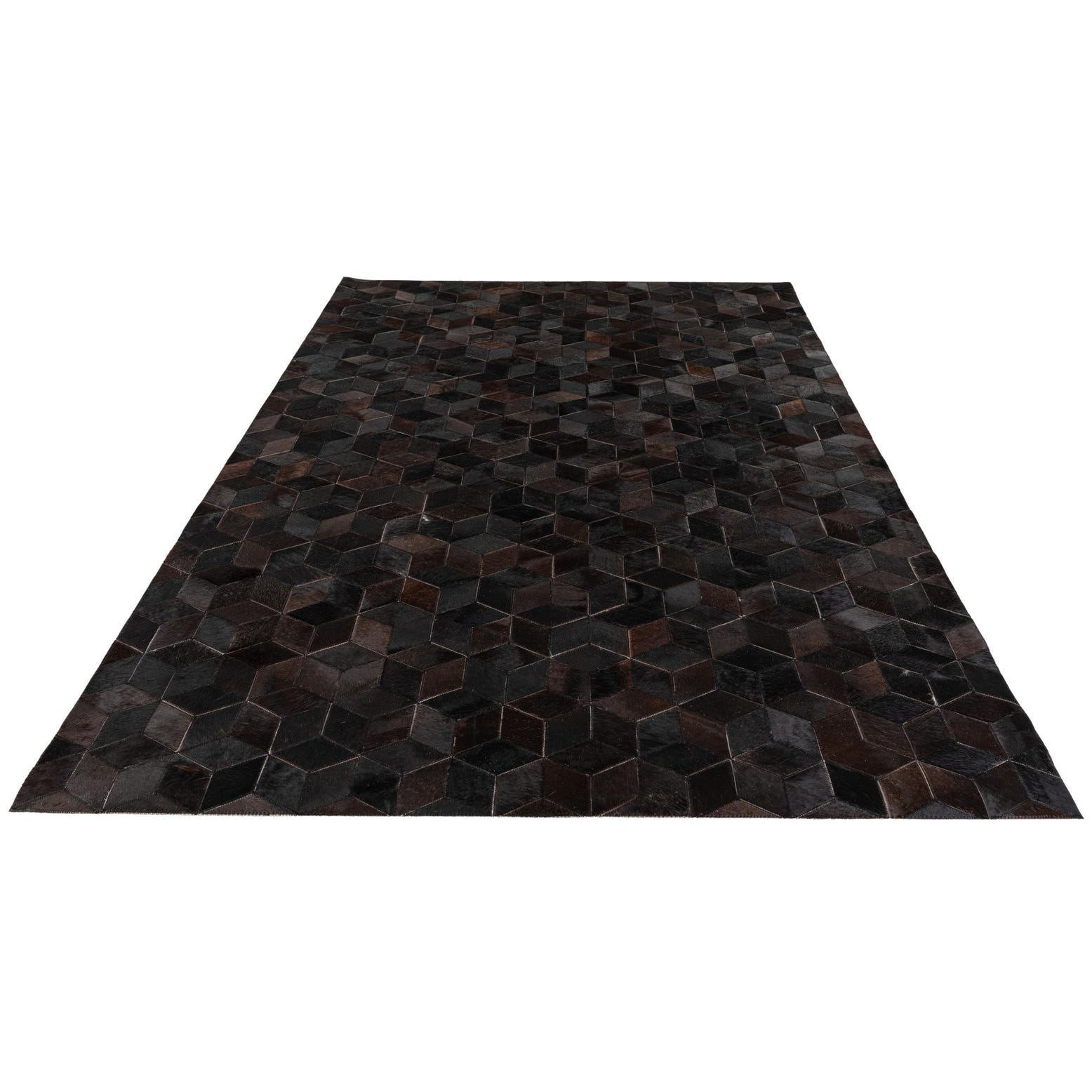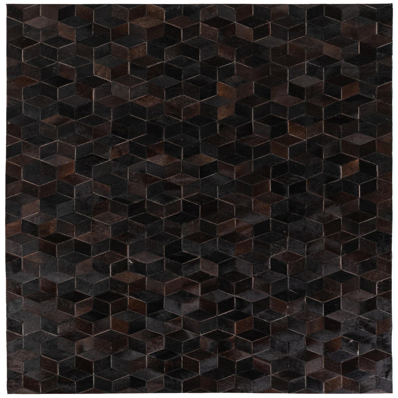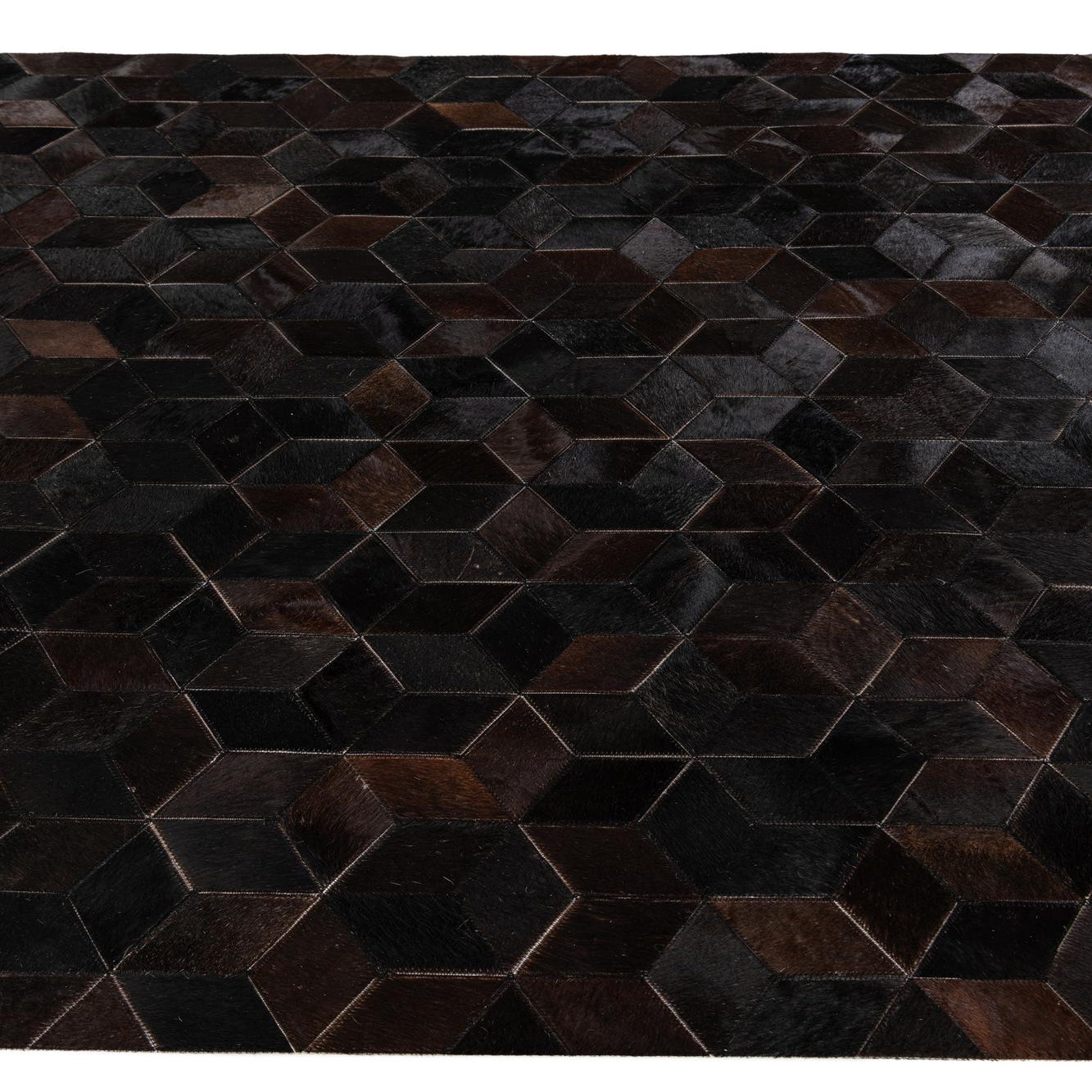 A rectangular 5x8 modern area rug featuring a geometric cube pattern in varying shades of brown and tan cowhide.