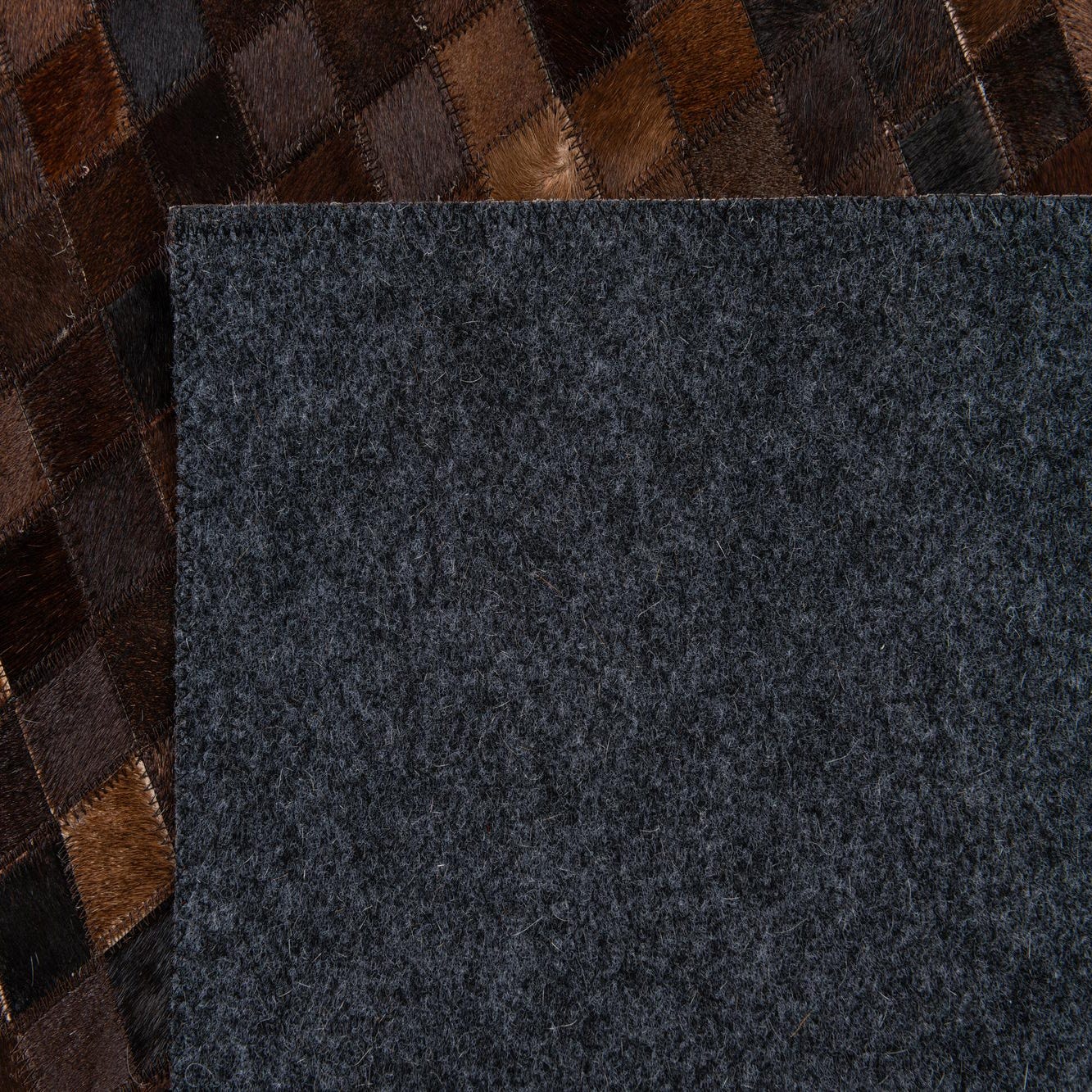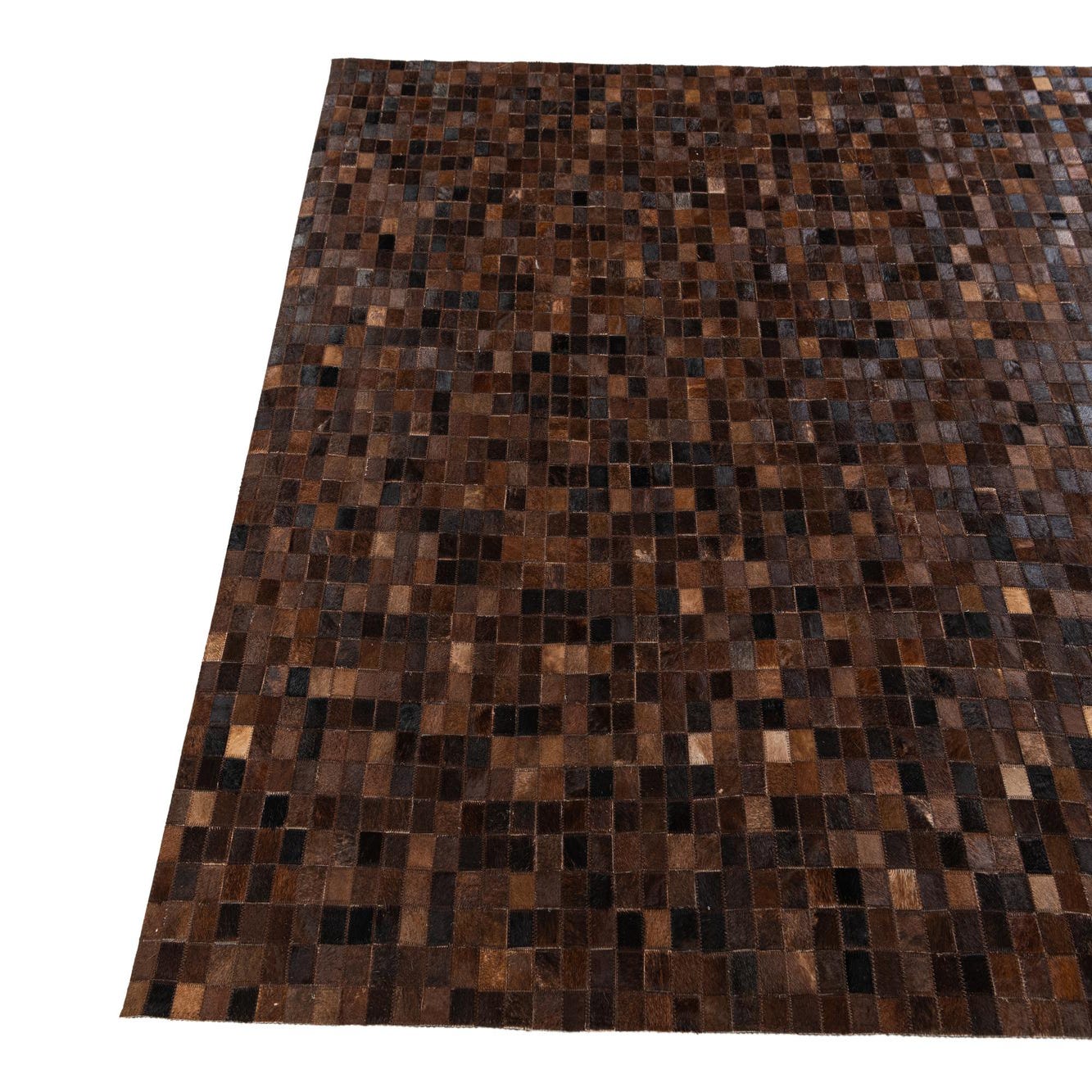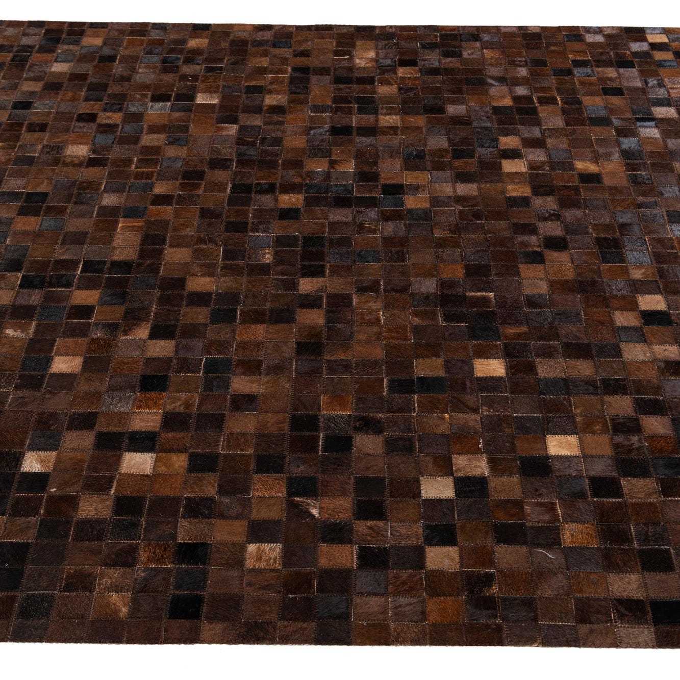 A 5x8 rectangular Cowhide Stocks rug featuring a modern patchwork of varied brown and tan cowhide squares.