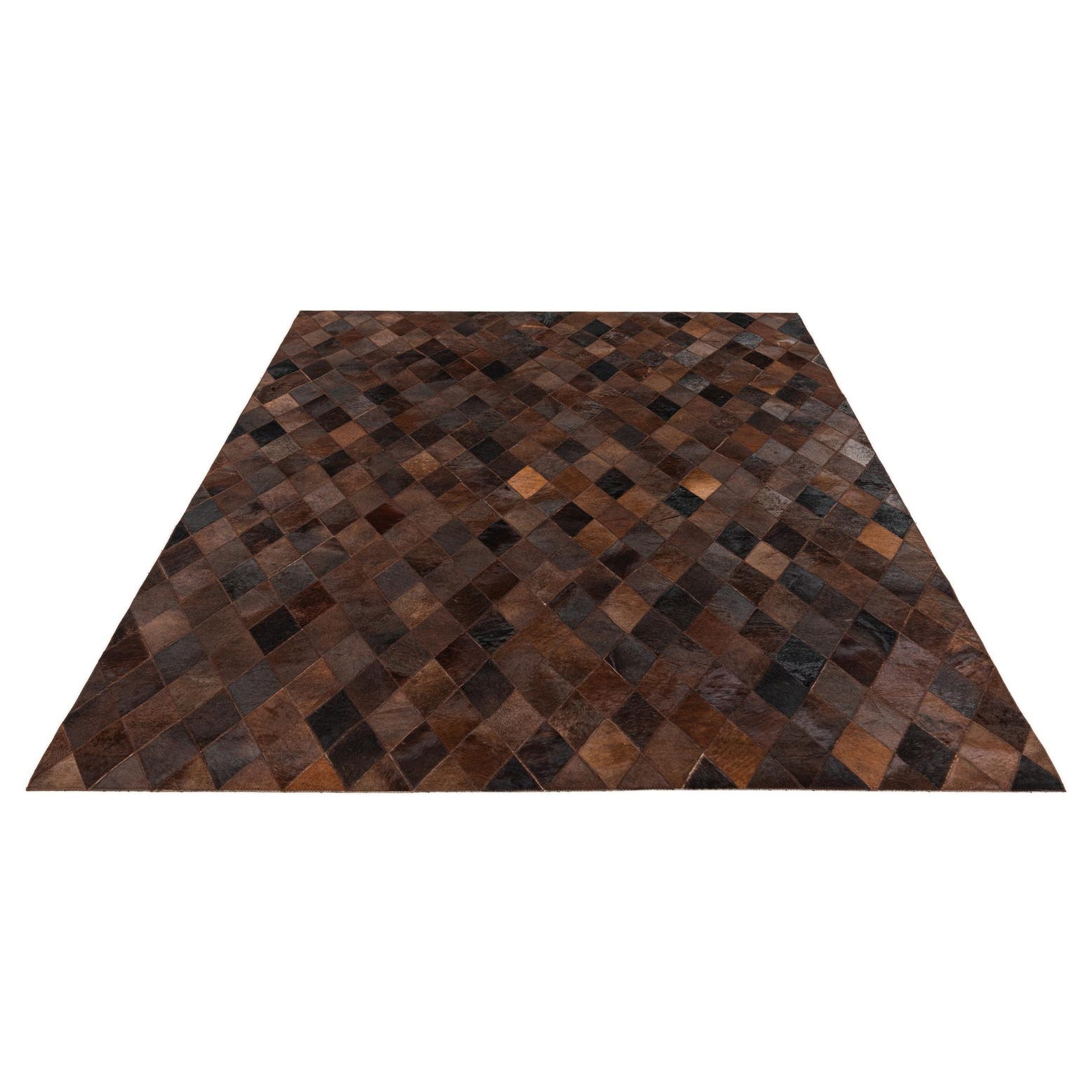 A 5x8 rectangular Cowhide Stocks rug by Rugs.com, featuring a modern diamond pattern in varying shades of brown and tan, suitable for a living room.