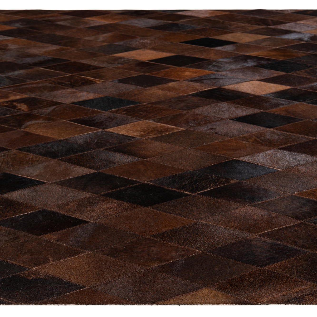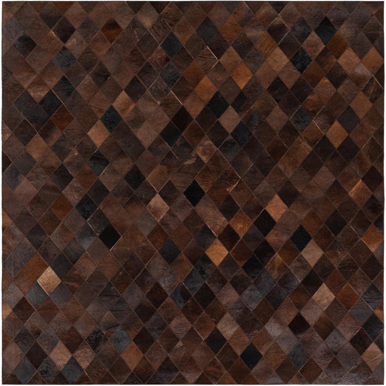 Hand made of cowhide & leather, this rug is assembled from small diamond-shaped patches stitched together to form a tight harlequin pattern. The background is a rich Dark Brown, punctuated by varying Brown tones that range from warm chestnut to deep chocolate and near-black accents. The hair-on-hide surface has a low, natural nap with a soft tactile feel and a subtle sheen that catches light differently across each patch, while visible grain and slight color variation add natural character.