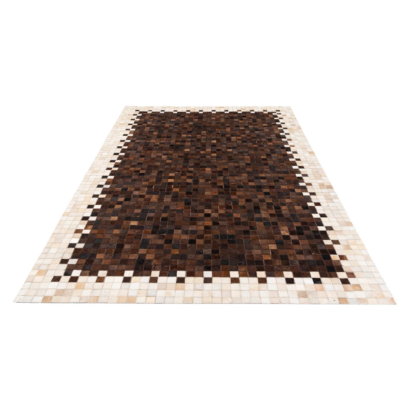 A 5x8 rectangular Cowhide Stocks rug featuring a patchwork geometric pattern in varying shades of brown and tan, with a lighter tan border.