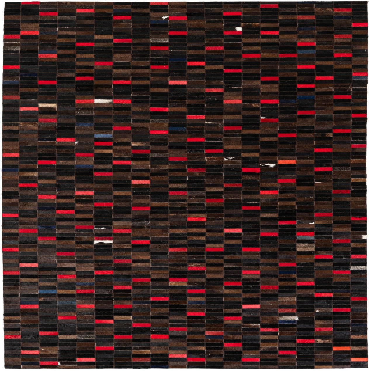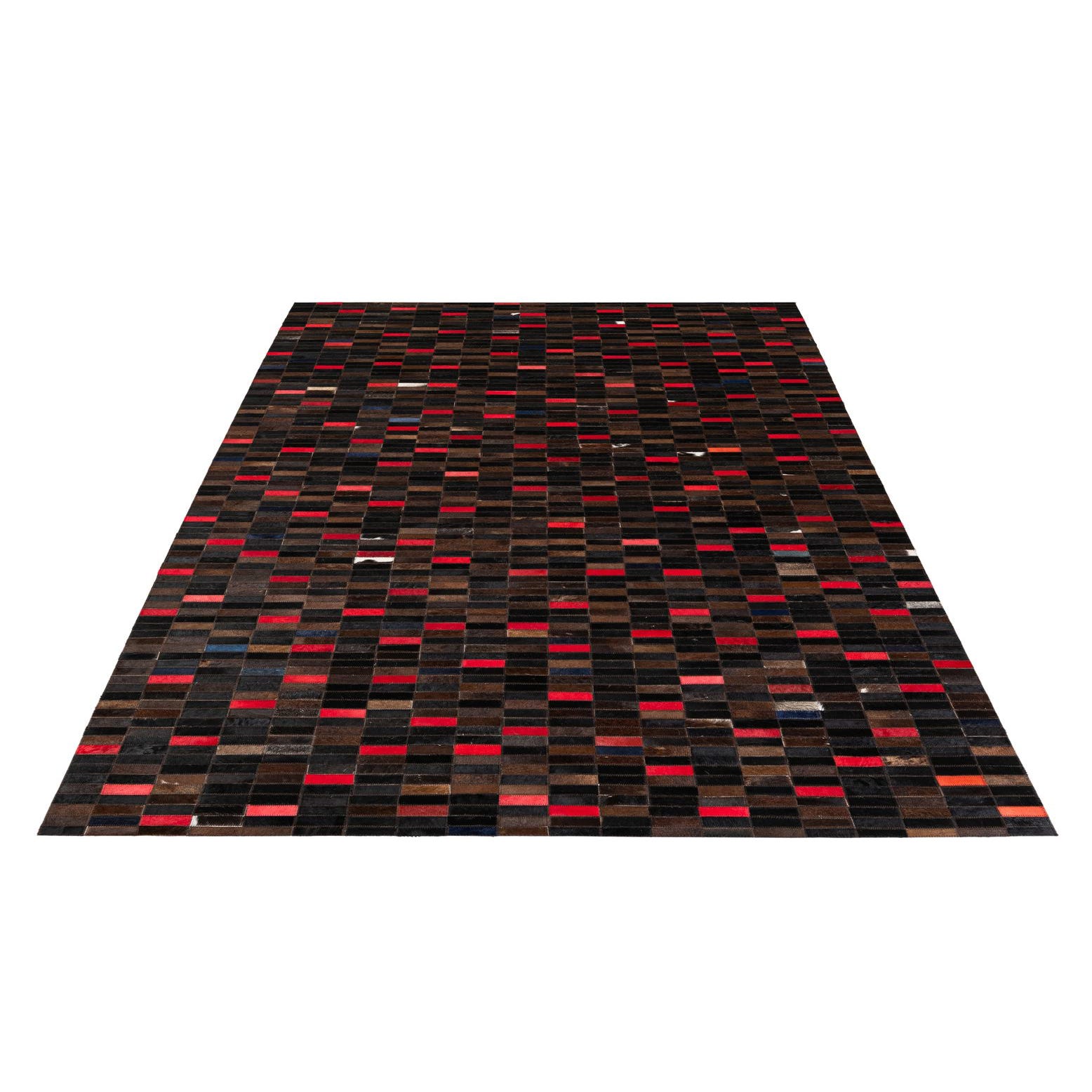 A 5x8 rectangular Cowhide Stocks rug featuring a modern patchwork of brown, tan, black, and red cowhide squares, ideal for a living room.