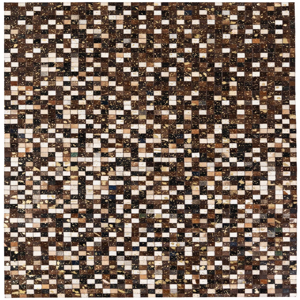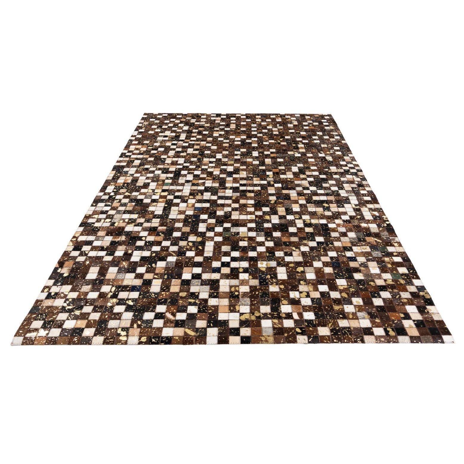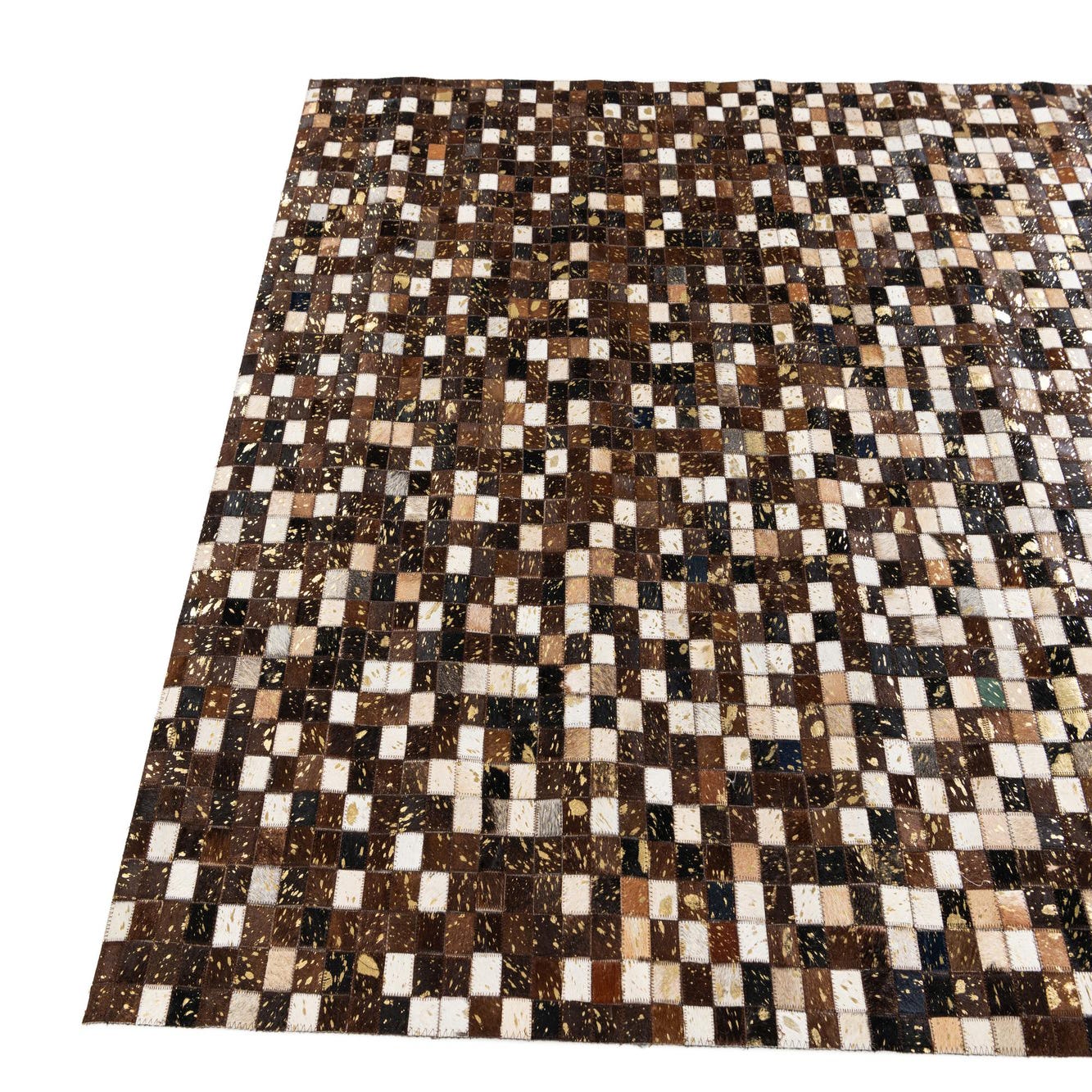 A rectangular 5x8 modern cowhide rug featuring a checkerboard pattern of brown, tan, and white squares with gold speckles.