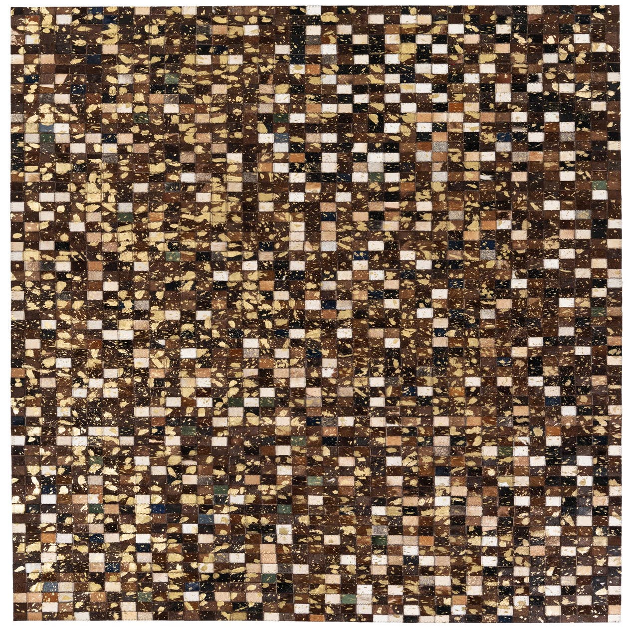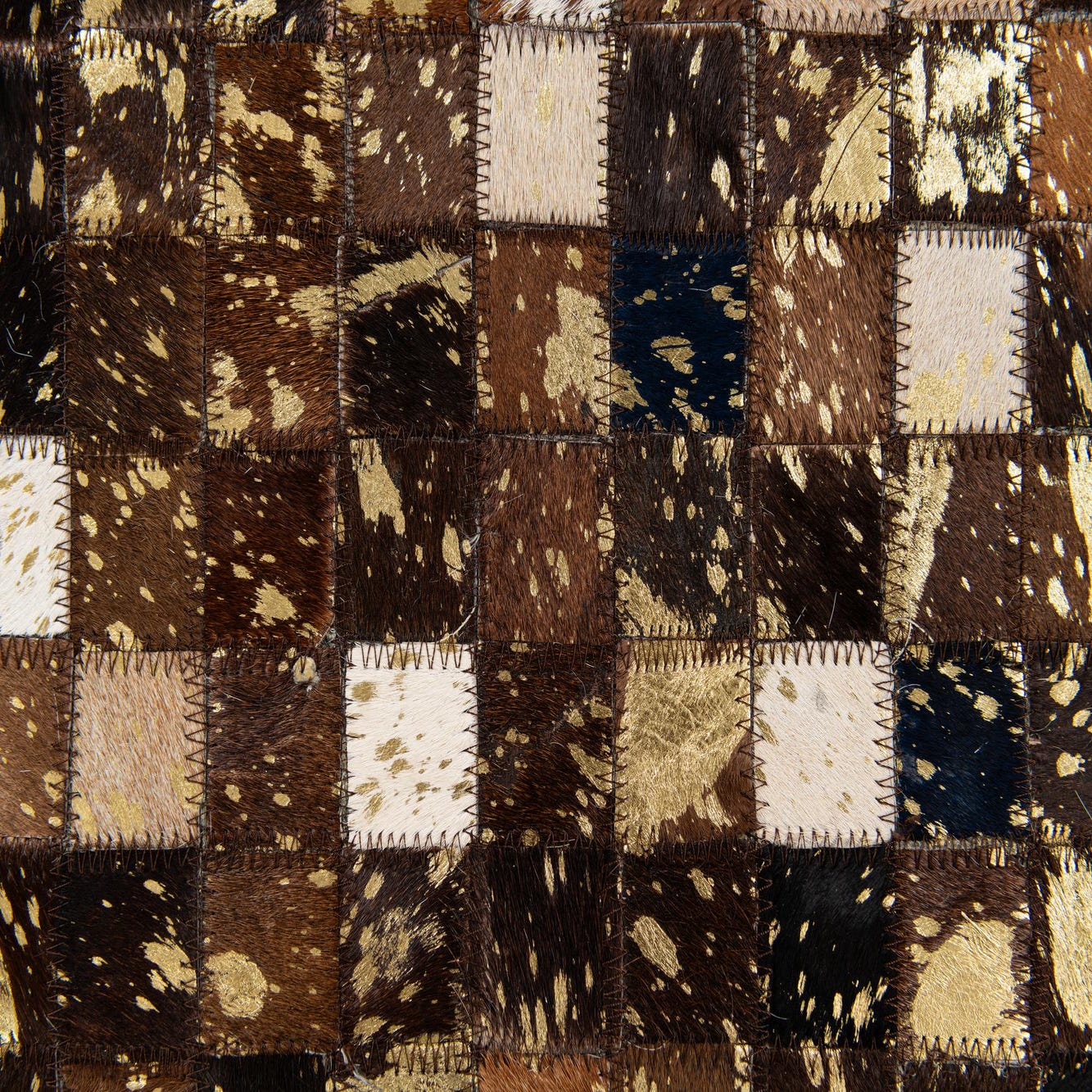 A rectangular 5x8 modern cowhide rug featuring a checkerboard pattern of brown, tan, and white squares with gold metallic accents.