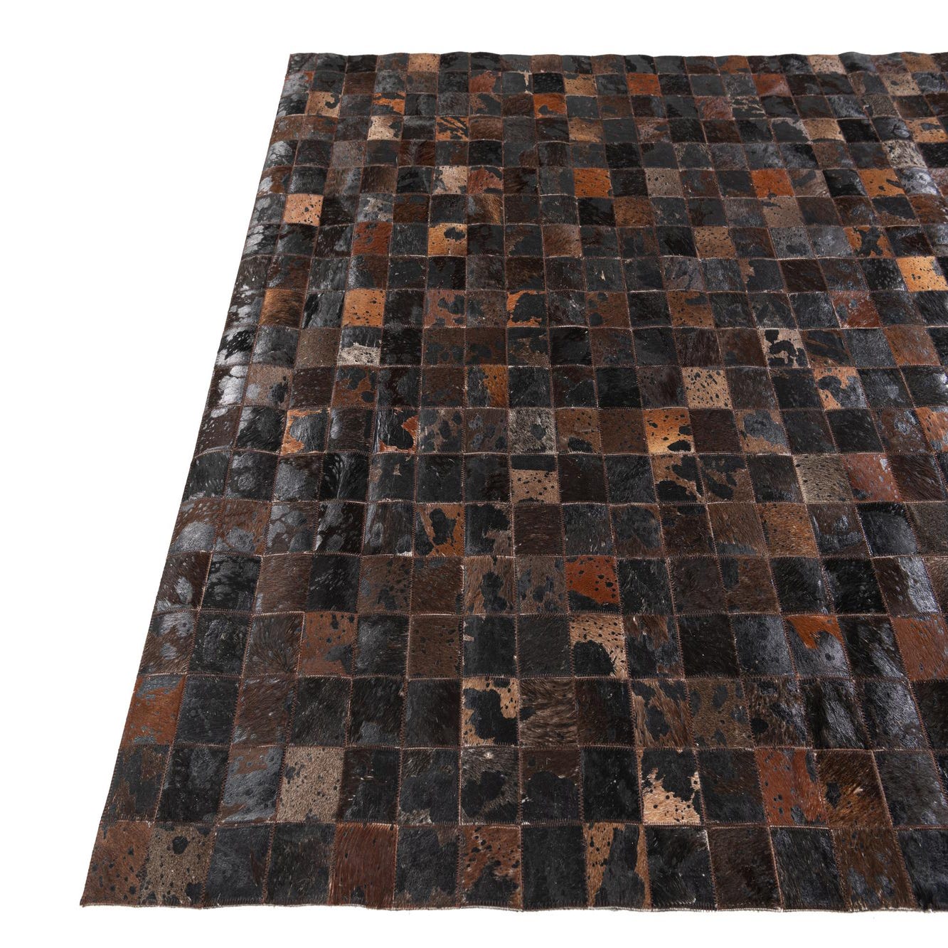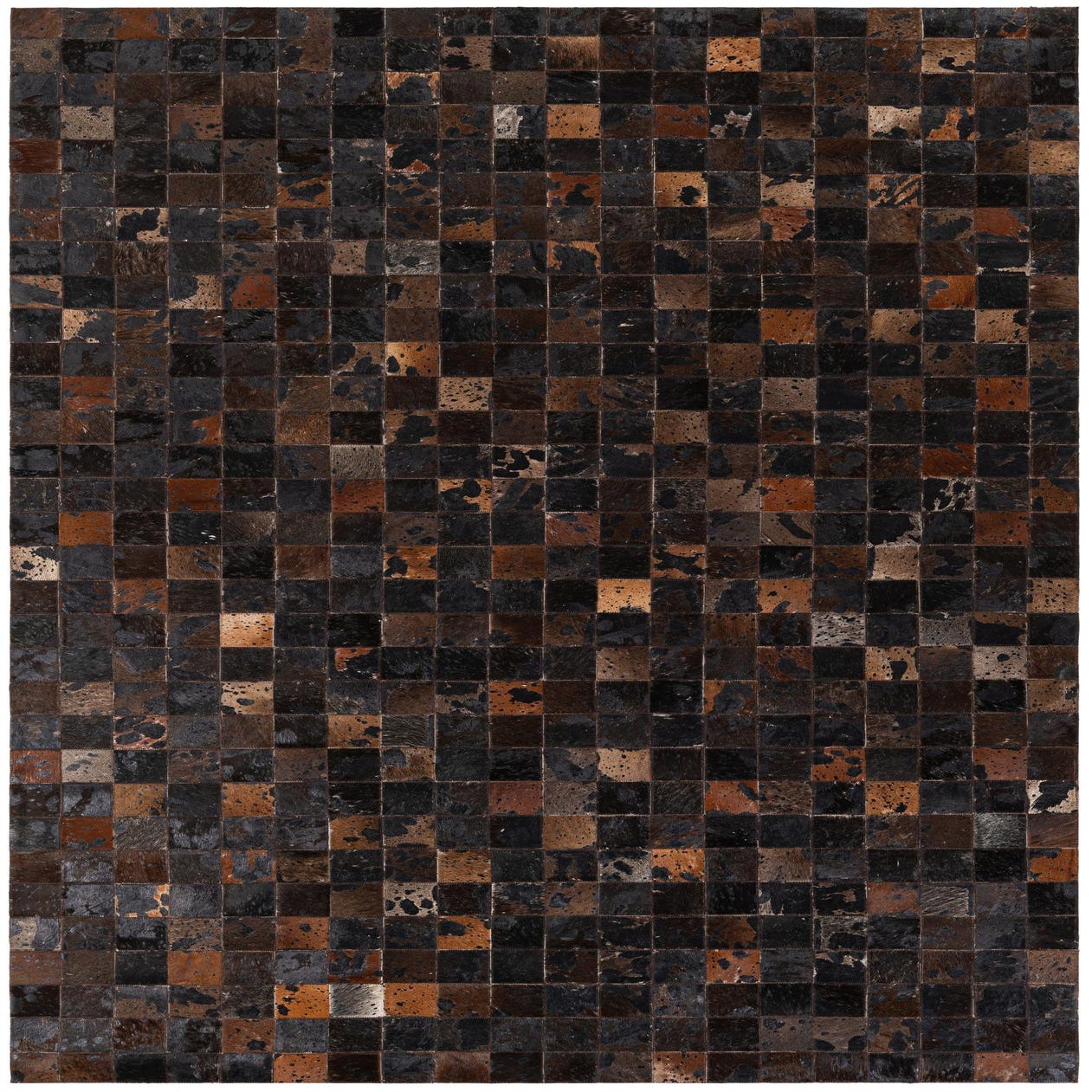 A 5x8 rectangular Cowhide Stocks rug featuring a modern patchwork of brown and tan cowhide squares, perfect for a living room.