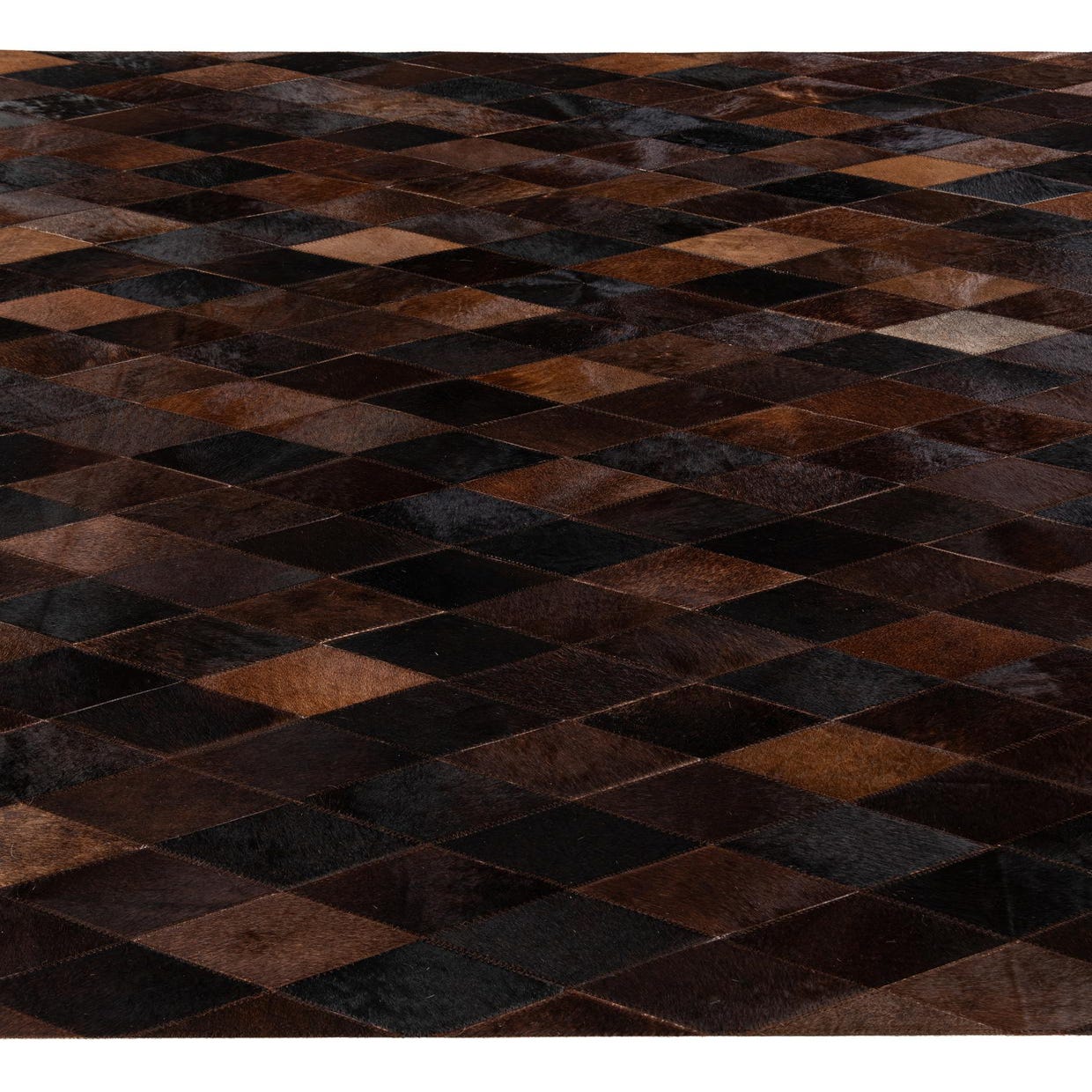 A 5x8 rectangular Cowhide Stocks rug featuring a modern diamond pattern in various shades of brown and tan.