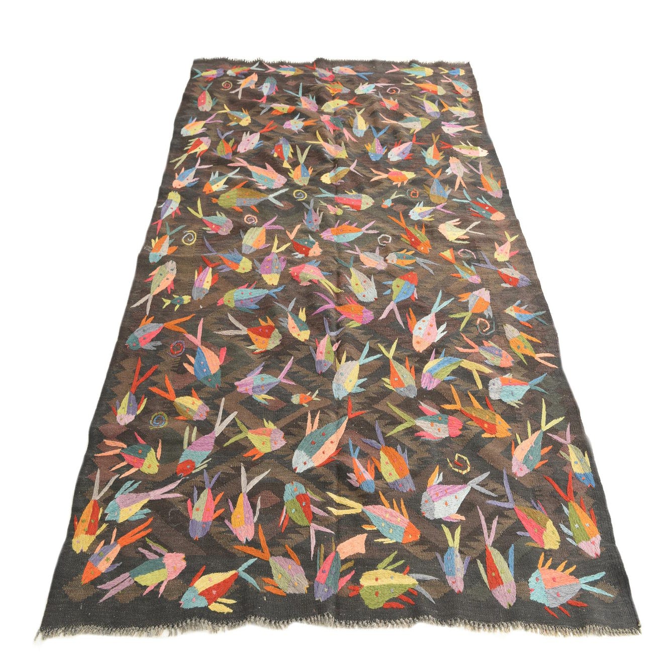 A 5x8 rectangular Kilim Suzani rug featuring a dark brown background with a subtle tribal pattern, adorned with numerous colorful embroidered fish in various bright hues.