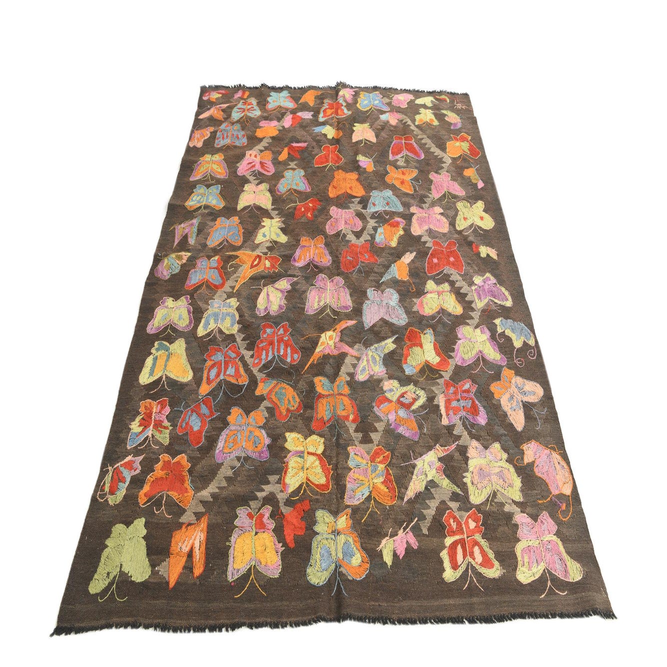 A 5x8 rectangular Kilim Suzani rug featuring a dark brown background with colorful embroidered butterflies in various hues like red, blue, yellow, and pink, over a subtle tan tribal pattern.