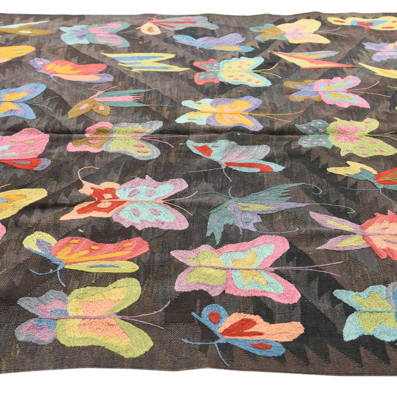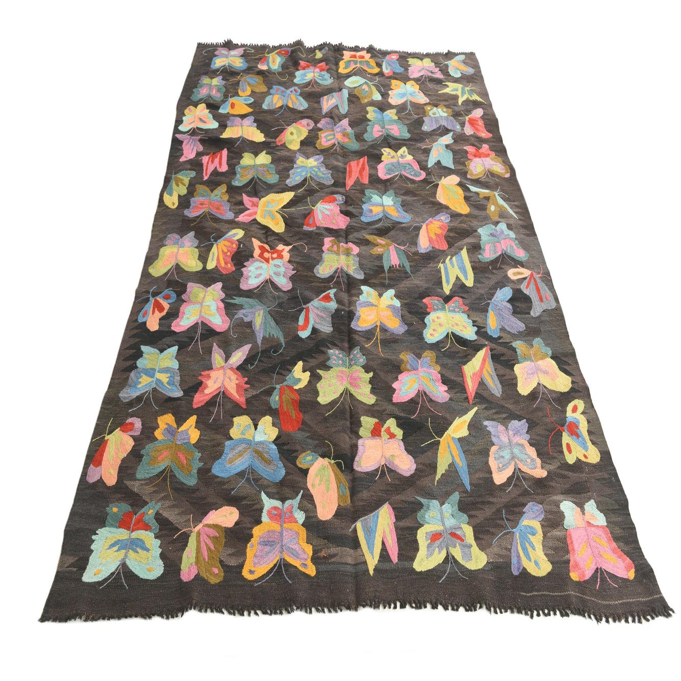 A 5x8 rectangular brown Kilim Suzani rug with vibrant, colorful butterfly and moth patterns, ideal for a living room.