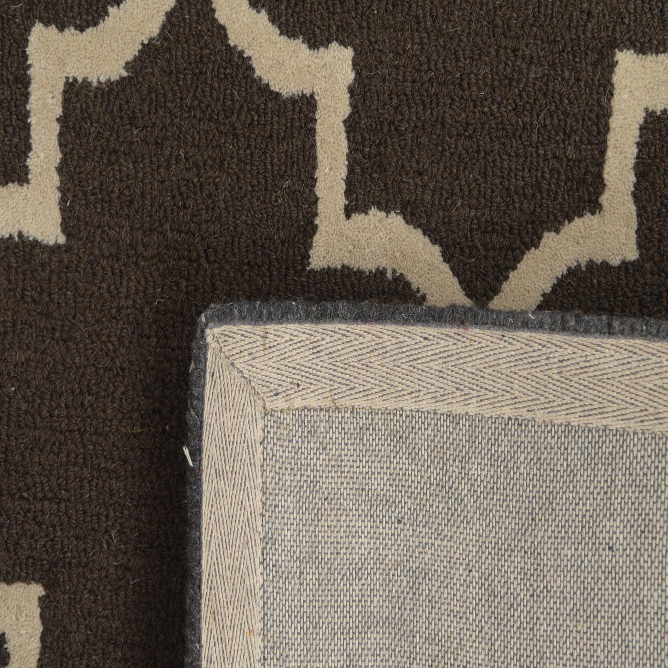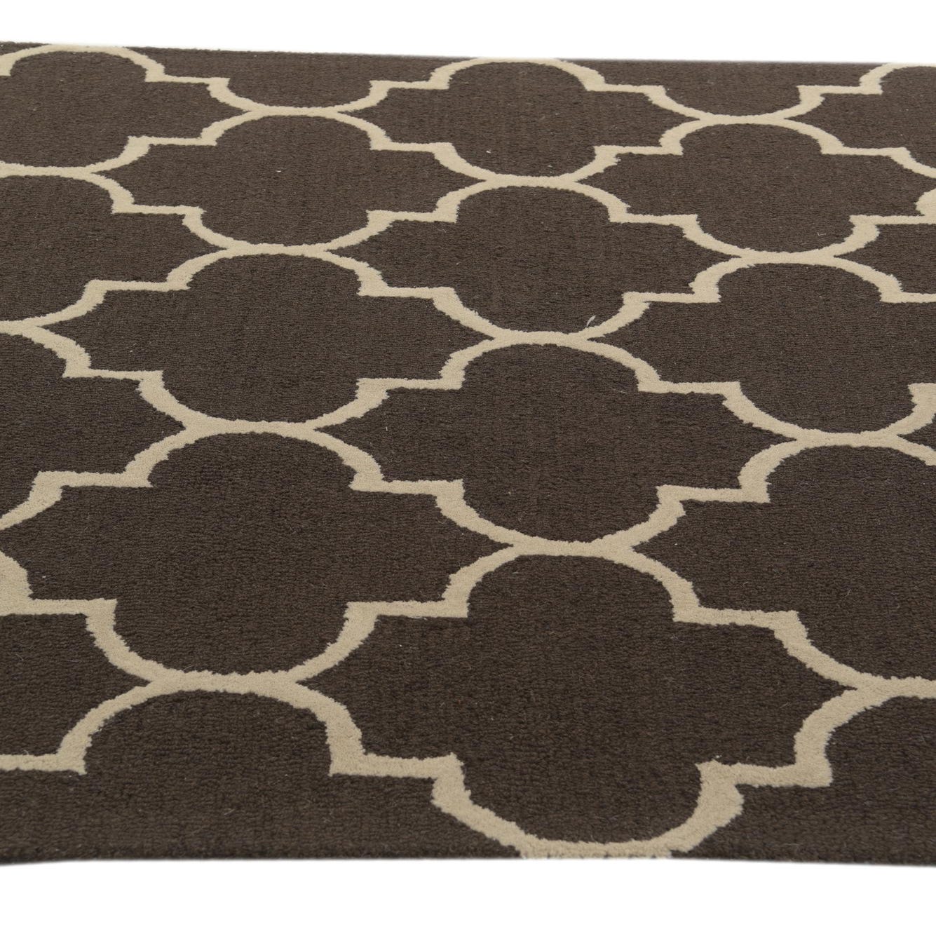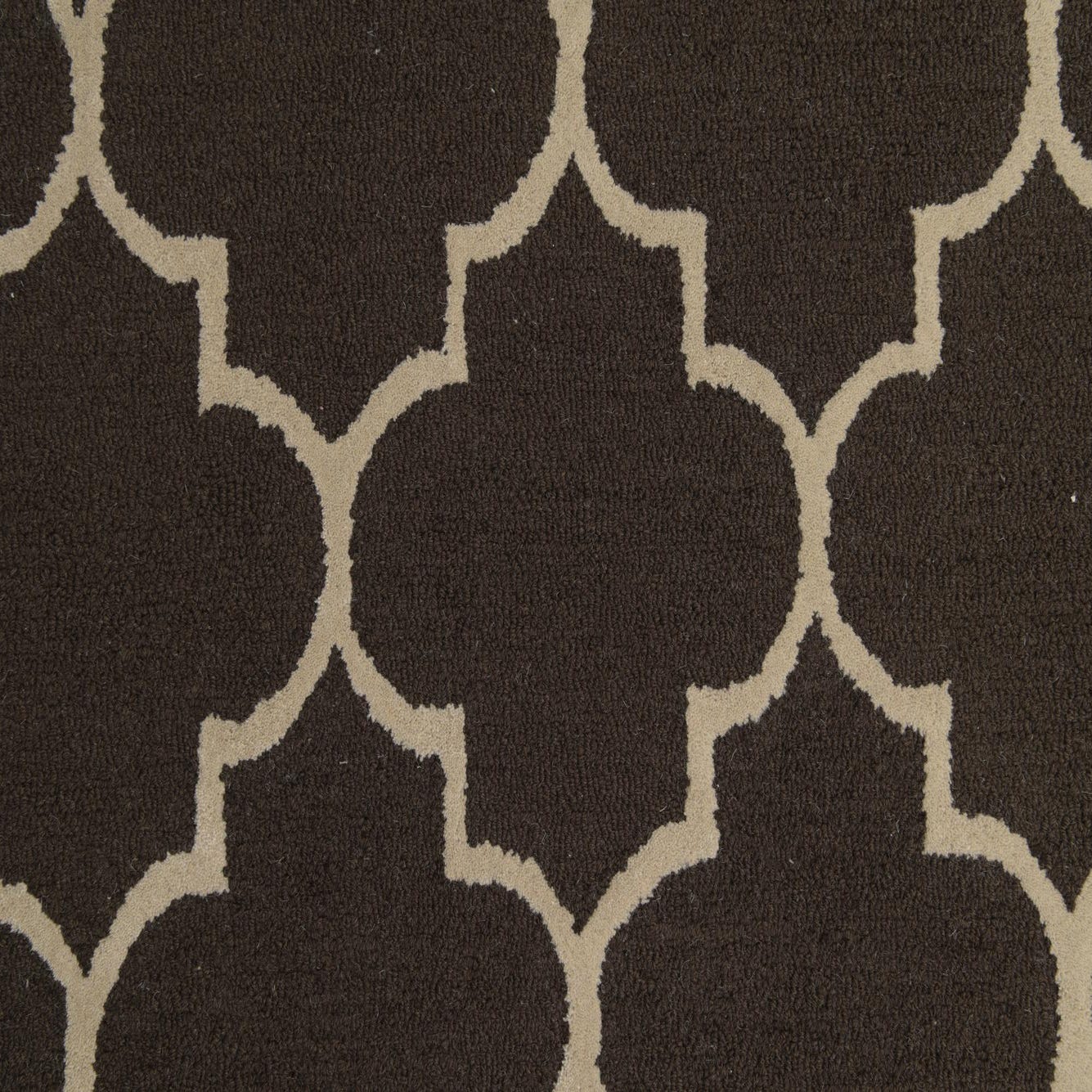 The Luna Hand Tufted rug is a compelling addition to a variety of interior spaces, constructed from 100% wool for a plush feel underfoot. This 5x8 rug presents a bold, graphic pattern with a trellis design in a deep dark brown, sharply contrasted against an ivory outline. The dark brown background of the rug provides a warm and inviting ambiance.
