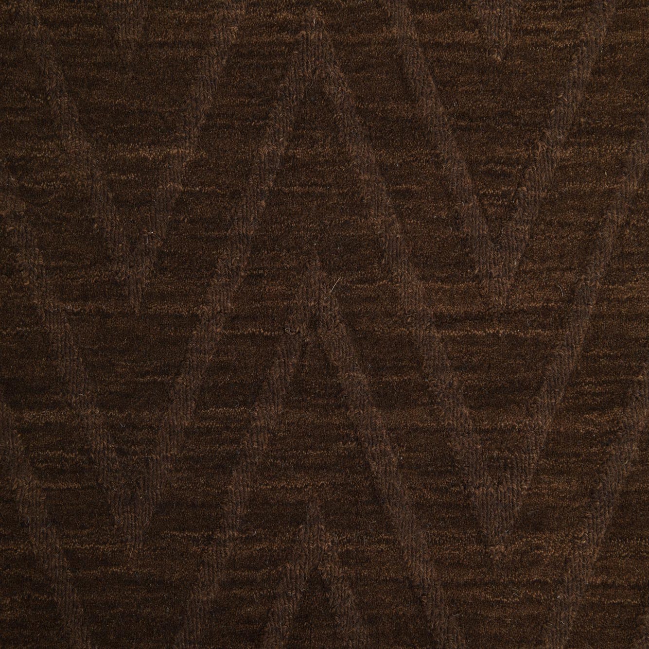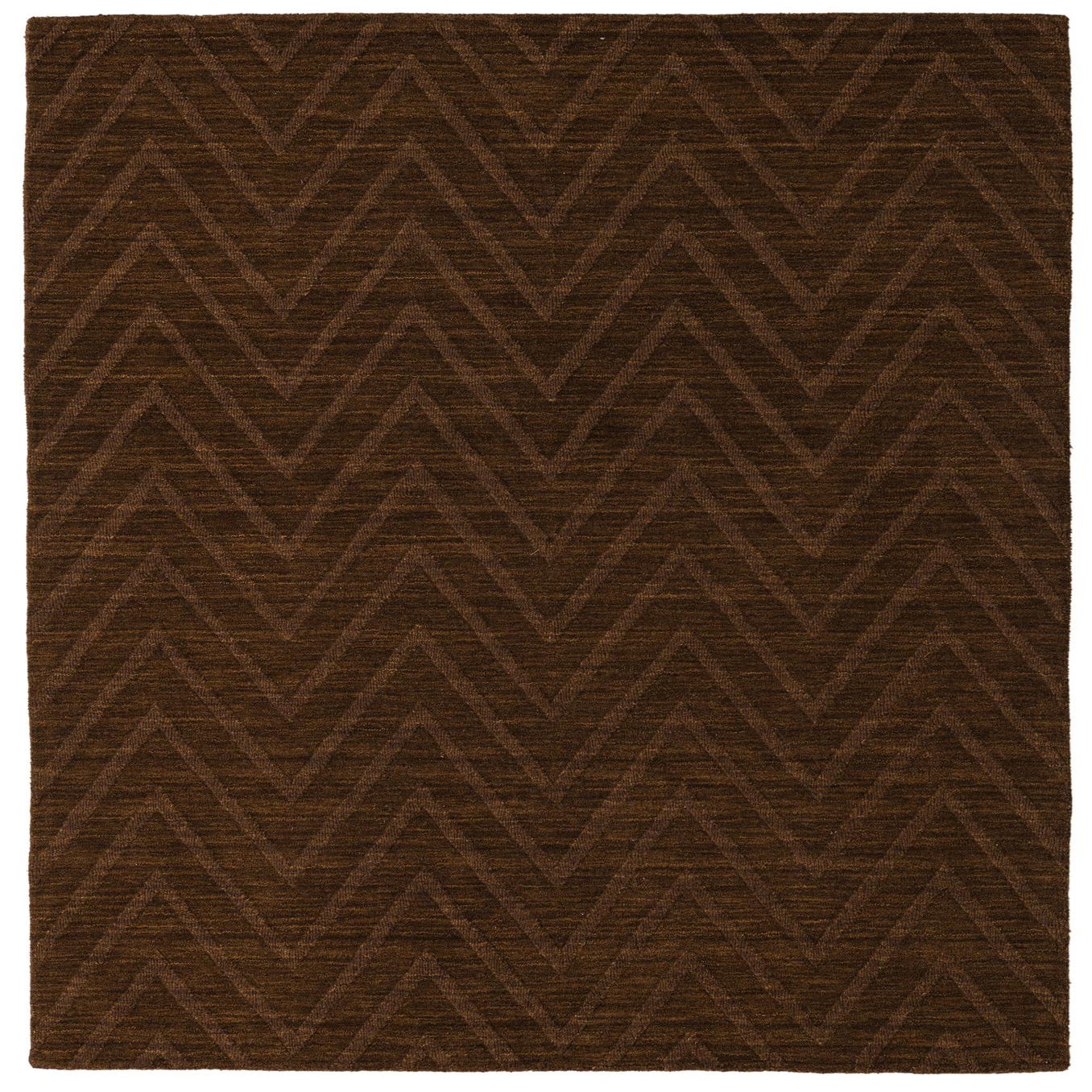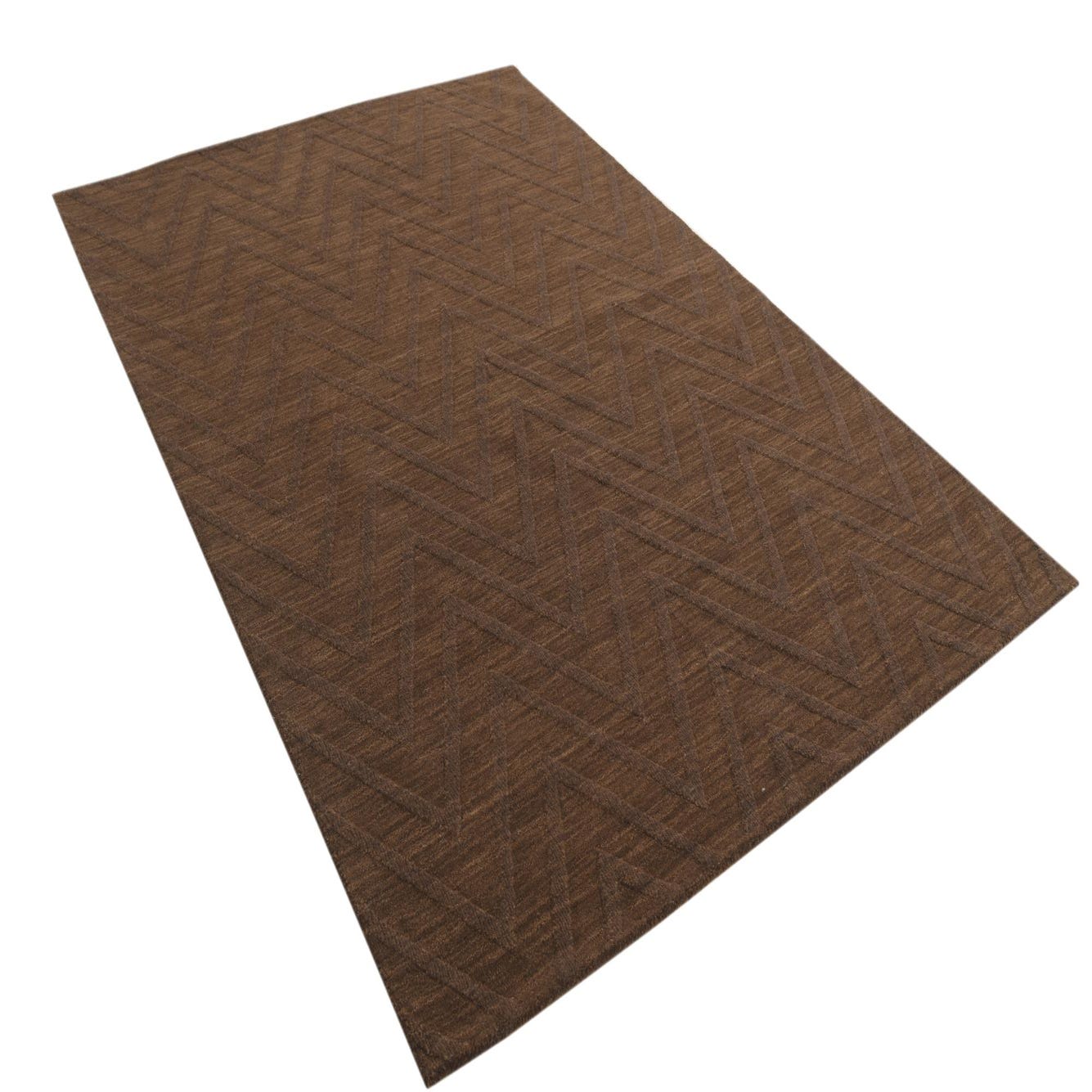 A 5x8 rectangular brown area rug with a subtle modern chevron pattern, made from wool and cotton.