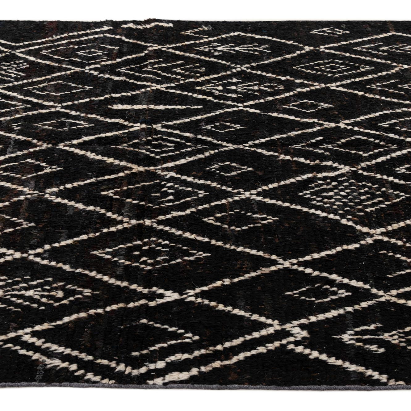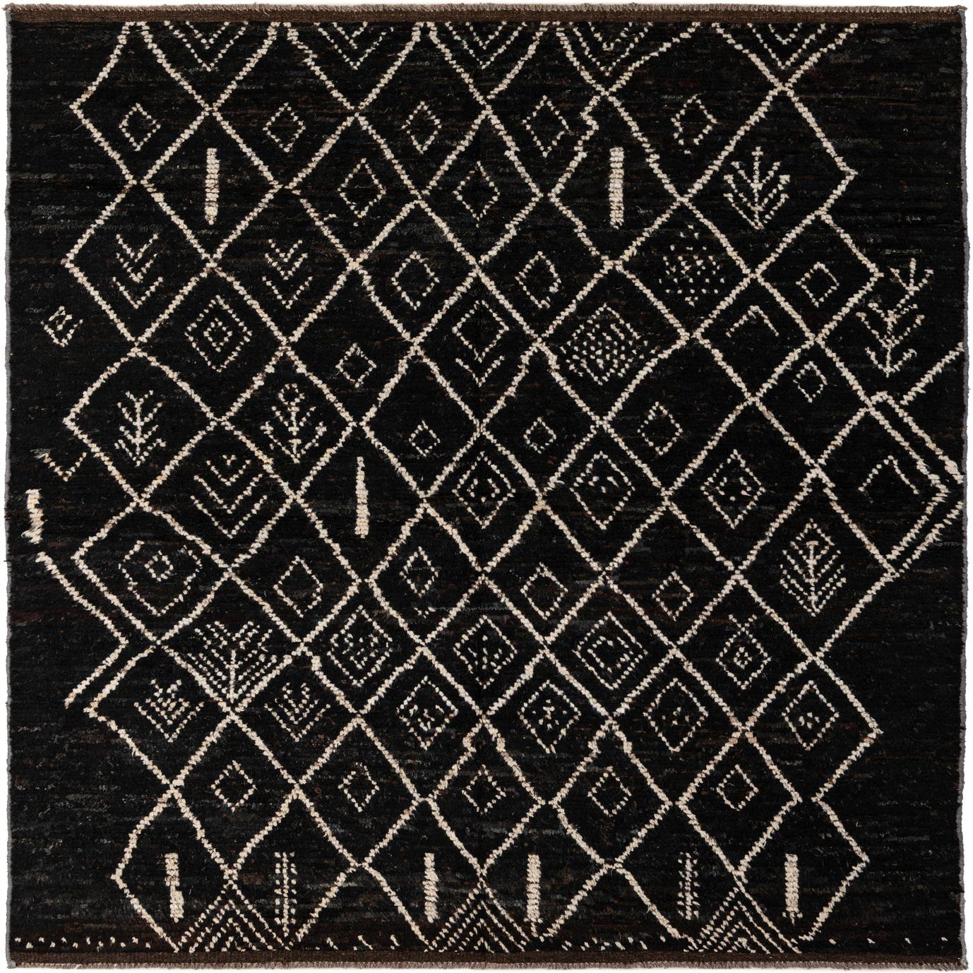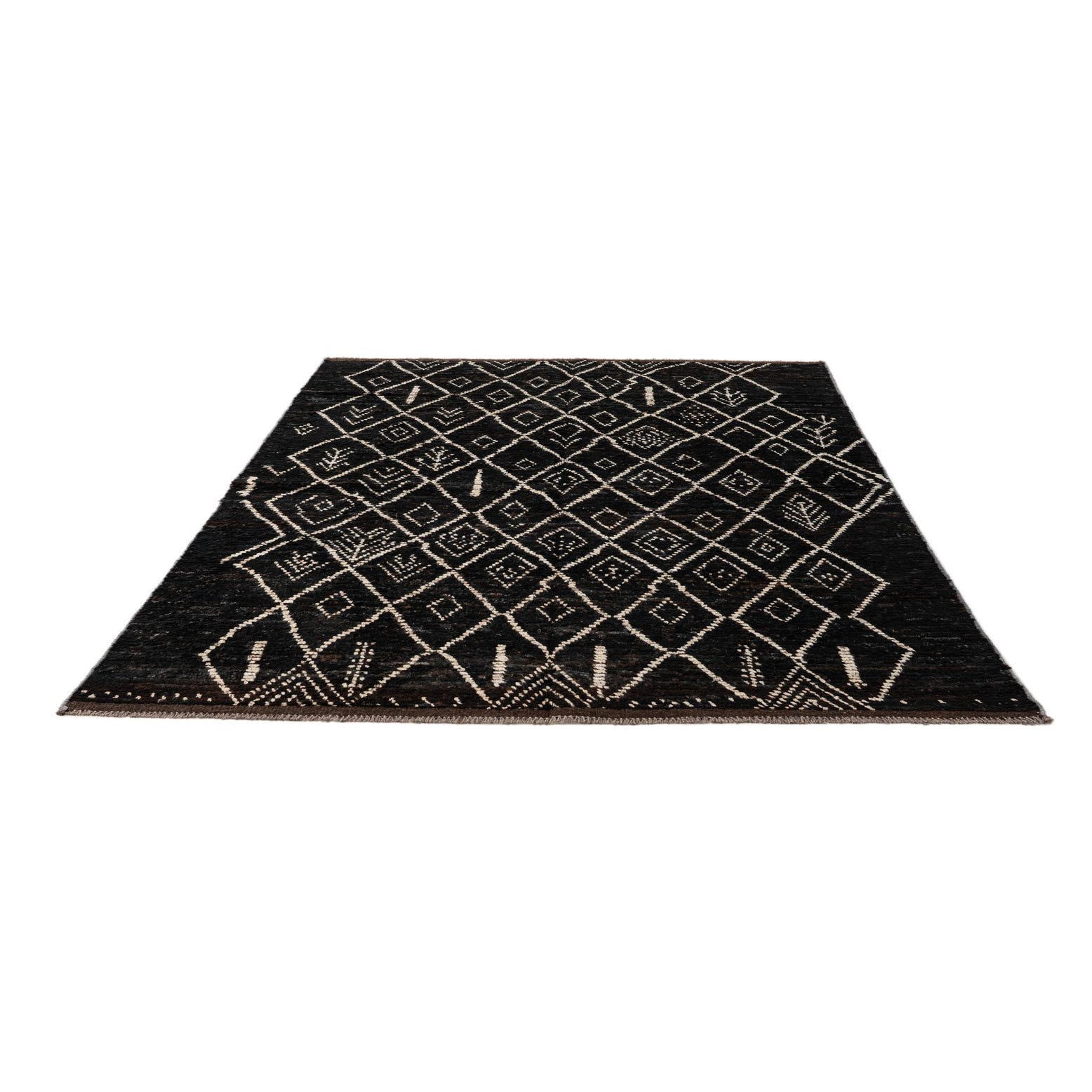 A 5x8 rectangular Moroccan tribal rug in dark brown with a diamond and abstract pattern in tan, suitable for a living room.