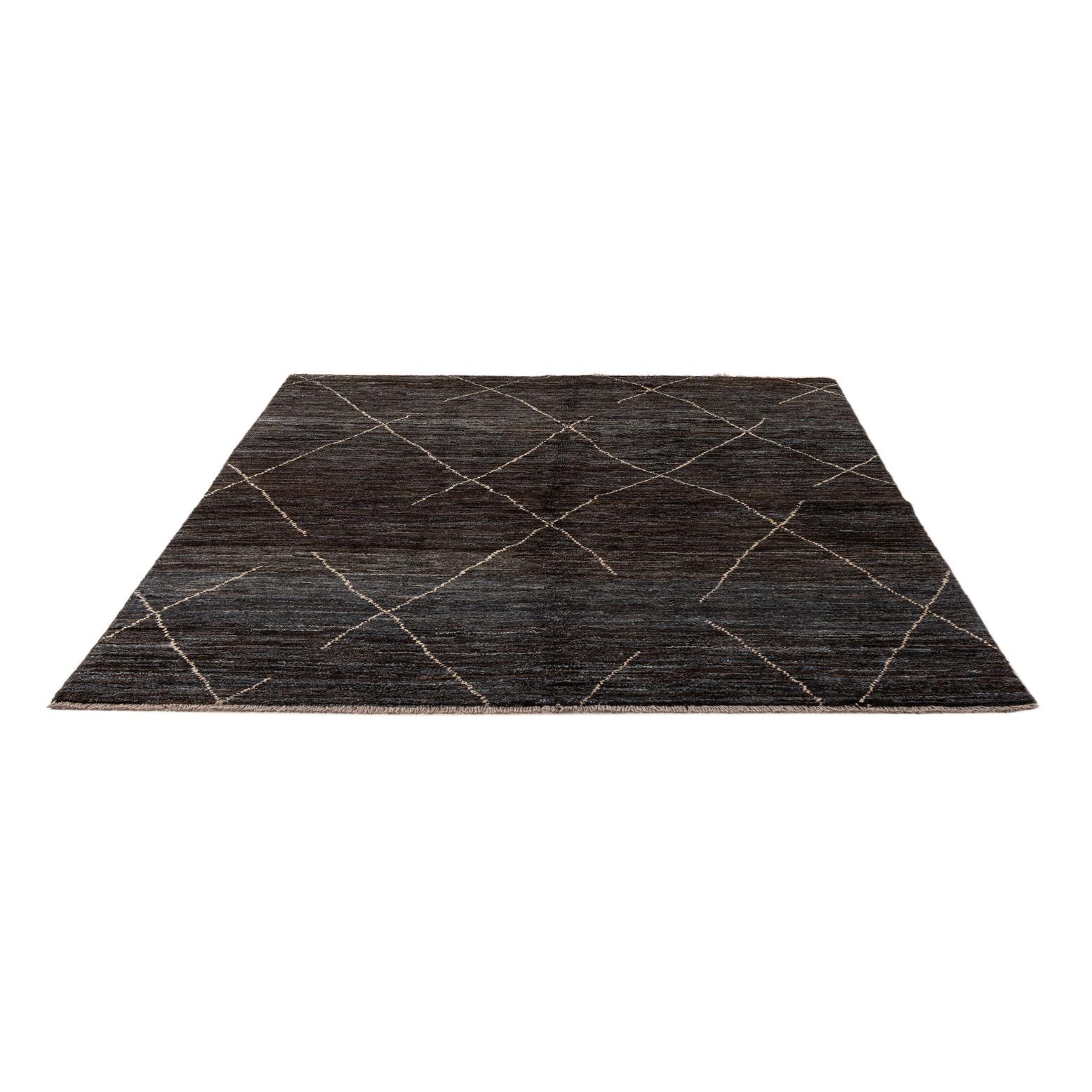 A 5x8 rectangular brown wool rug with a tribal modern diamond pattern in tan, suitable for a living room.