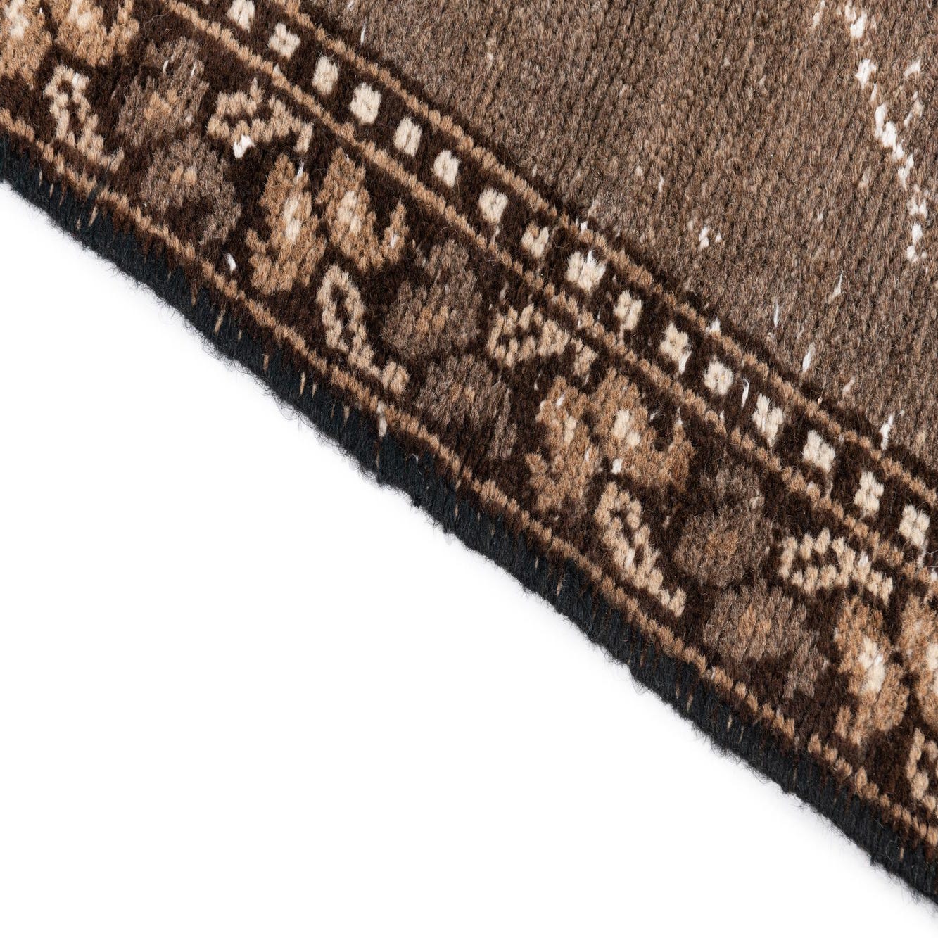 Primary color is Dark Brown. Colors in this rug include: Dark Brown, Ivory, Rust Red, Light Brown.