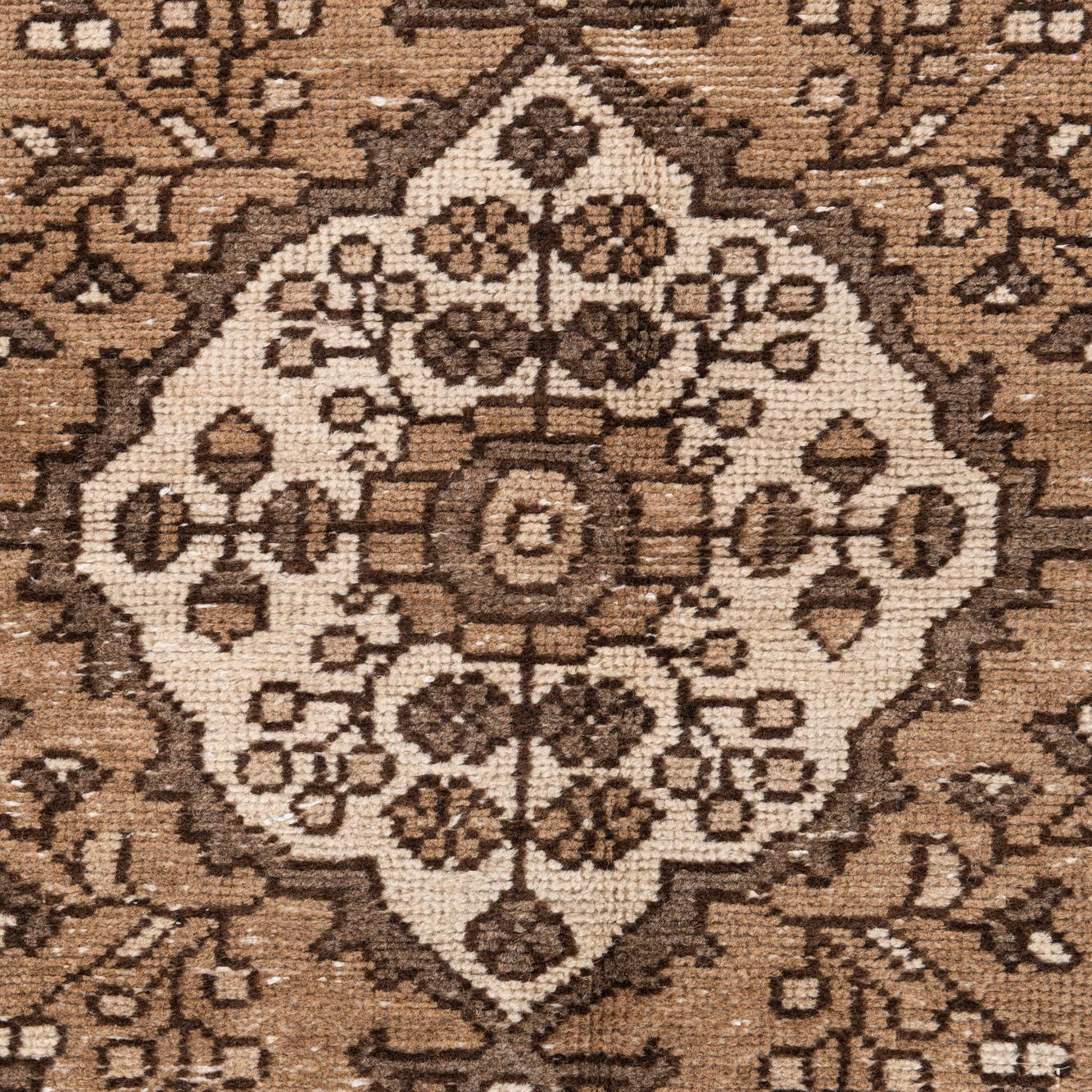 A central medallion and corner spandrels form a classic, Persian-inspired layout against a dark brown field. Ivory details and rust-red accents sit within light- and medium-brown motifs, creating layered contrast without bright colors. A narrow floral vine border in darker brown frames the composition, while intentional distressing and subtle abrasing lend a lived-in, vintage character to the pattern.
