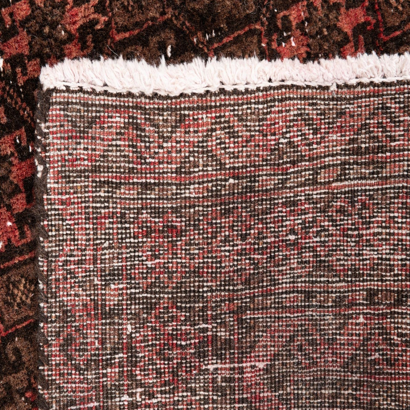 The Ultra Vintage collection presents a 6 Ft Runner that showcases a deep, rich color palette with dark brown as the dominant background color, complemented by brown and burgundy accents. This hand-knotted piece is crafted of 100% wool, offering both durability and a naturally plush texture.