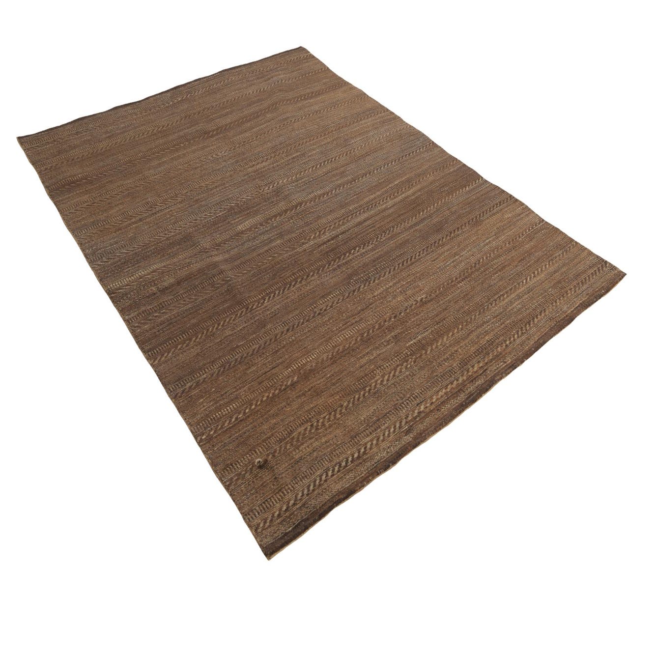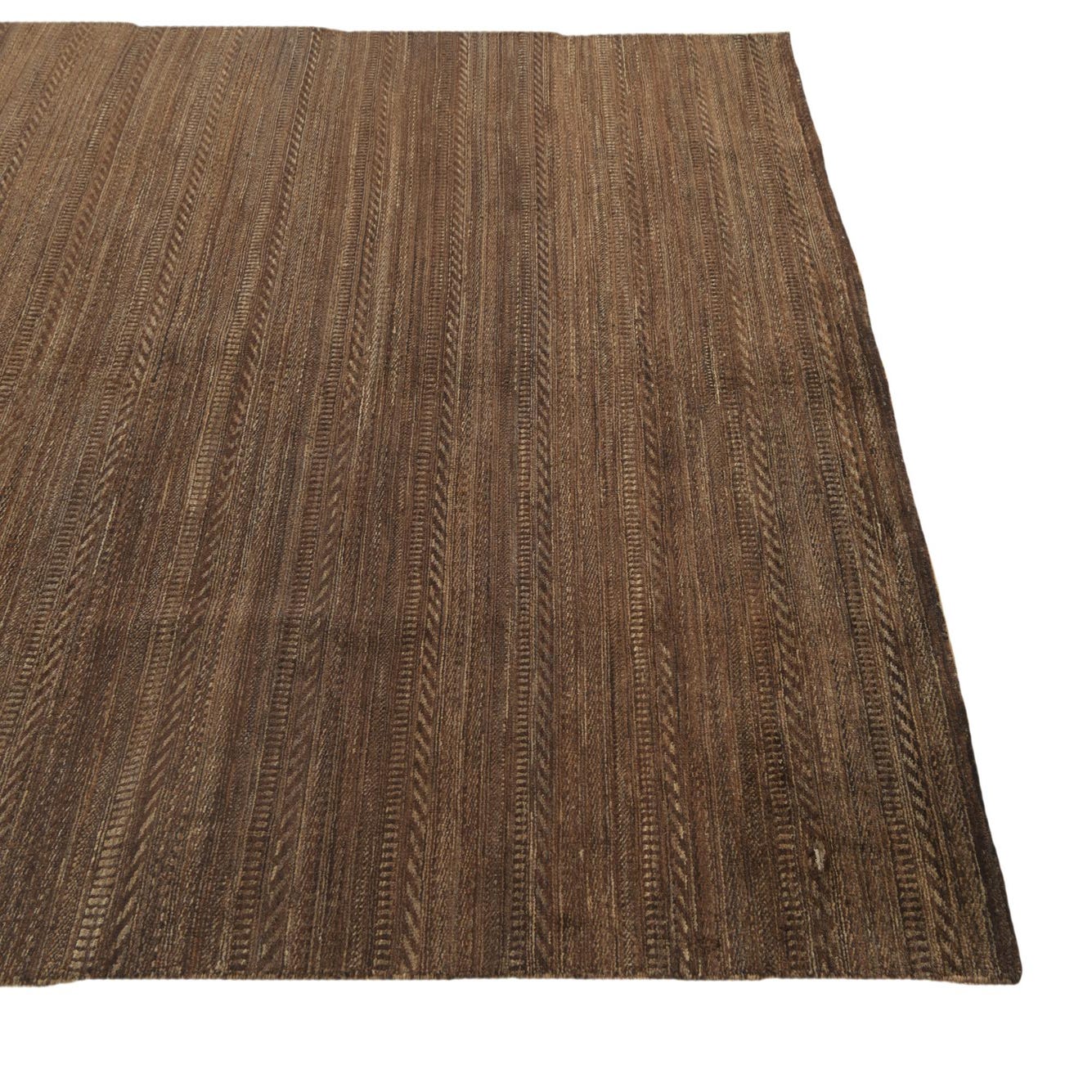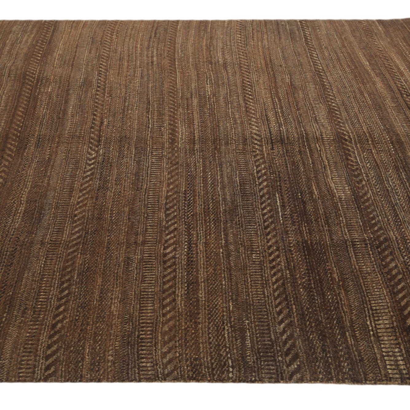 A 6x9 rectangular Kashkuli Gabbeh rug in varying shades of brown with horizontal stripes and subtle geometric patterns.