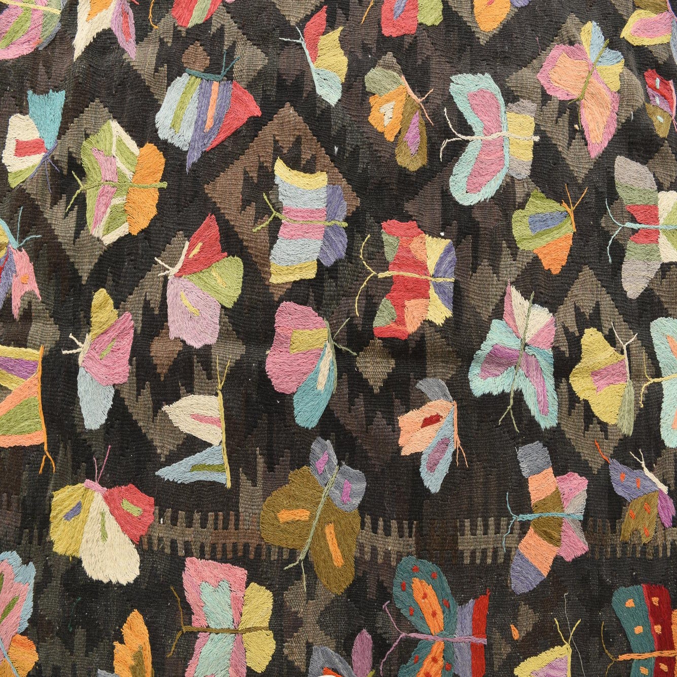 A 6x9 rectangular Kilim Suzani rug featuring a dark brown tribal pattern background with numerous colorful embroidered butterflies.